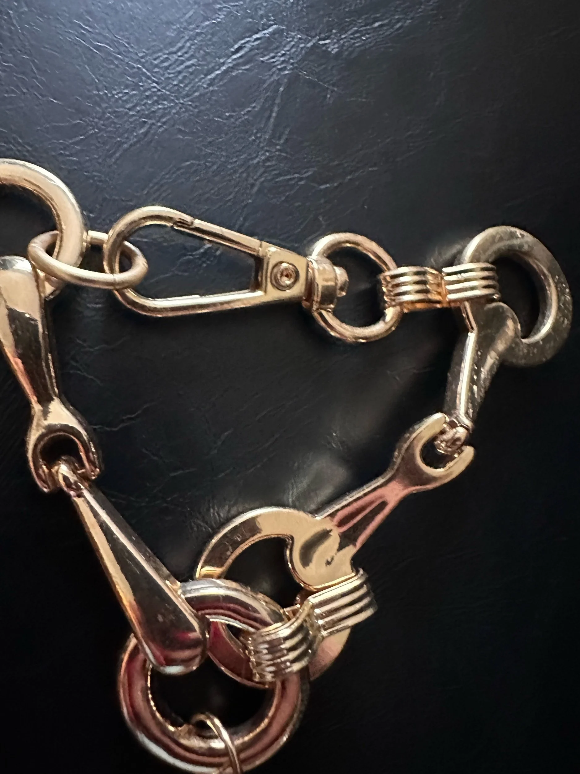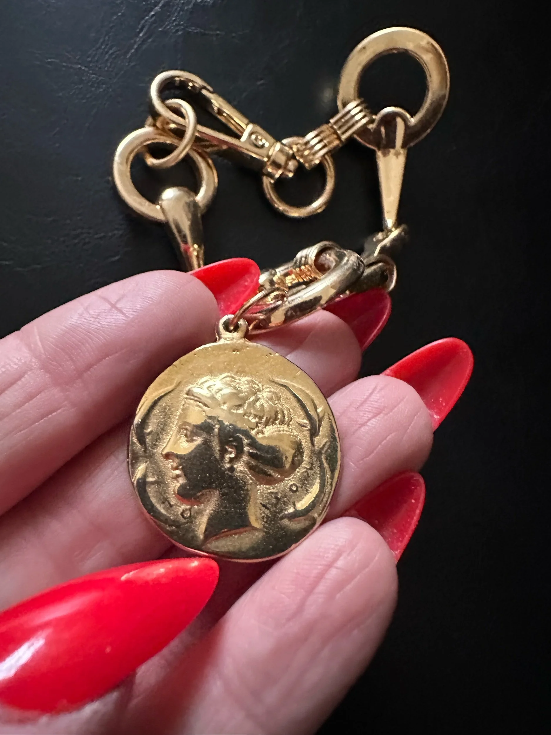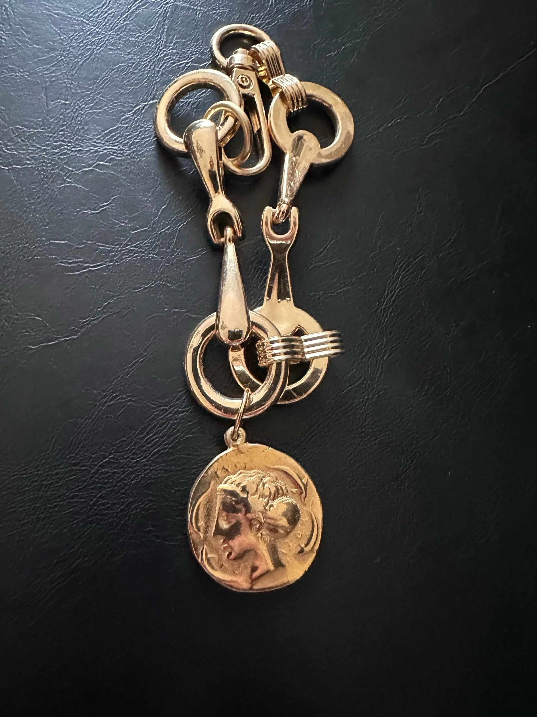 Deconstructed belt from late 80’s. Vintage golden coin added. Spring clasp. Gorgeous and unique. Handmade by Kessley.