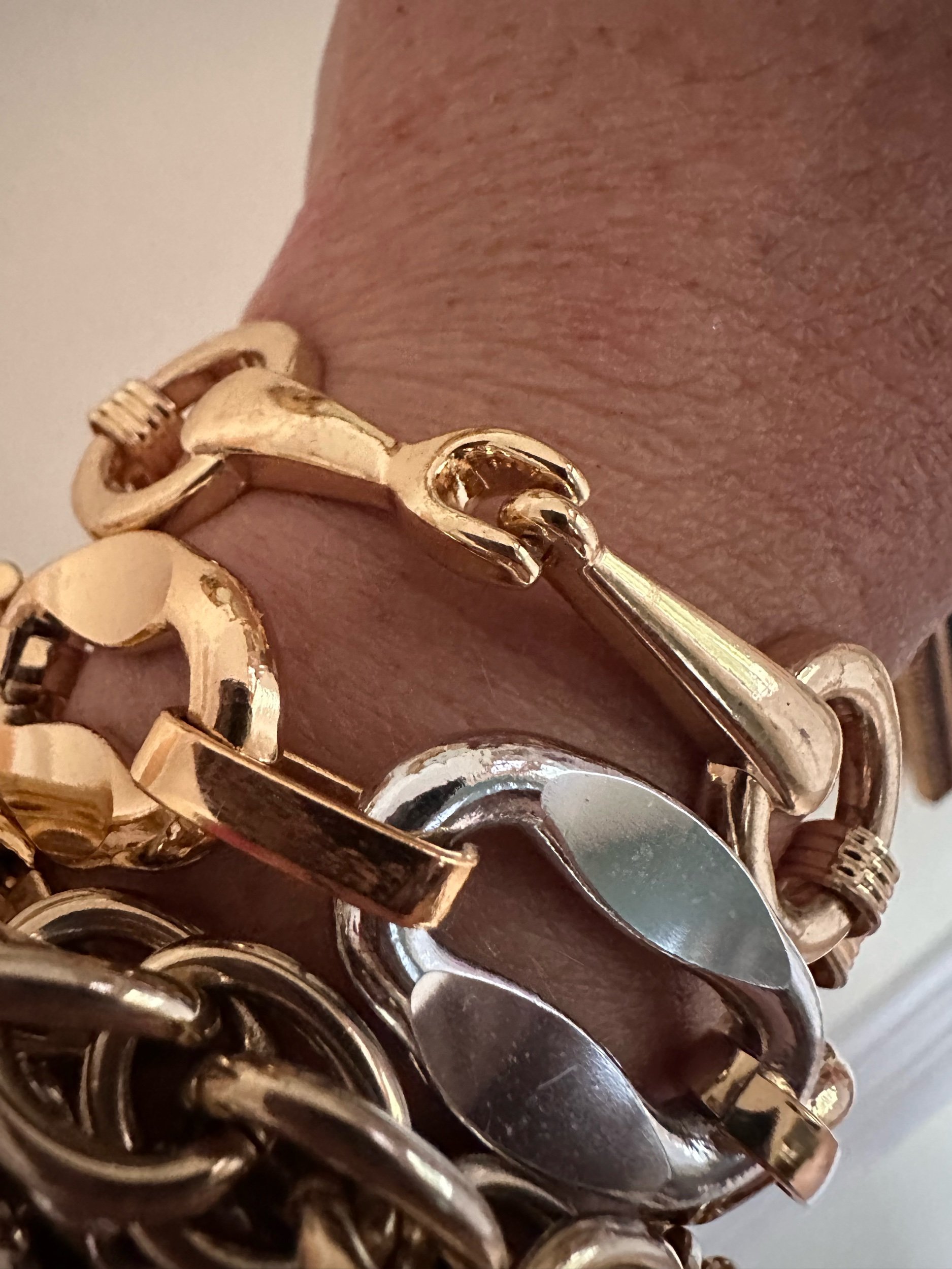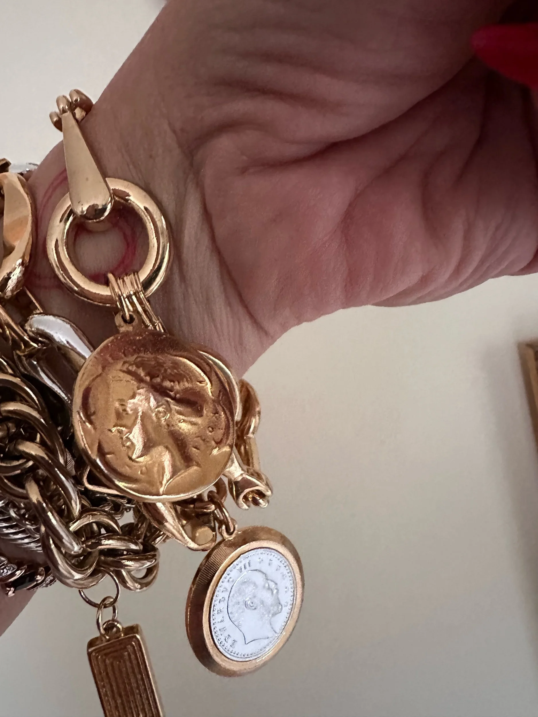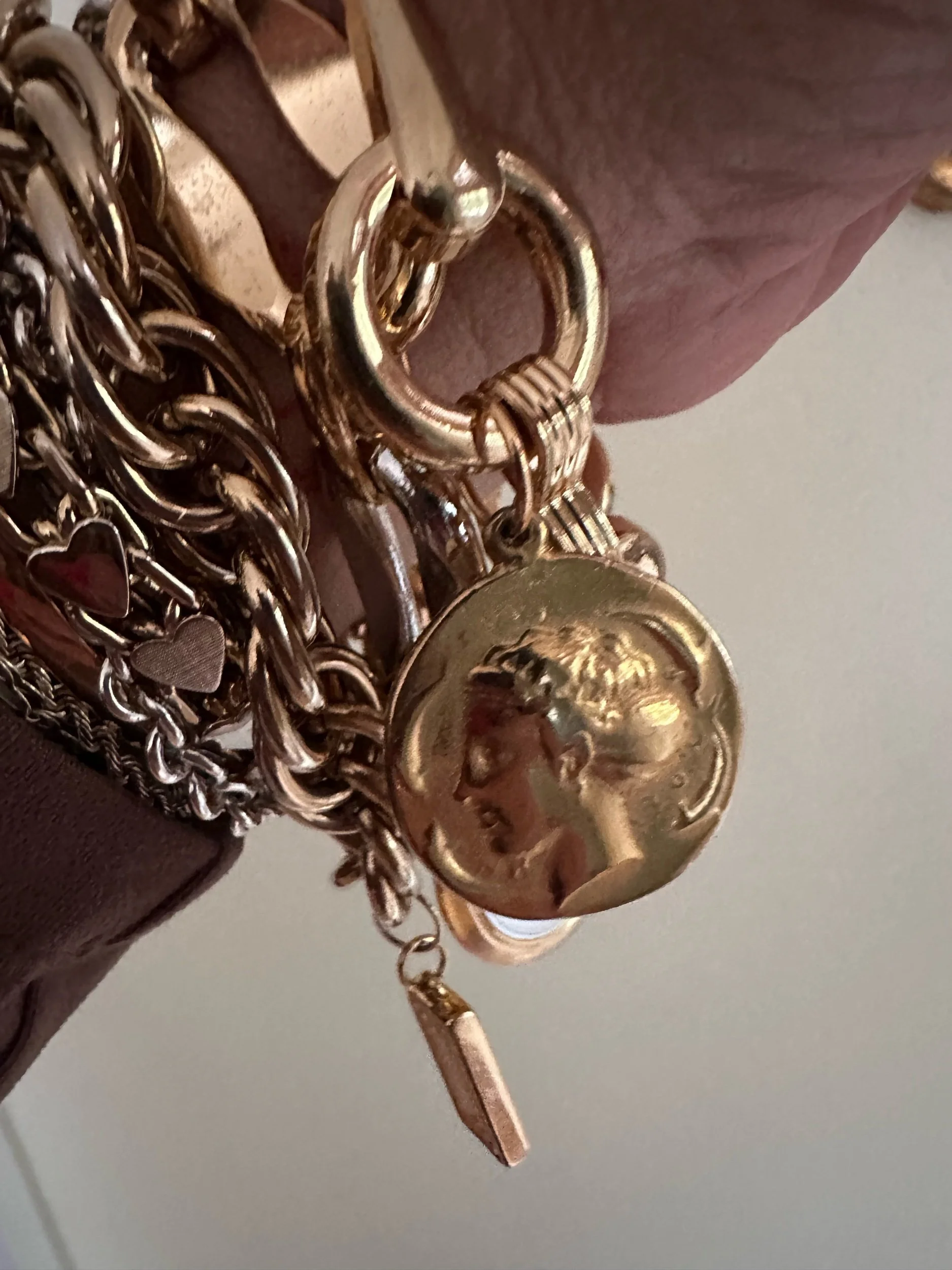 Deconstructed belt from late 80’s. Vintage golden coin added. Spring clasp. Gorgeous and unique. Handmade by Kessley.