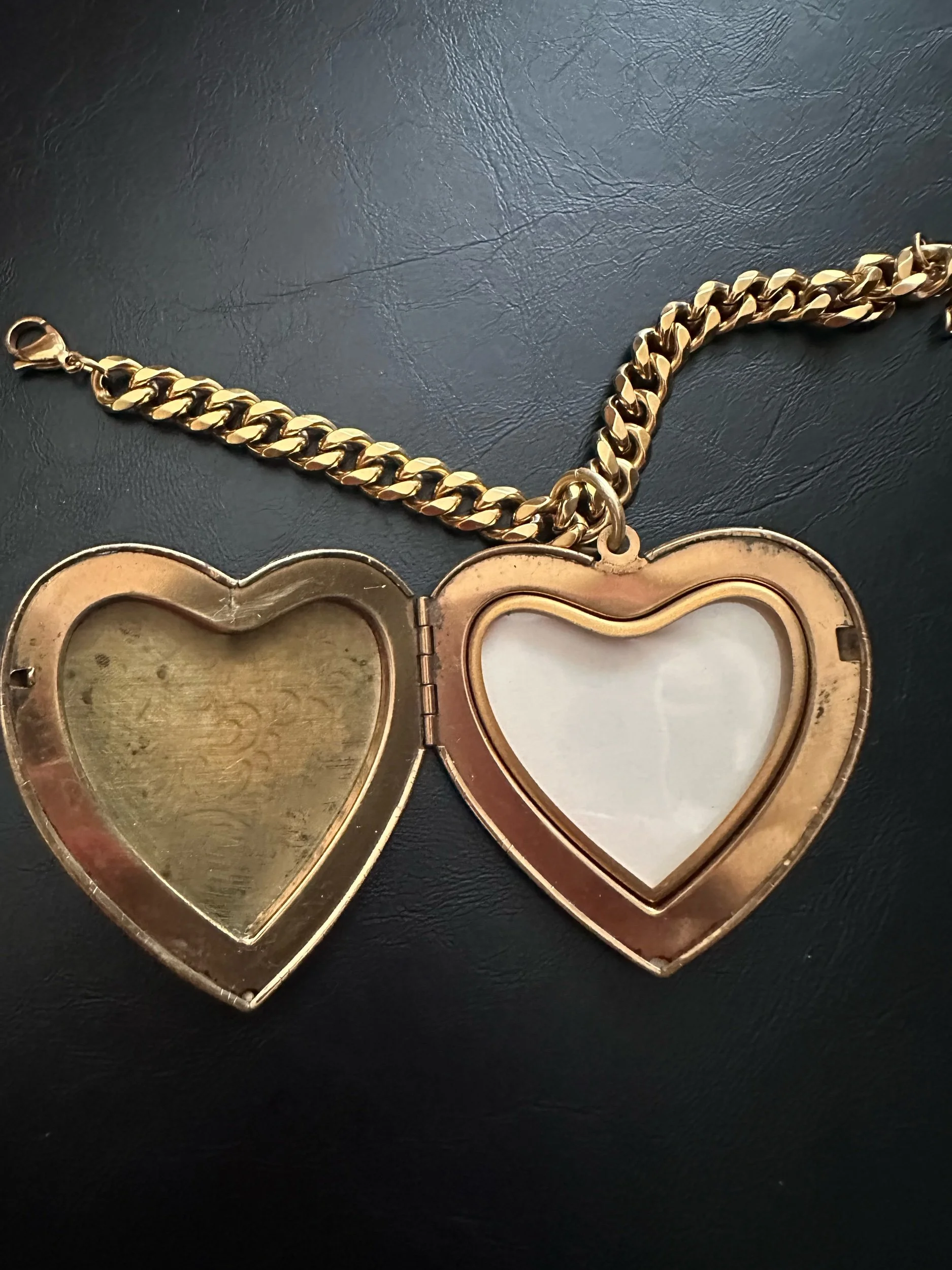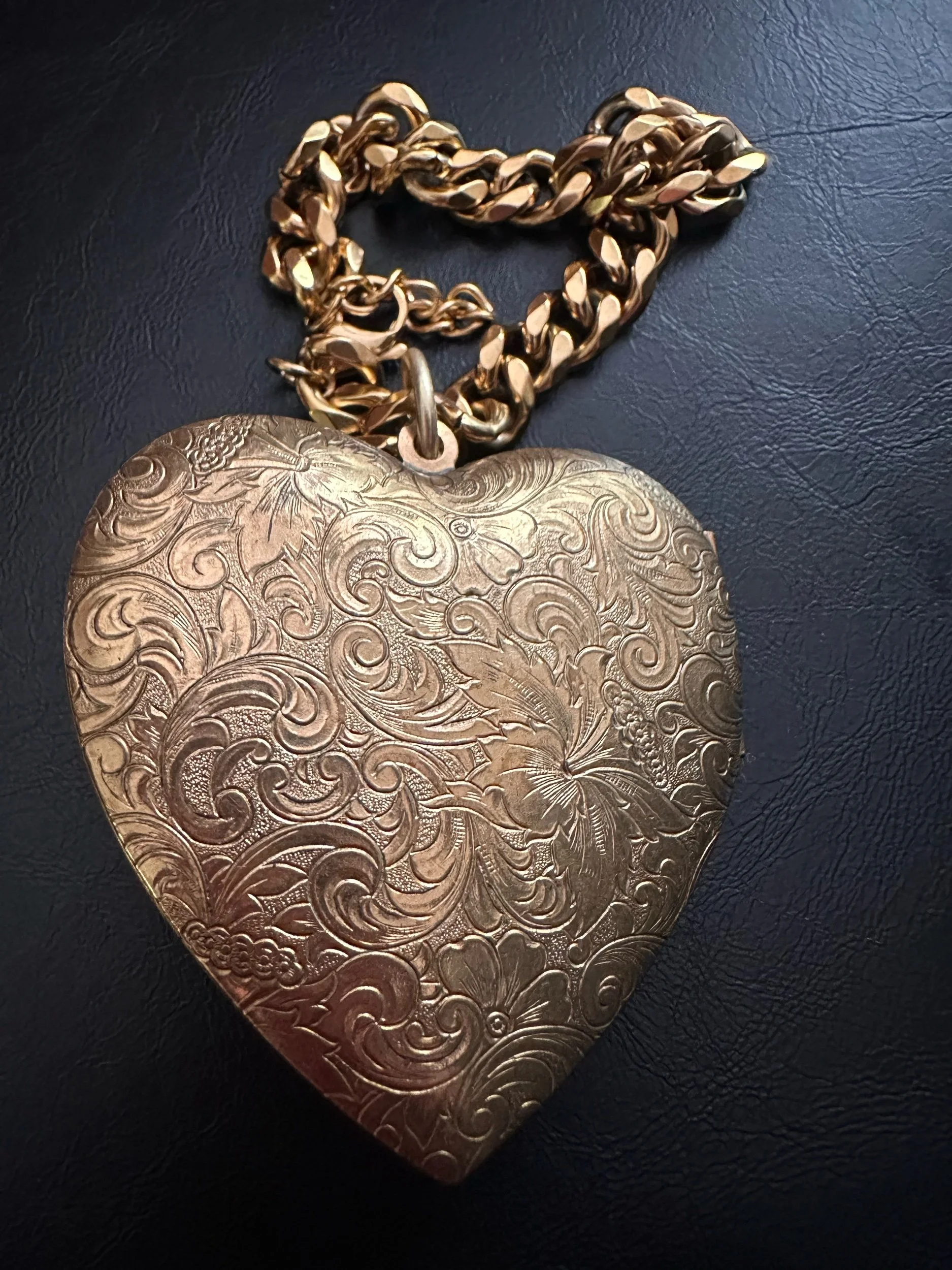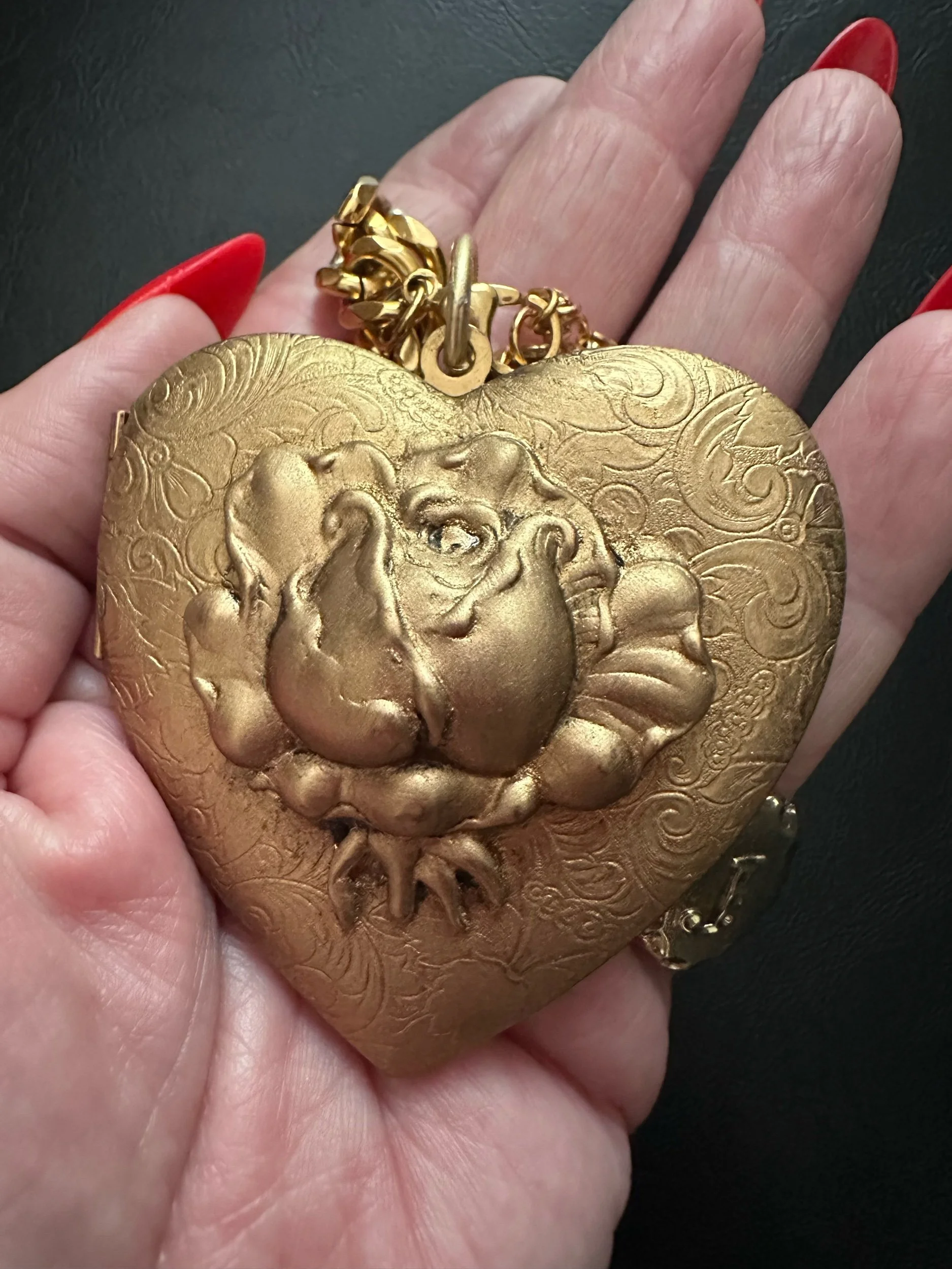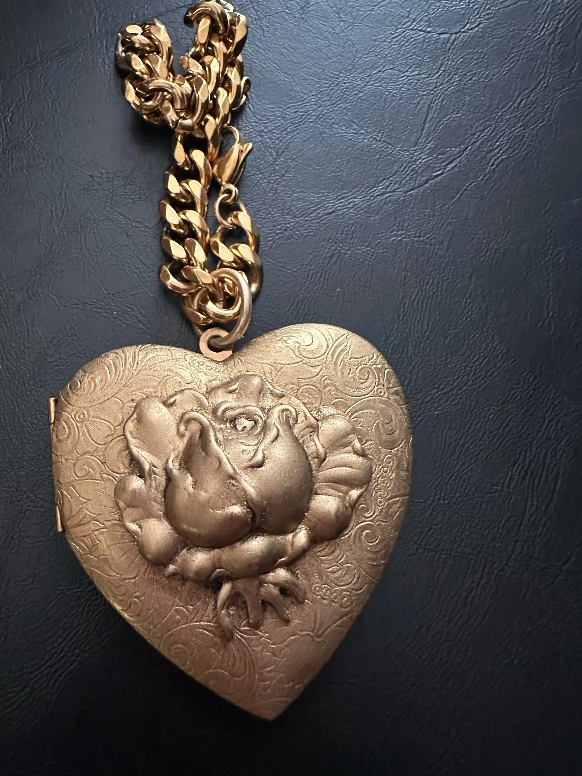 For rhe clang clang girl ONLY. Golden plated curb chain with a FEROCIOUS pendant. Huge heart locket Kessley found + restored. Locket opens and closes with a click. Pendant has an unusual floral design.