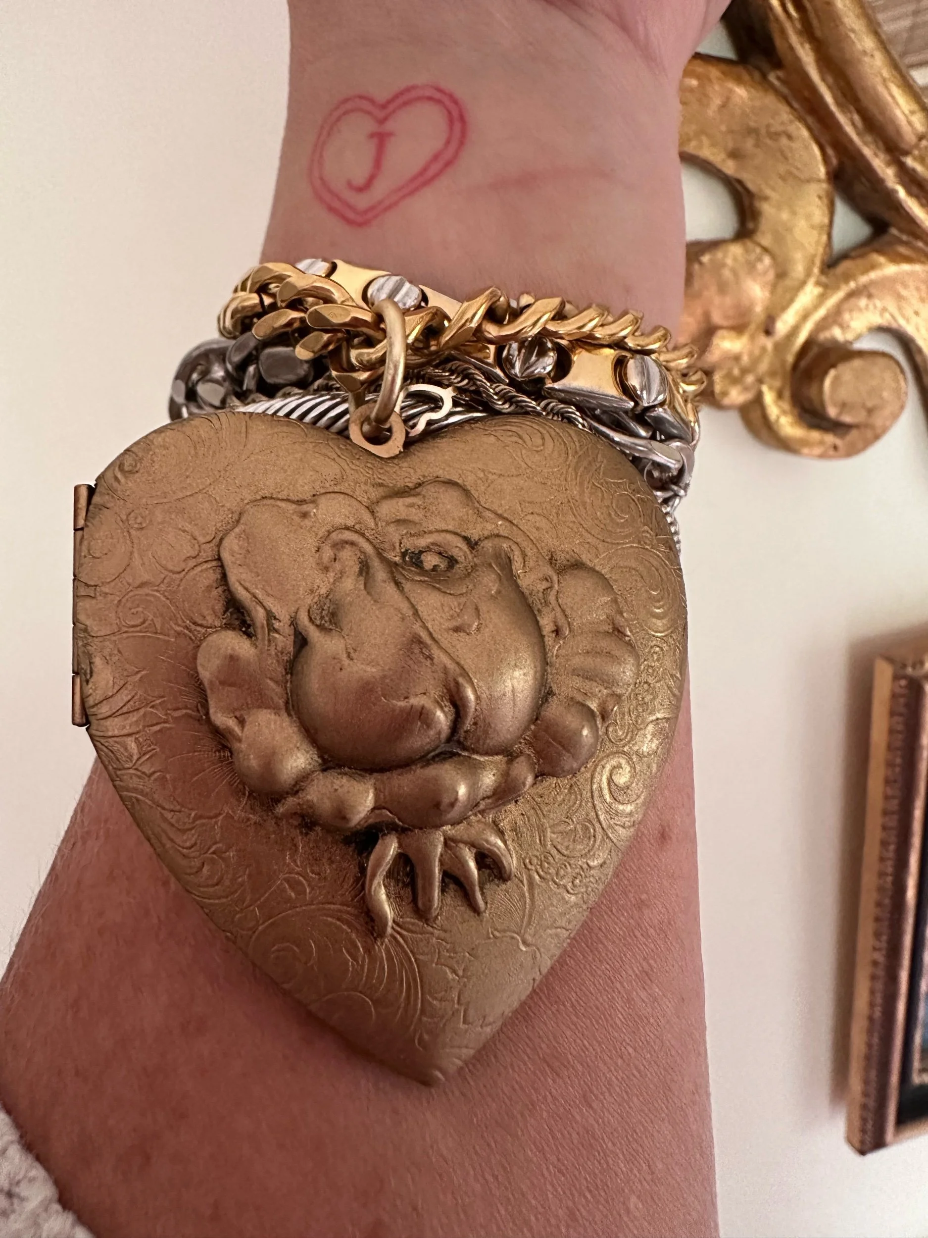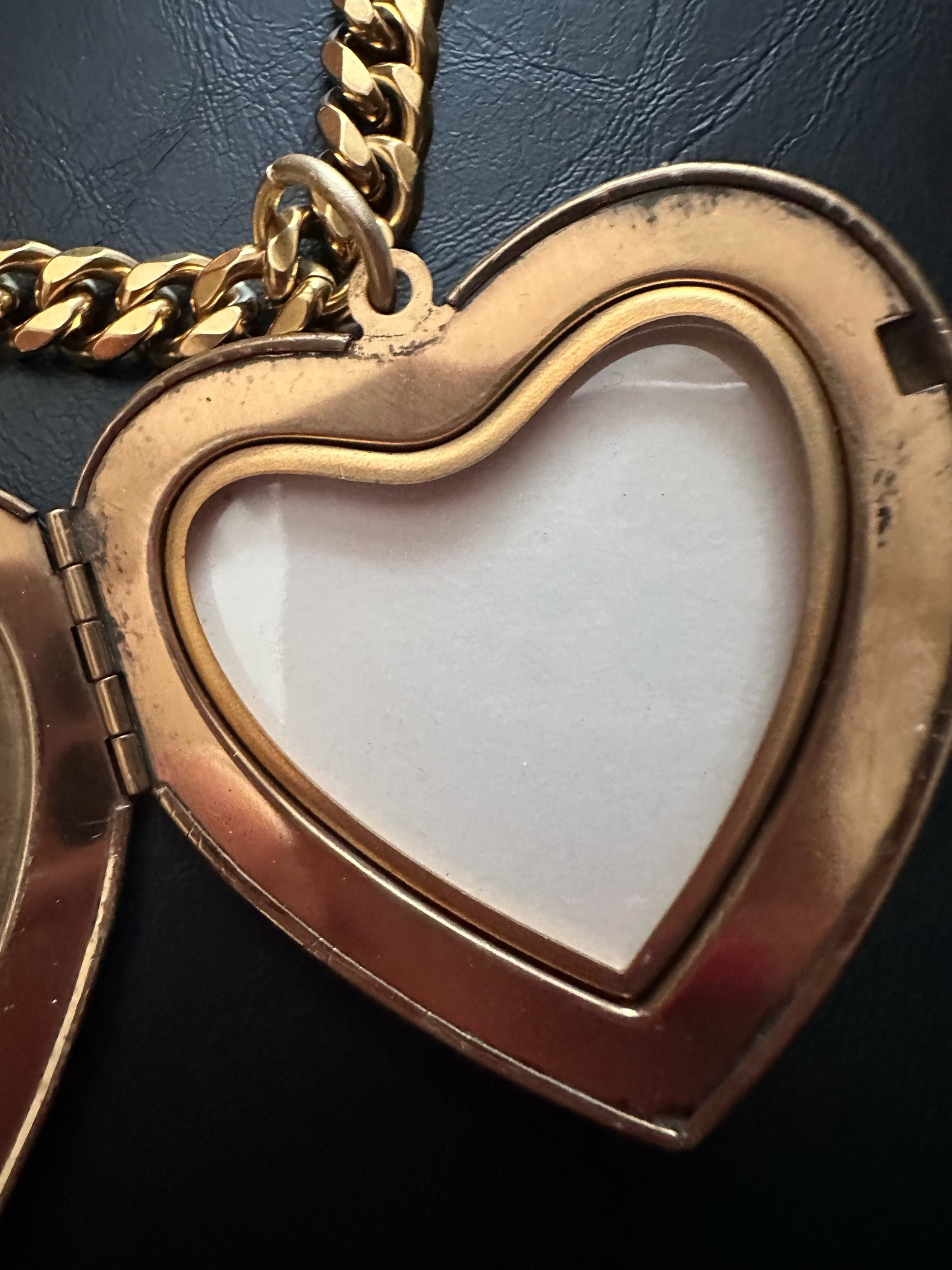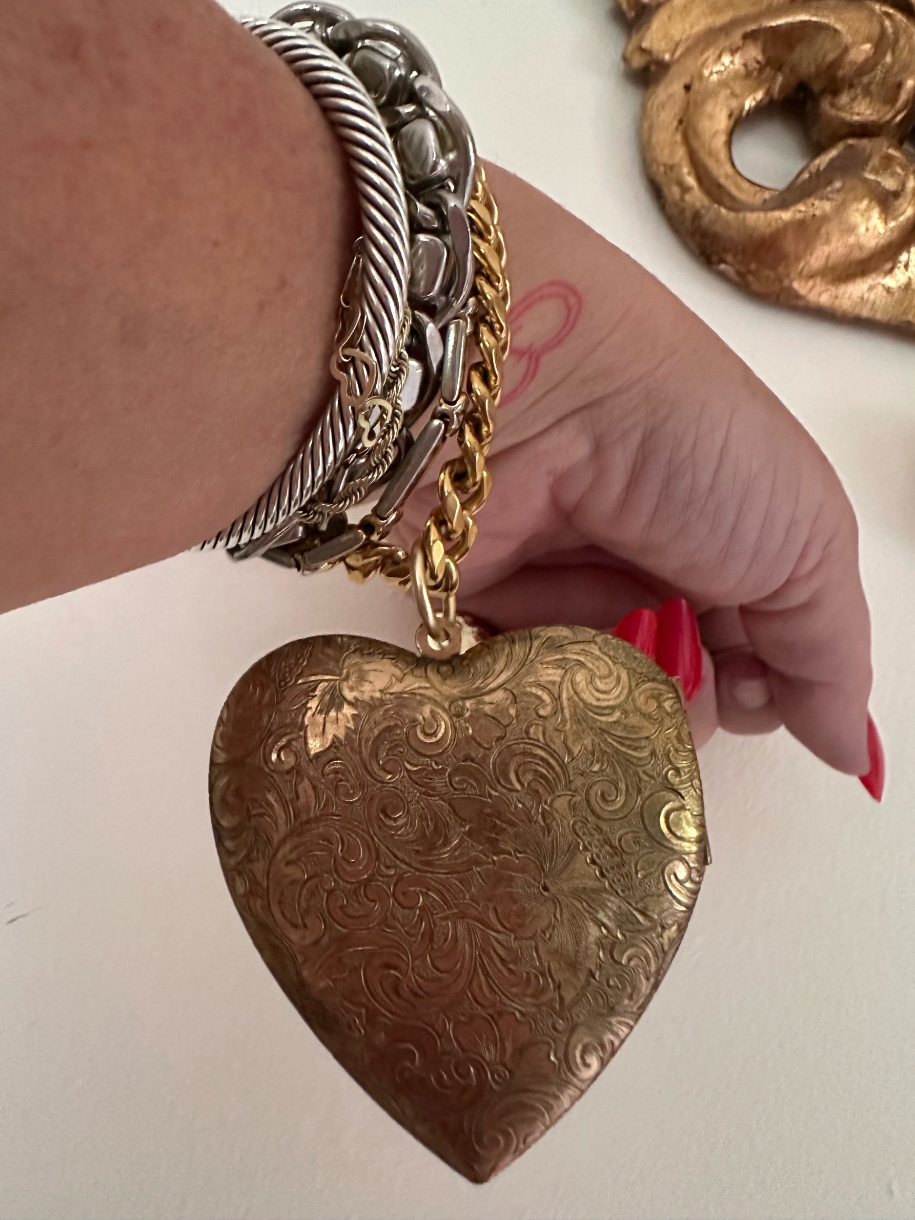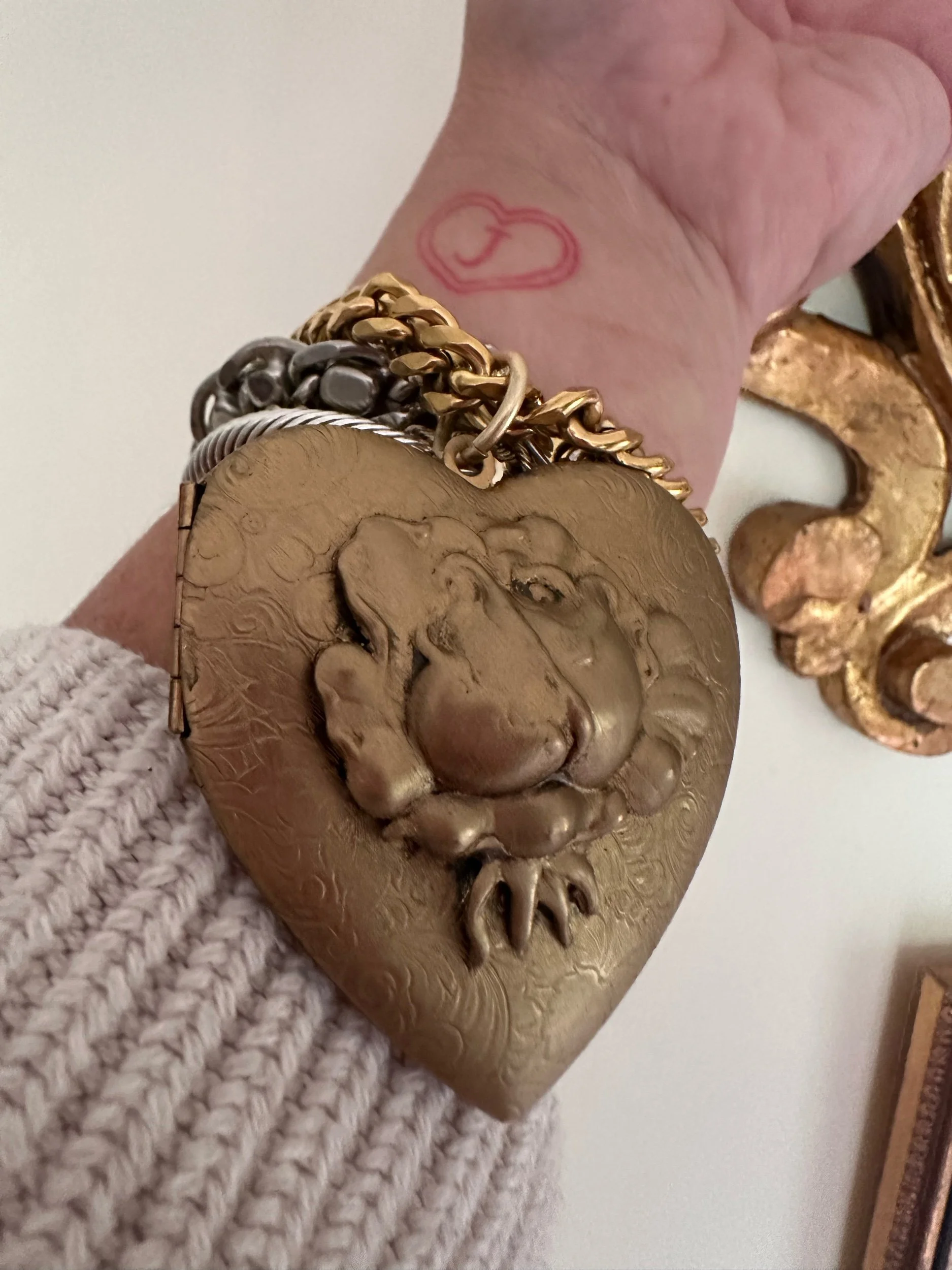 For rhe clang clang girl ONLY. Golden plated curb chain with a FEROCIOUS pendant. Huge heart locket Kessley found + restored. Locket opens and closes with a click. Pendant has an unusual floral design.