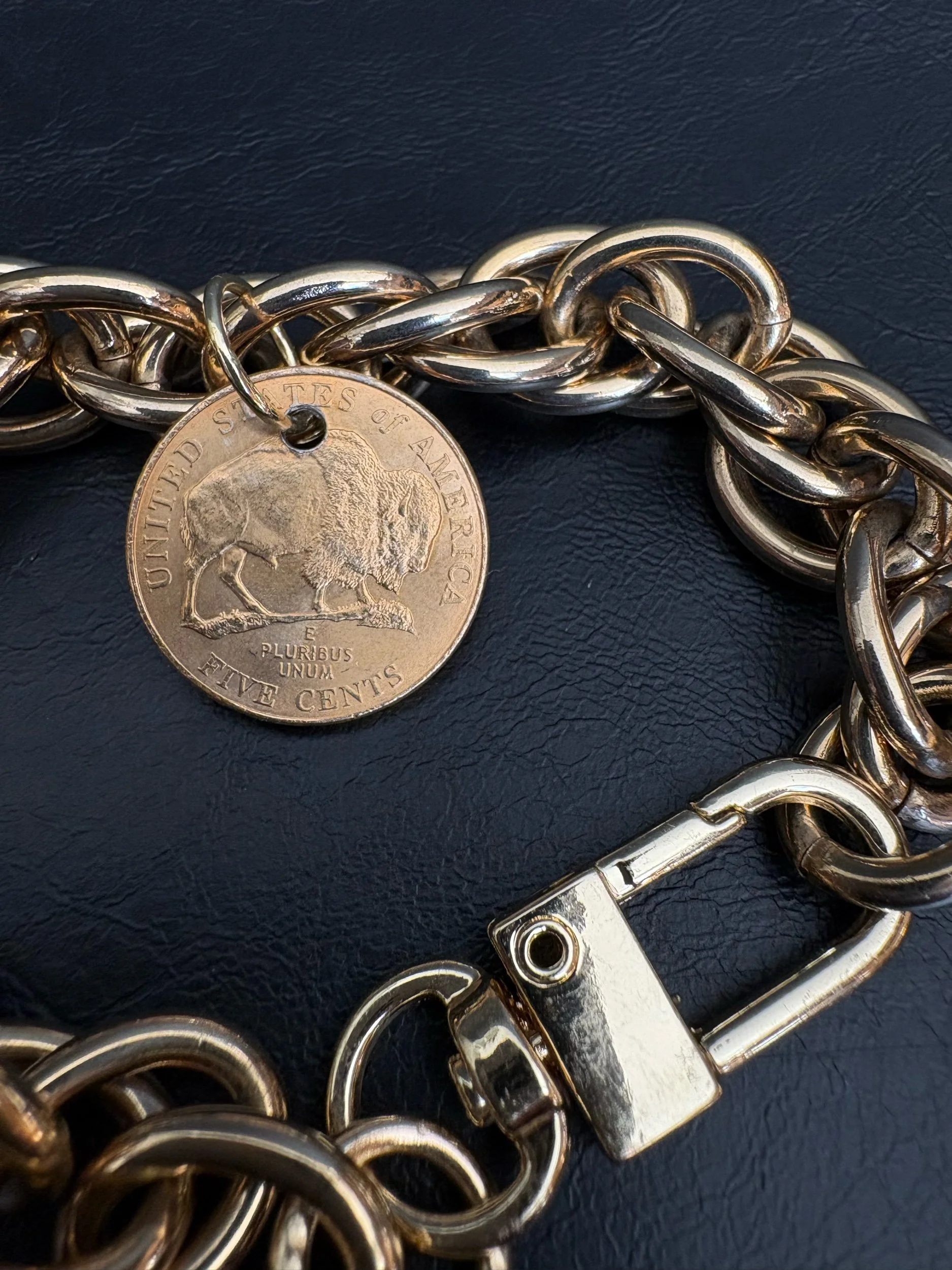 Beautiful double link vintage bracelet made by Kessley. Originally a necklace Kessley has repurposed this into a wrist candy moment and added a gold plated buffalo coin. Industrial modern closure / Easy on + off.