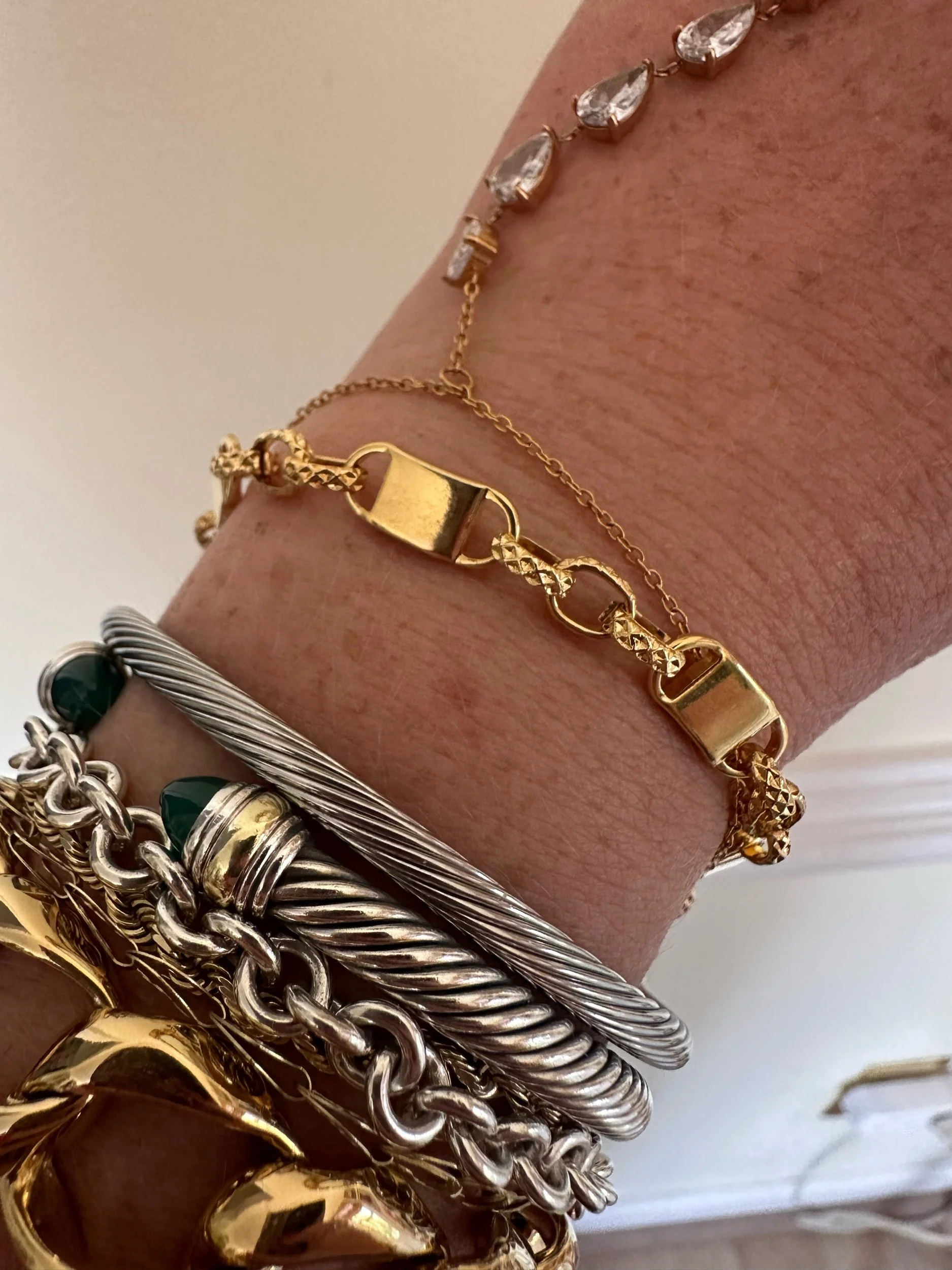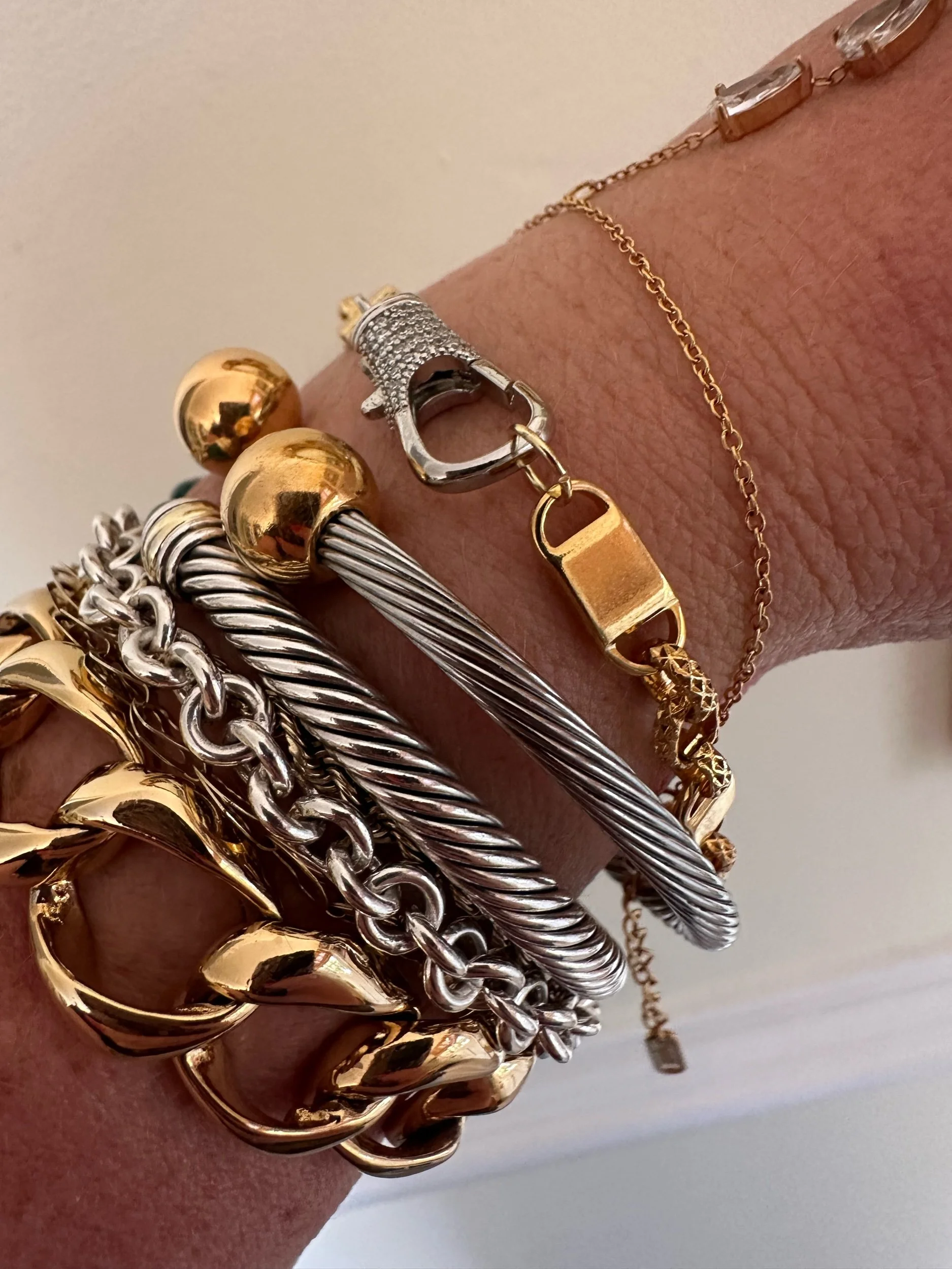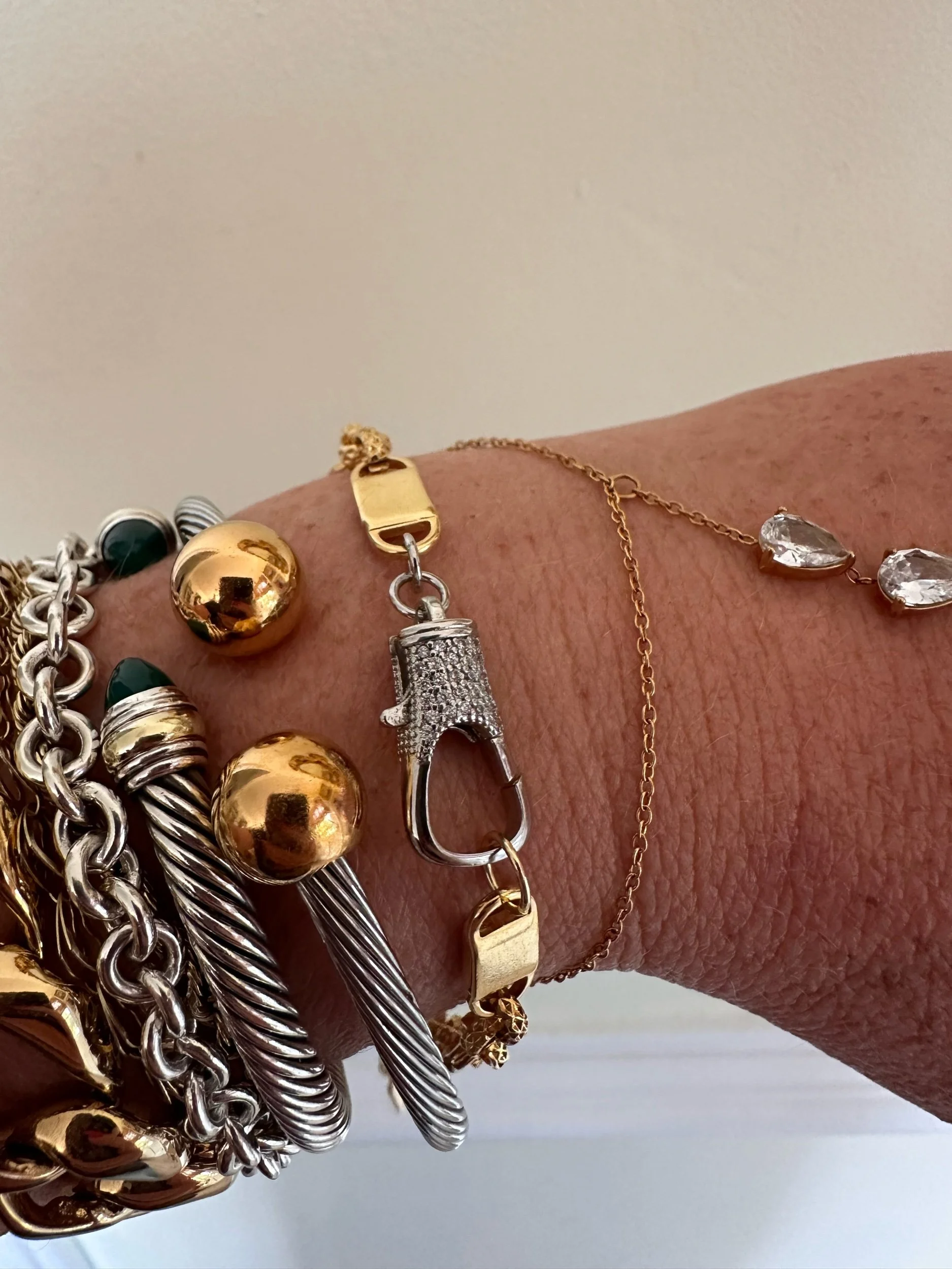Beautiful mixed metal bracelet. The perfect stacking piece. Bracelet has oversized, silver Pavé encrusted lobster class and gold tone bar stations.