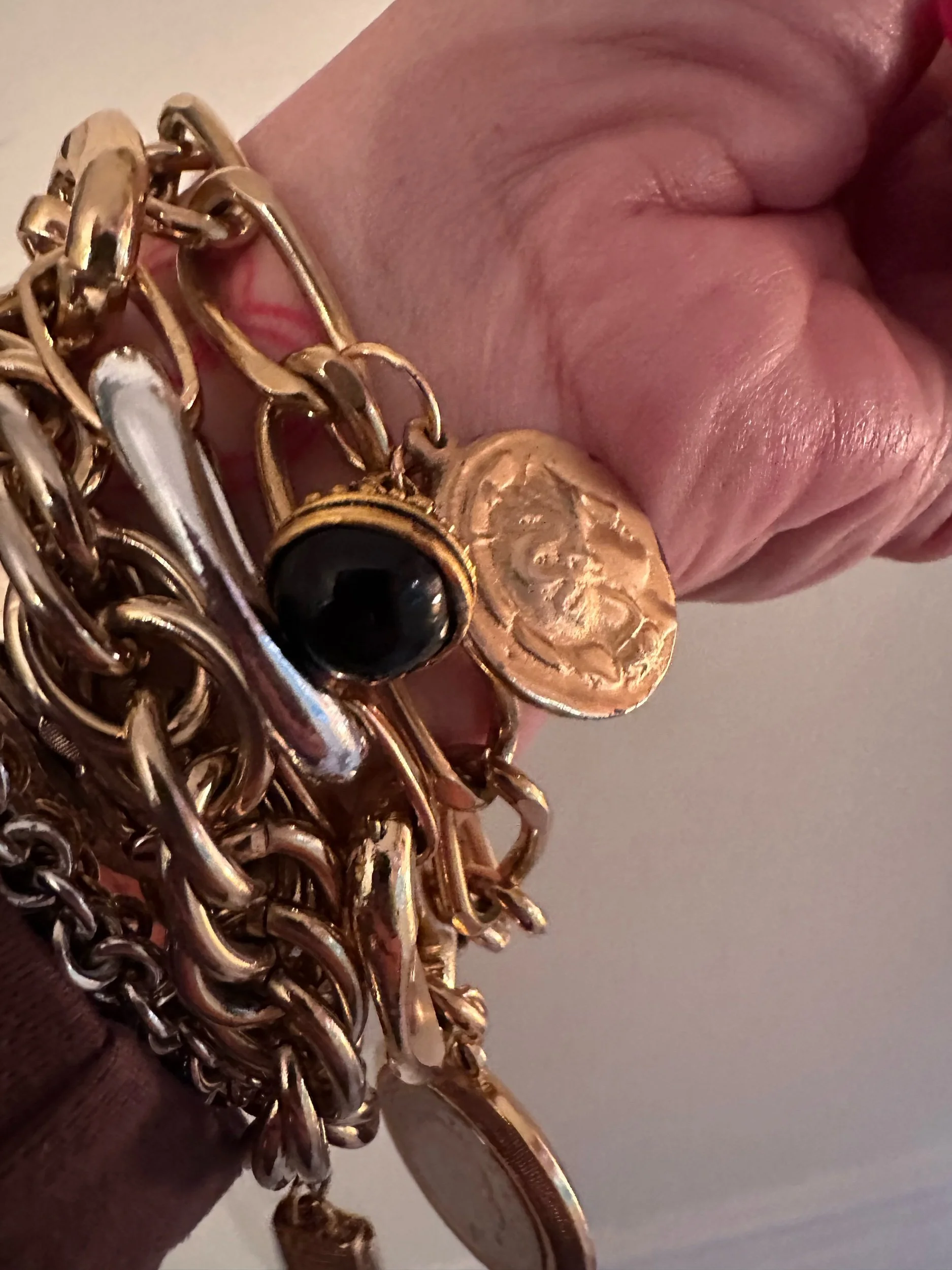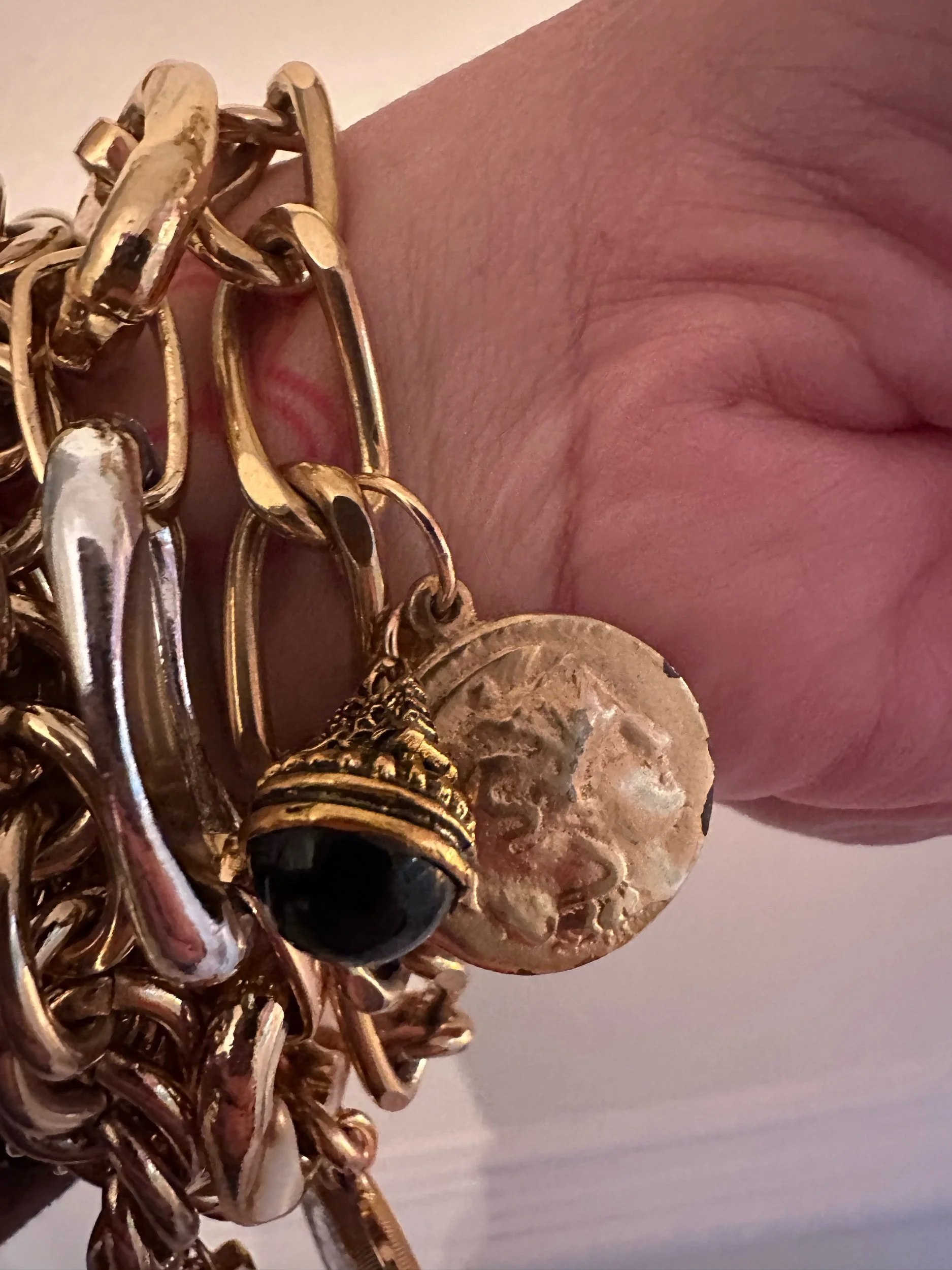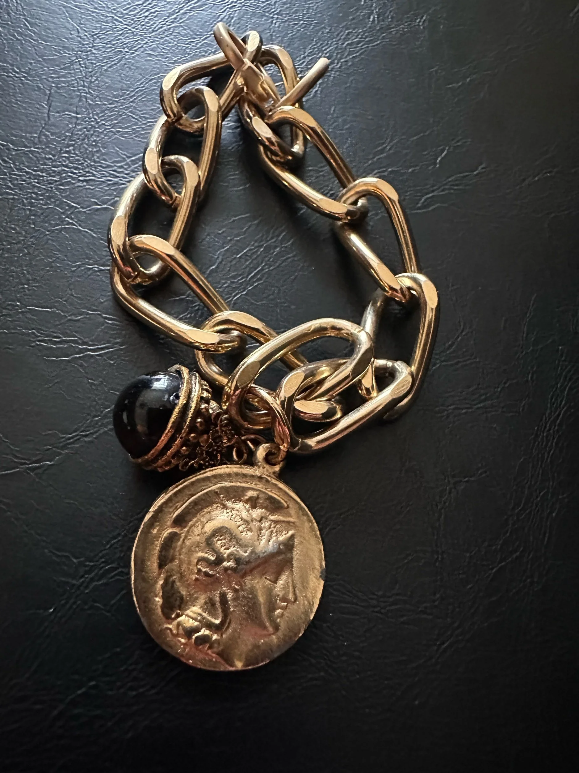 Gorgeous bracelet. Thick vintage links that were once a necklace. Vintage Elements dangle. A Spartan coin (size of a nickel) + black faab.