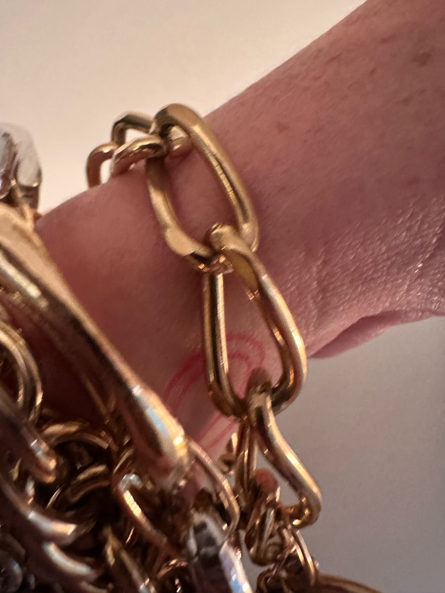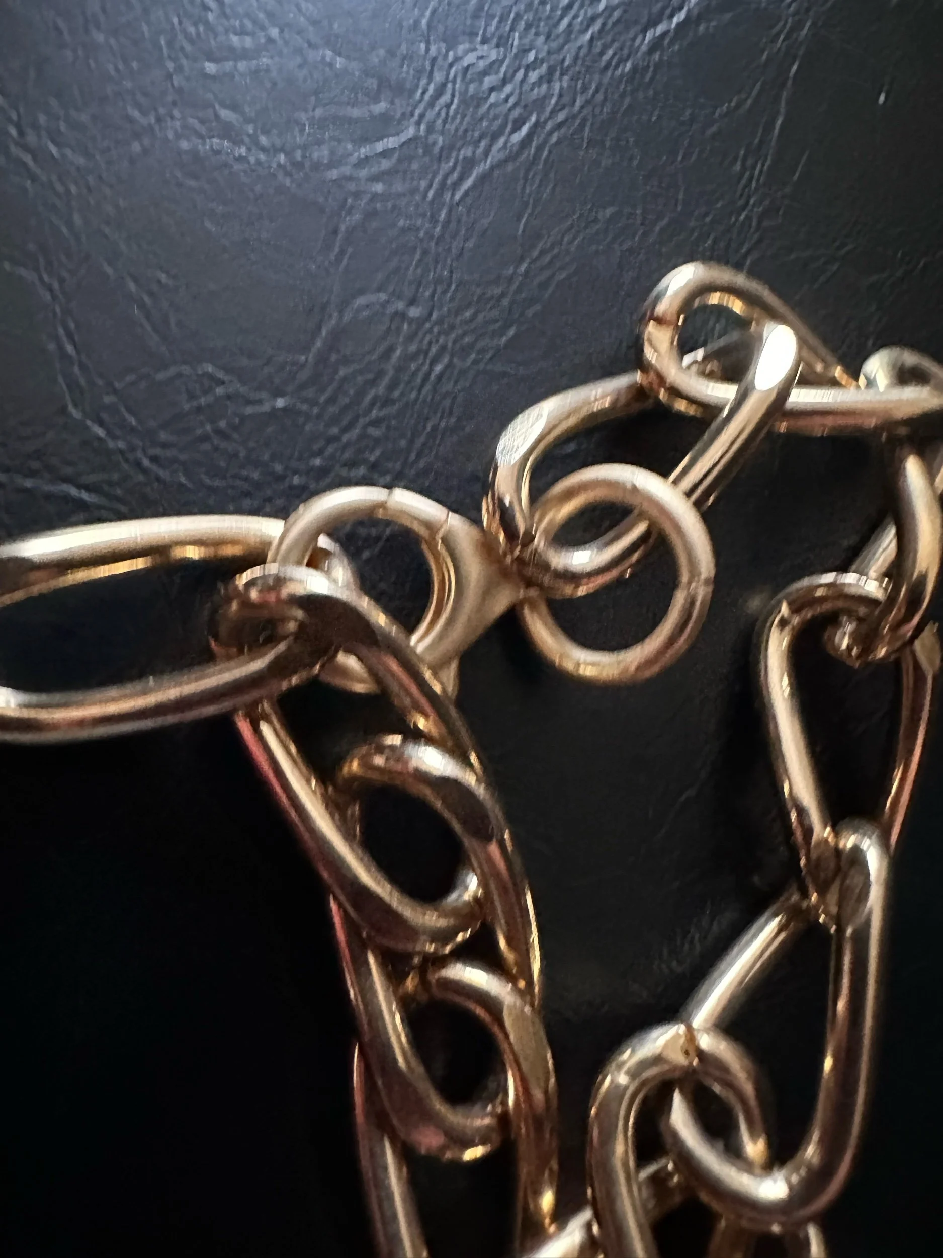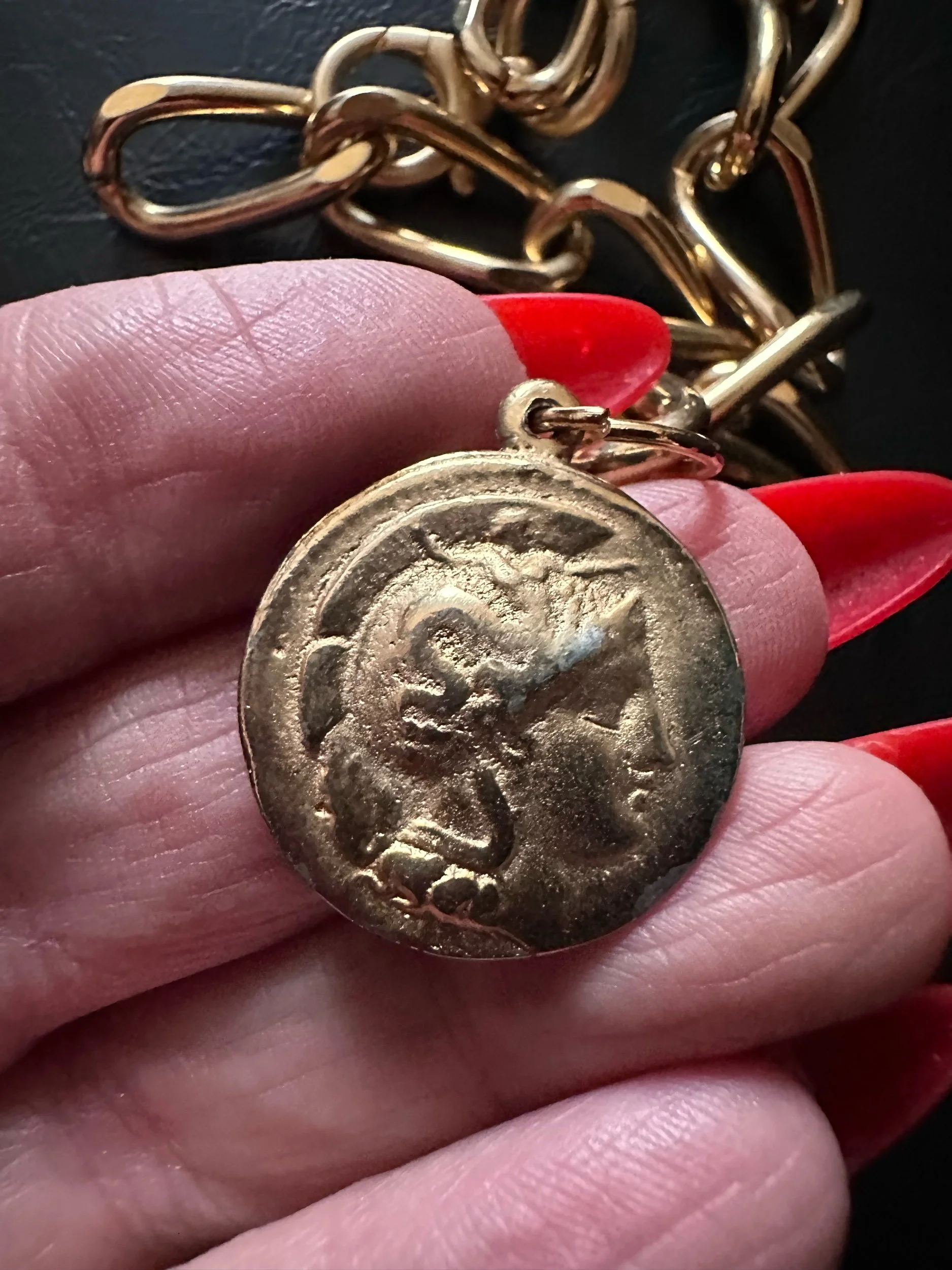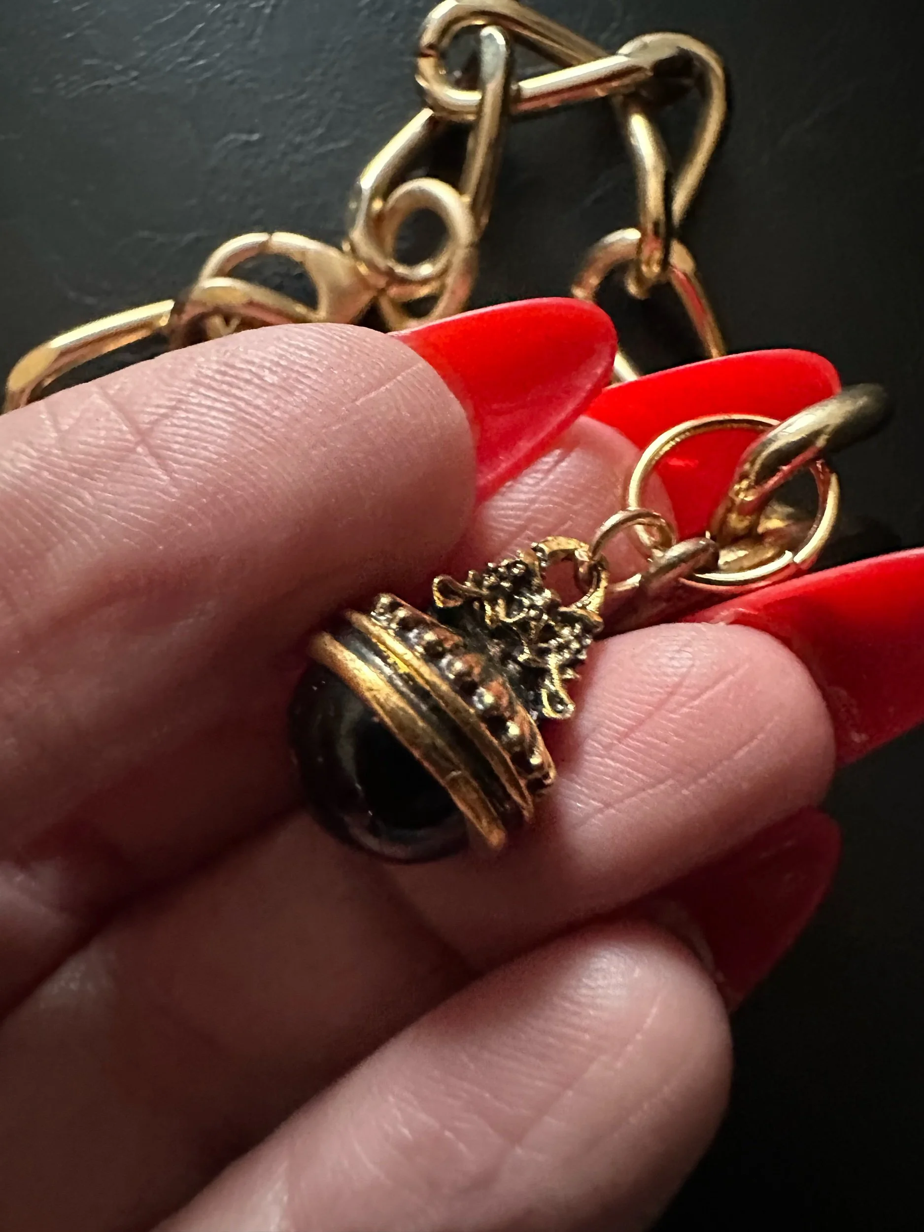 Gorgeous bracelet. Thick vintage links that were once a necklace. Vintage Elements dangle. A Spartan coin (size of a nickel) + black faab.