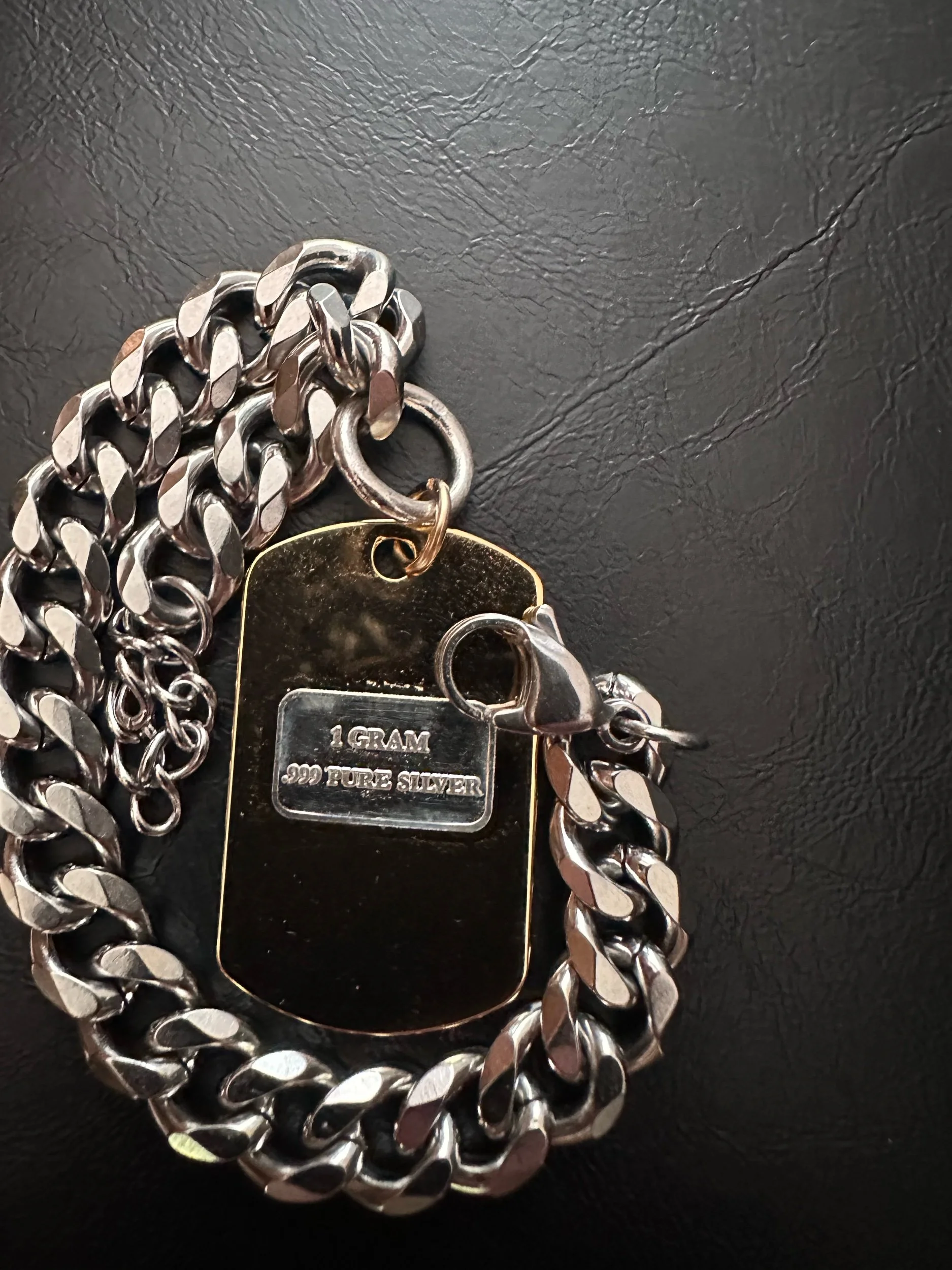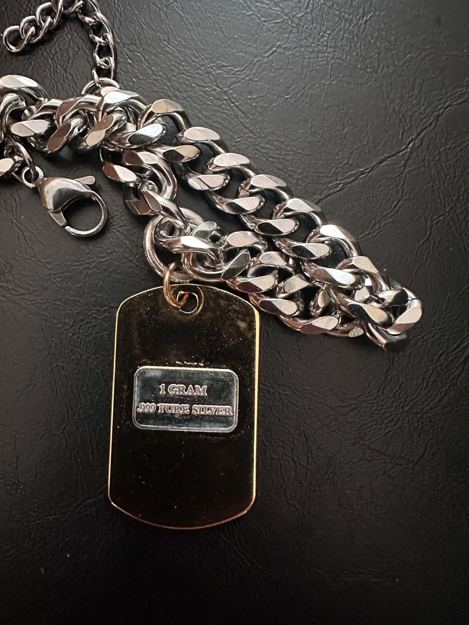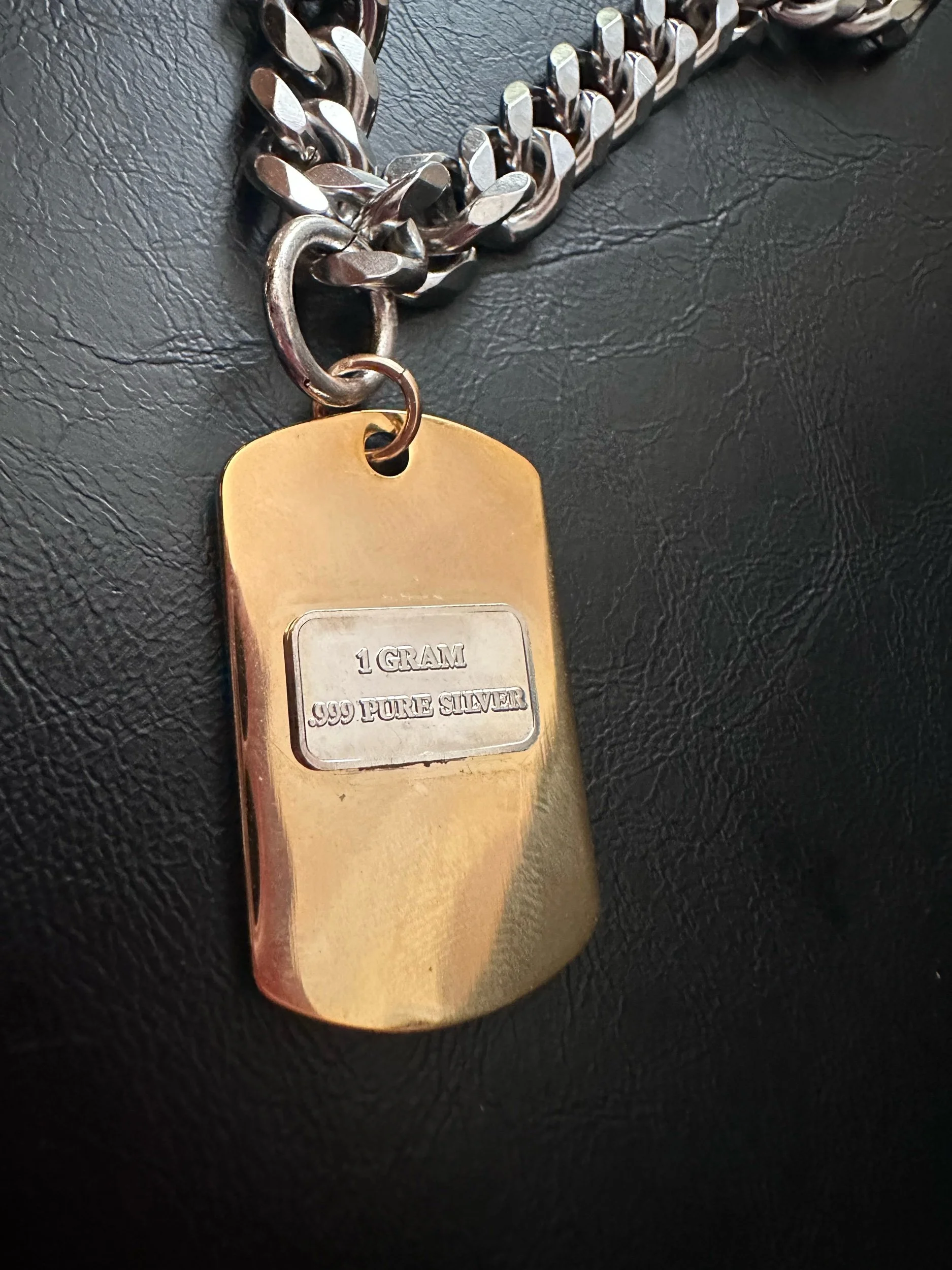 Silver Curb Chain with gold plated stainless steel dog tag pendant. Gold filled jump ring. 1 gram bullion of FINE SILVER. Marked .999/ USCG.