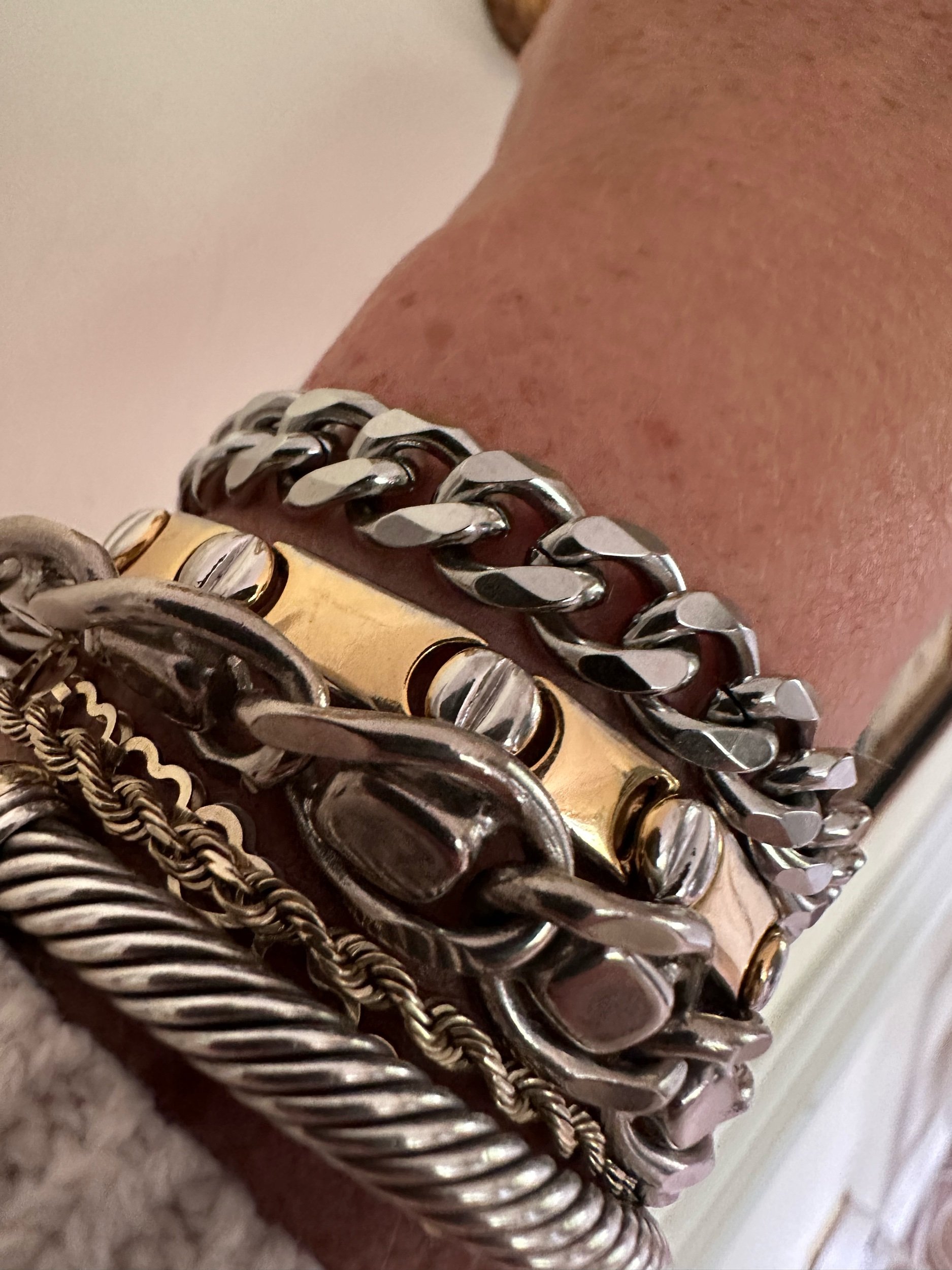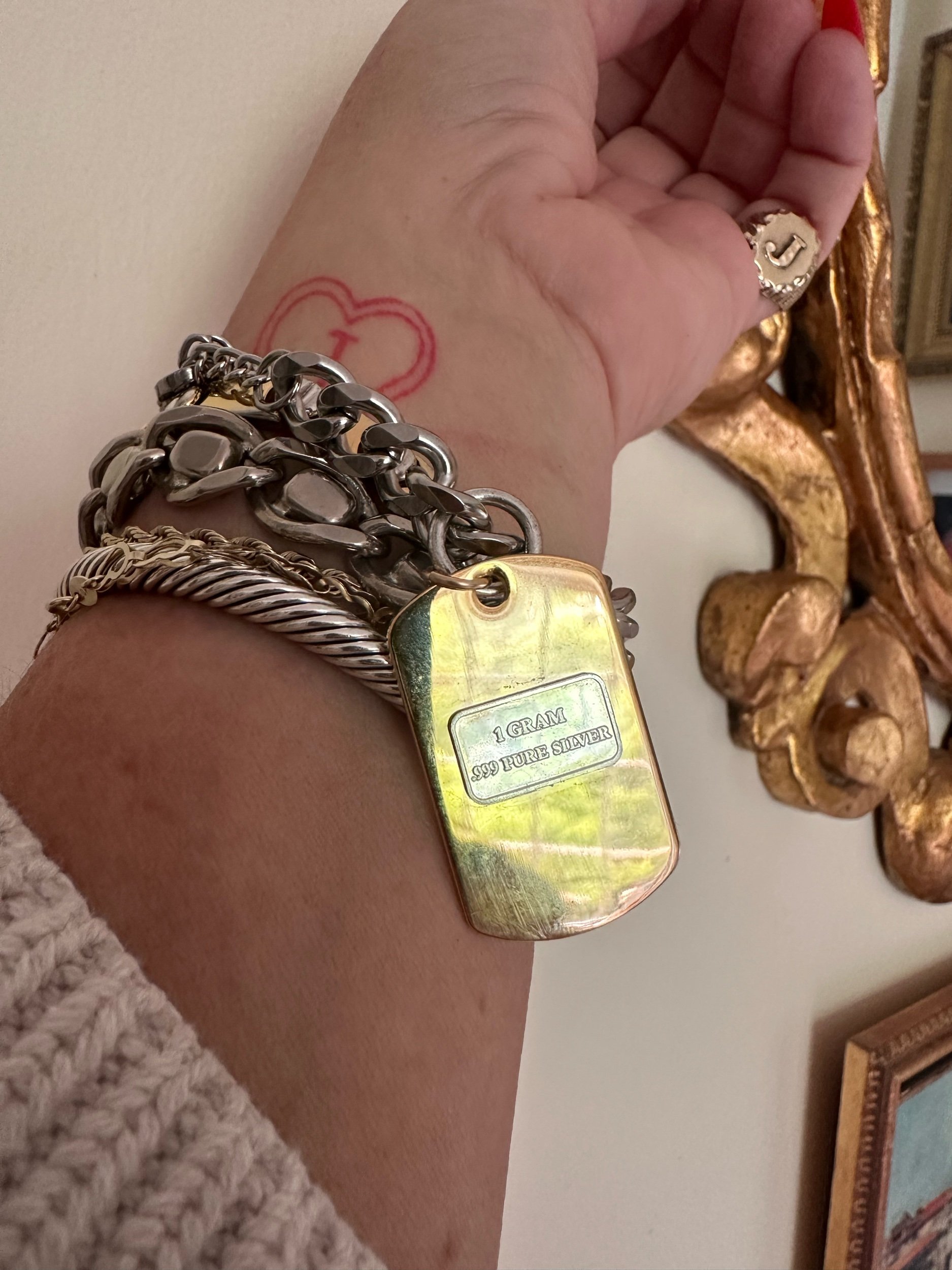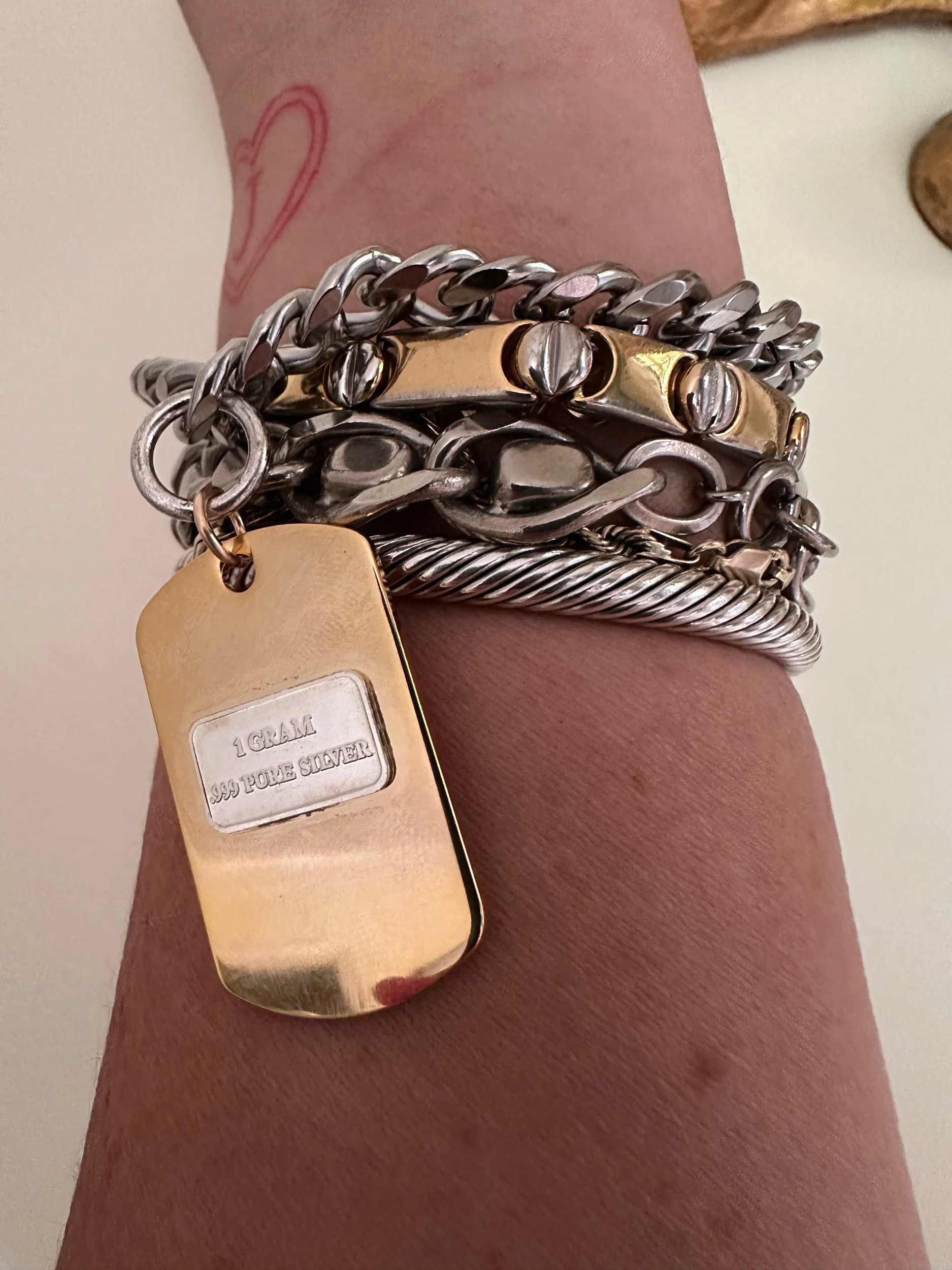 Silver Curb Chain with gold plated stainless steel dog tag pendant. Gold filled jump ring. 1 gram bullion of FINE SILVER. Marked .999/ USCG.