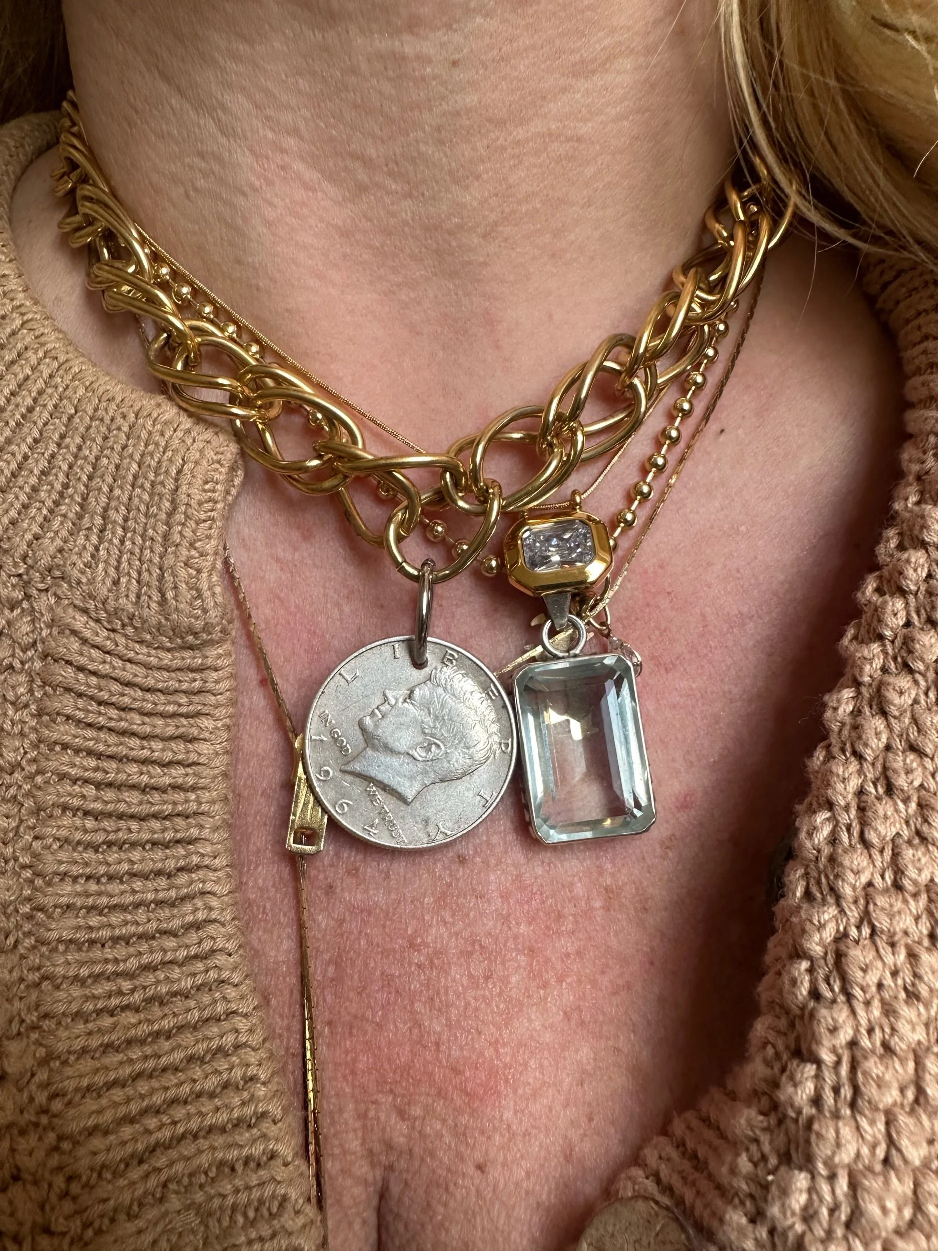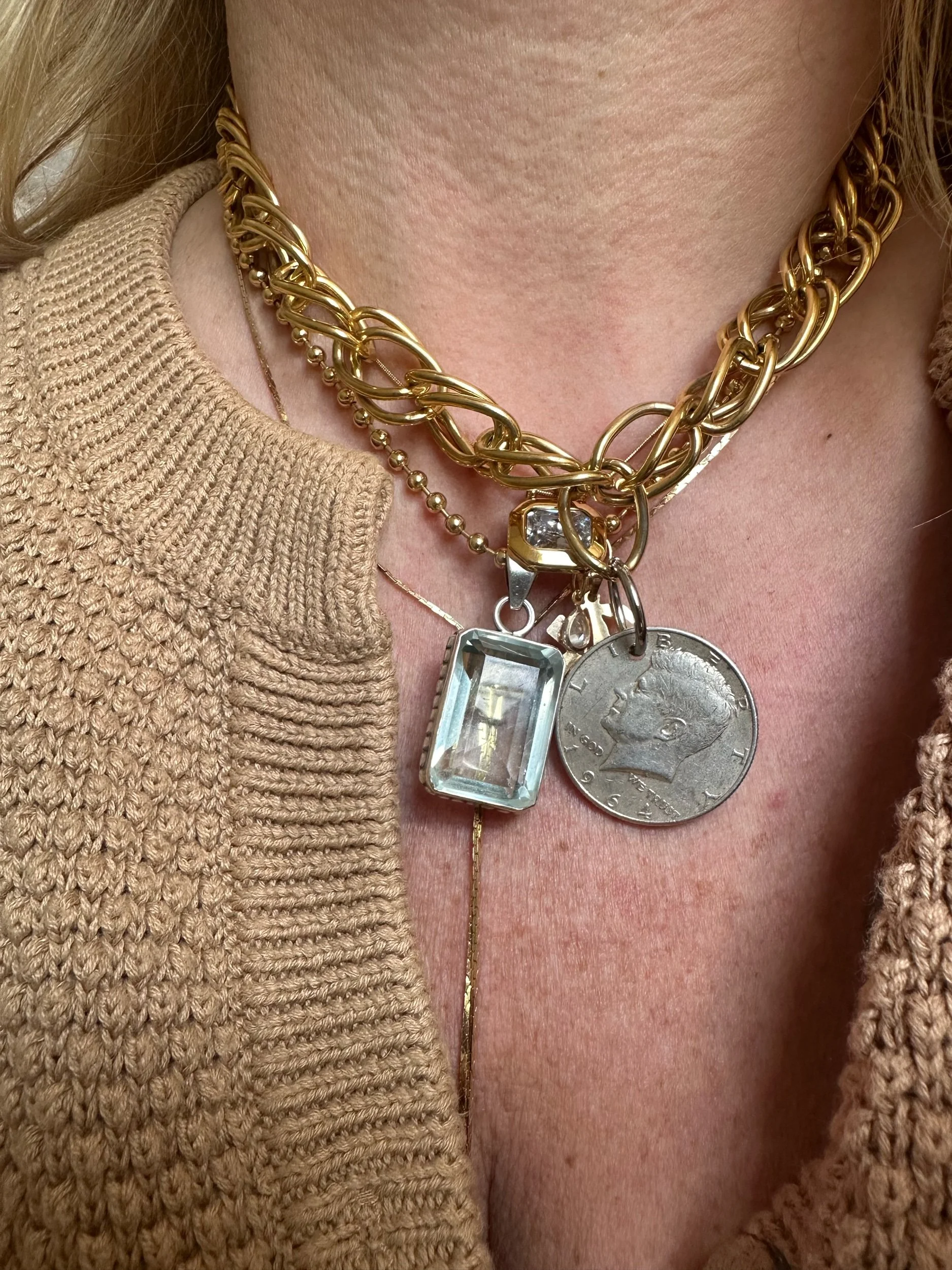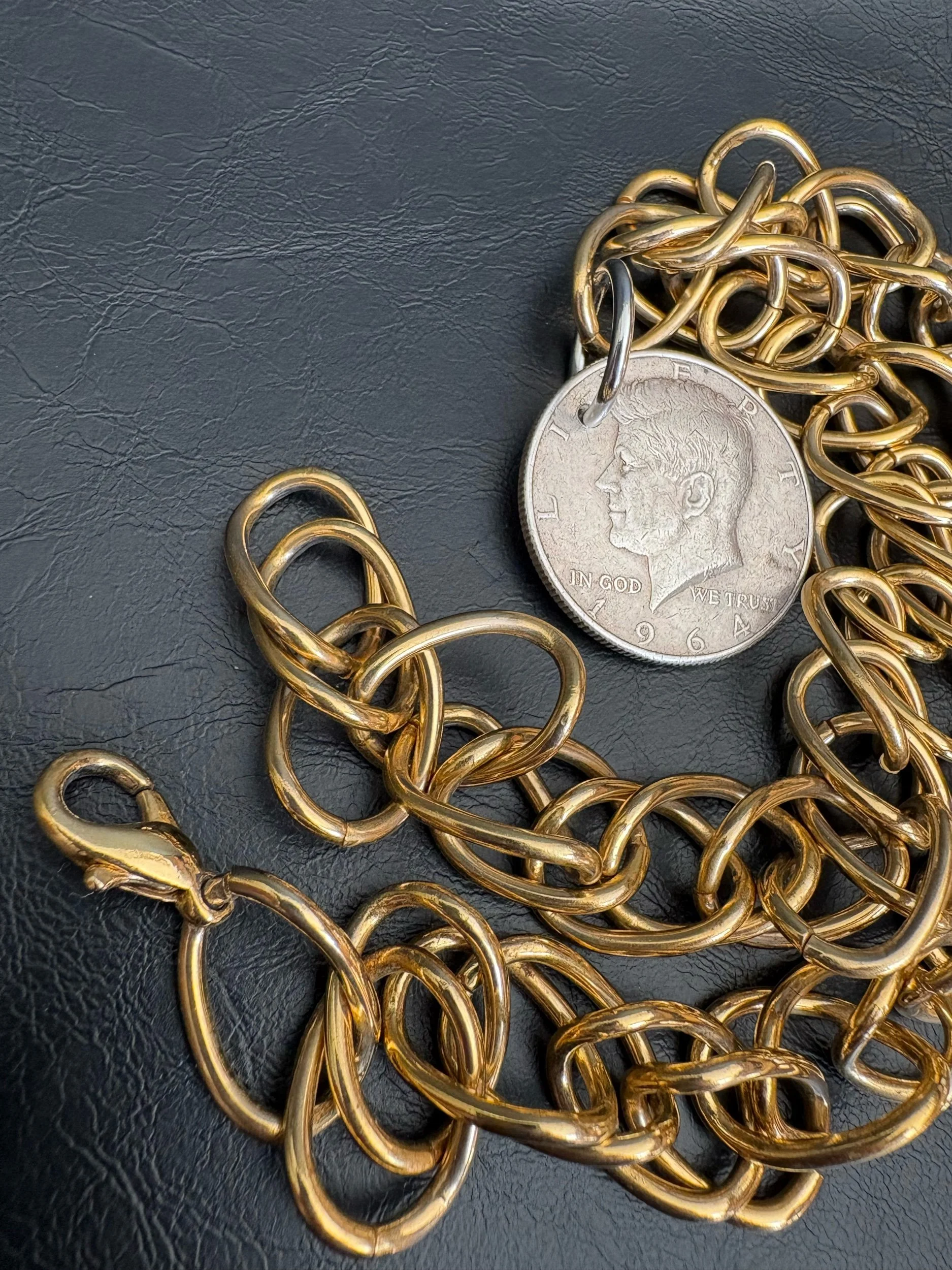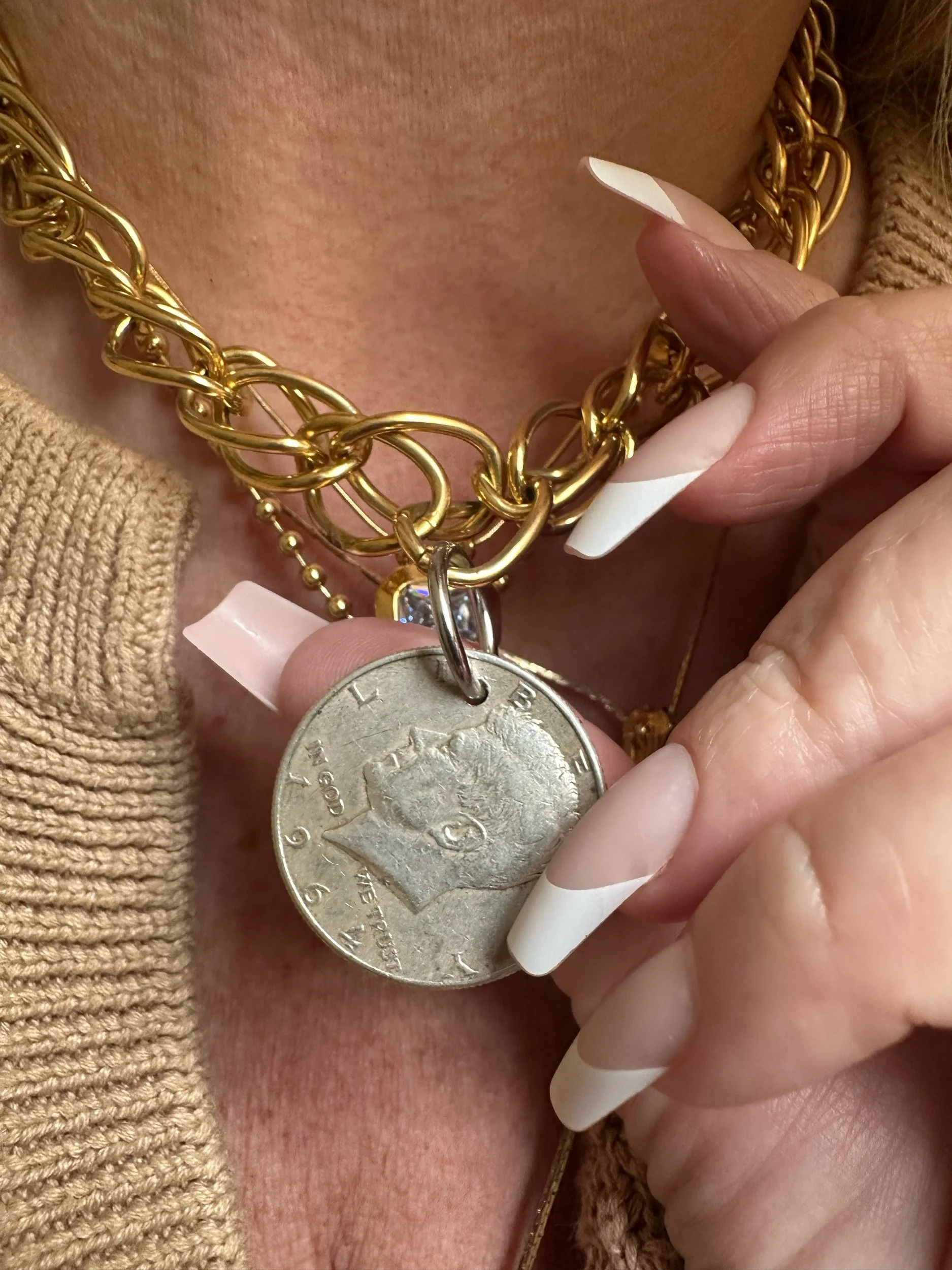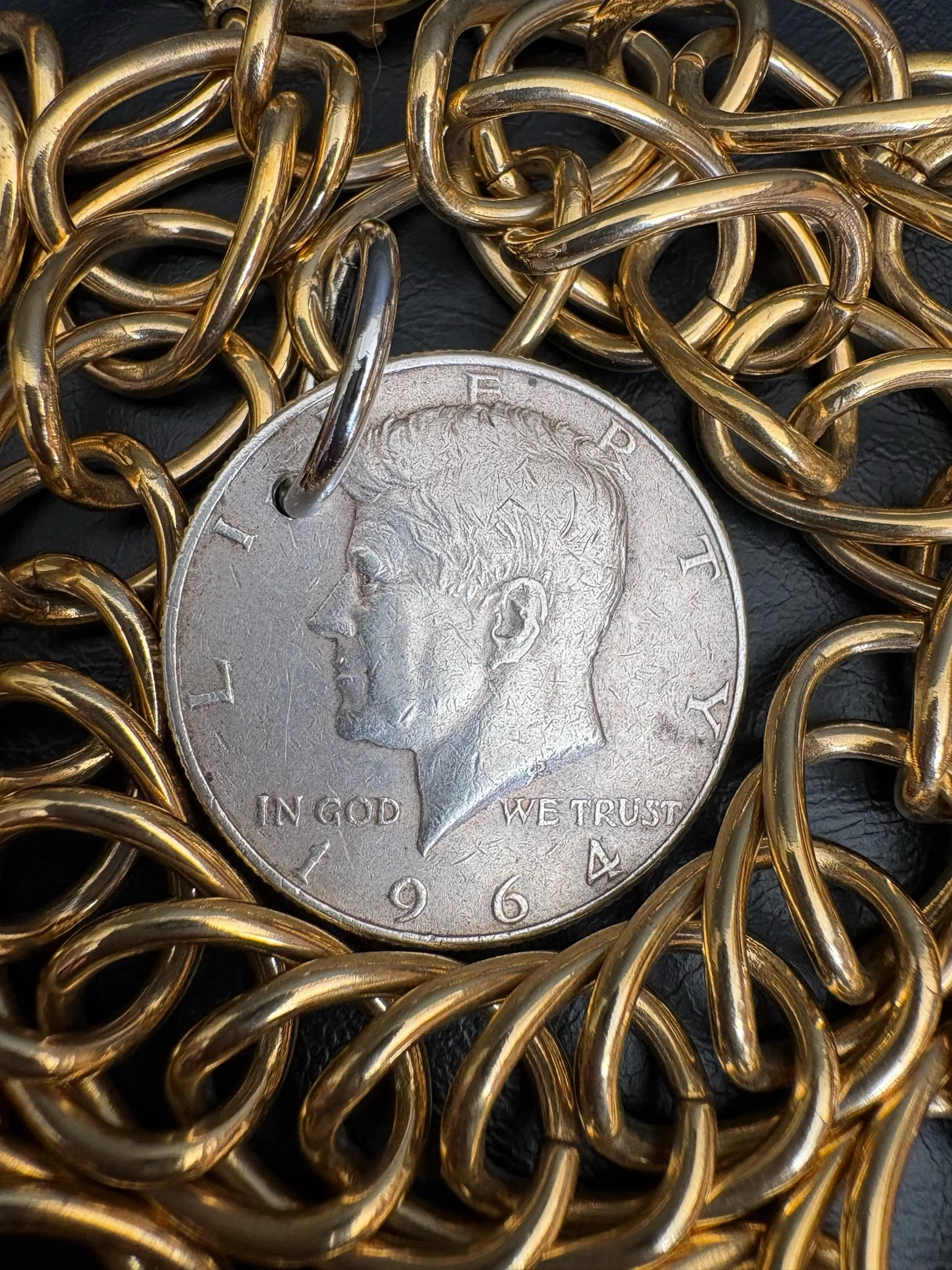 Sourced Vintage double link chain with Kennedy Silver Half Dollar. Coin contains 90% FINE silver. Oversized lobster claw. Easy on/ off.