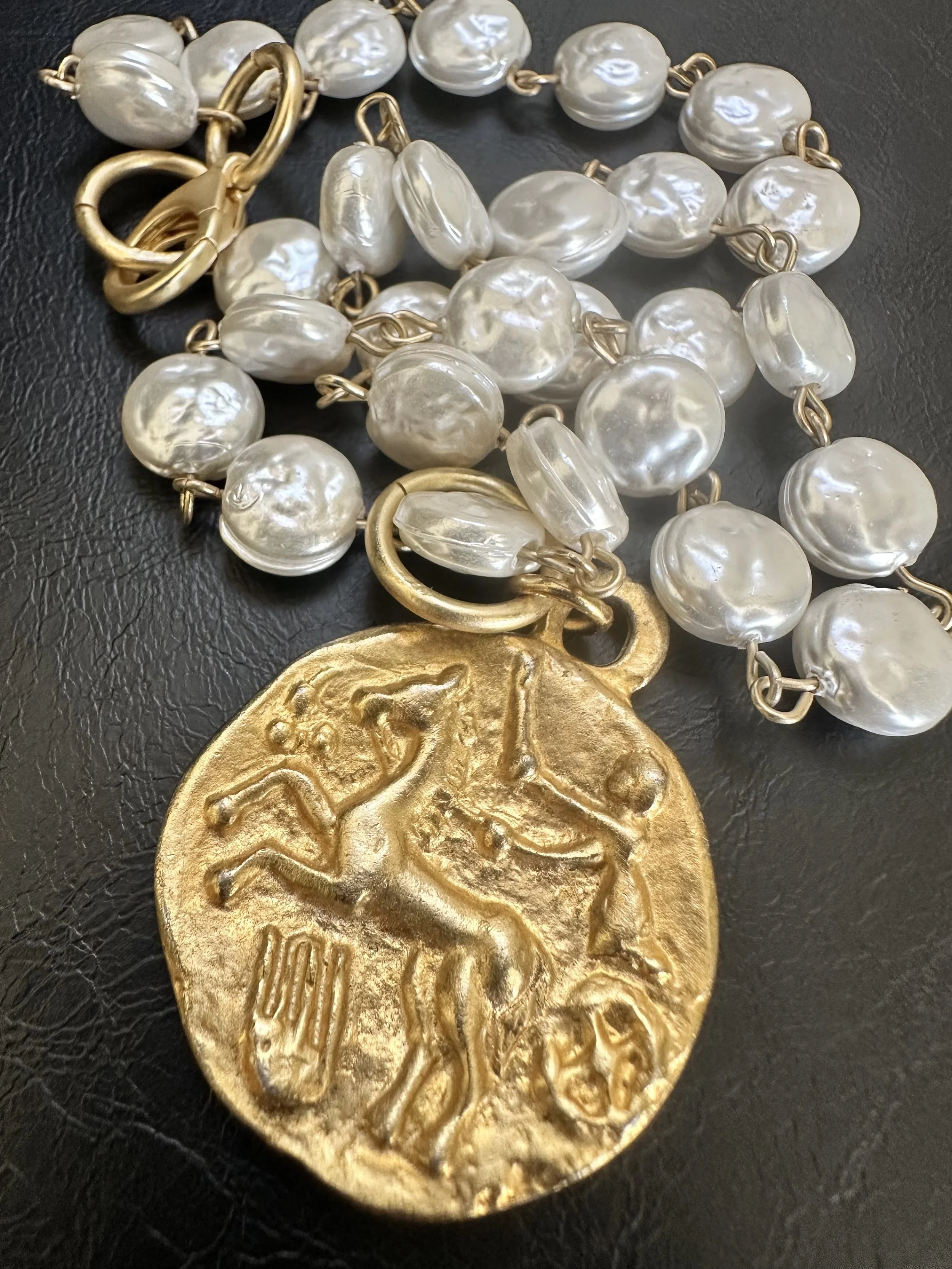 Porcelain freshwater replica pearls with gold wire. Matte gold lobster clasp and beautiful gold tone vintage coin. Gorgeous, rare and hand made.