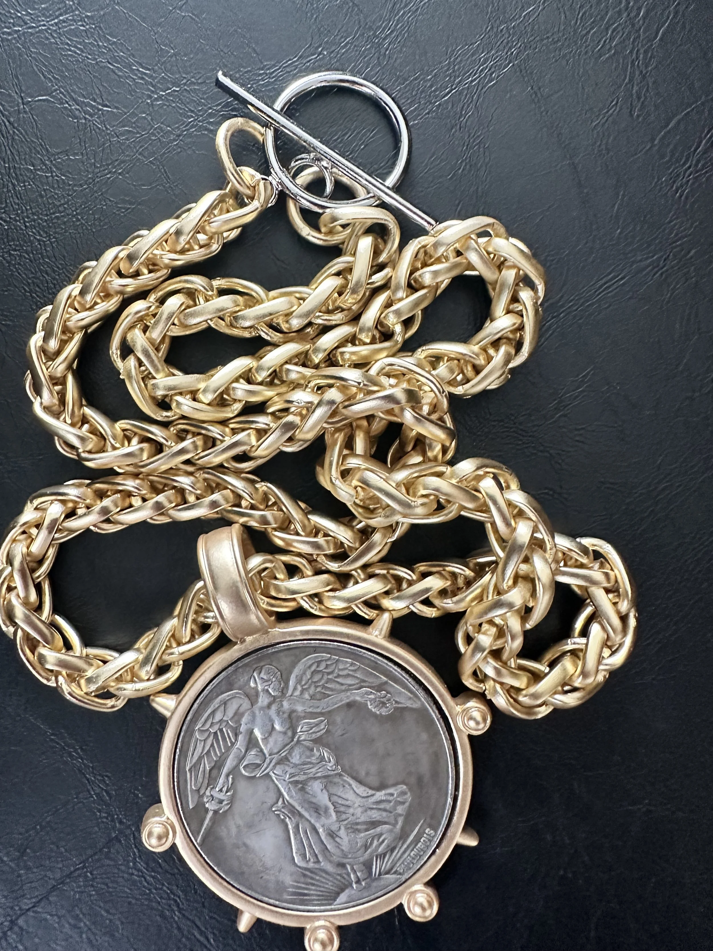 Mixed Metal elegance. Matte gold wheat chain with silver tone sleek toggle. Large matte gold bezel with French coin.