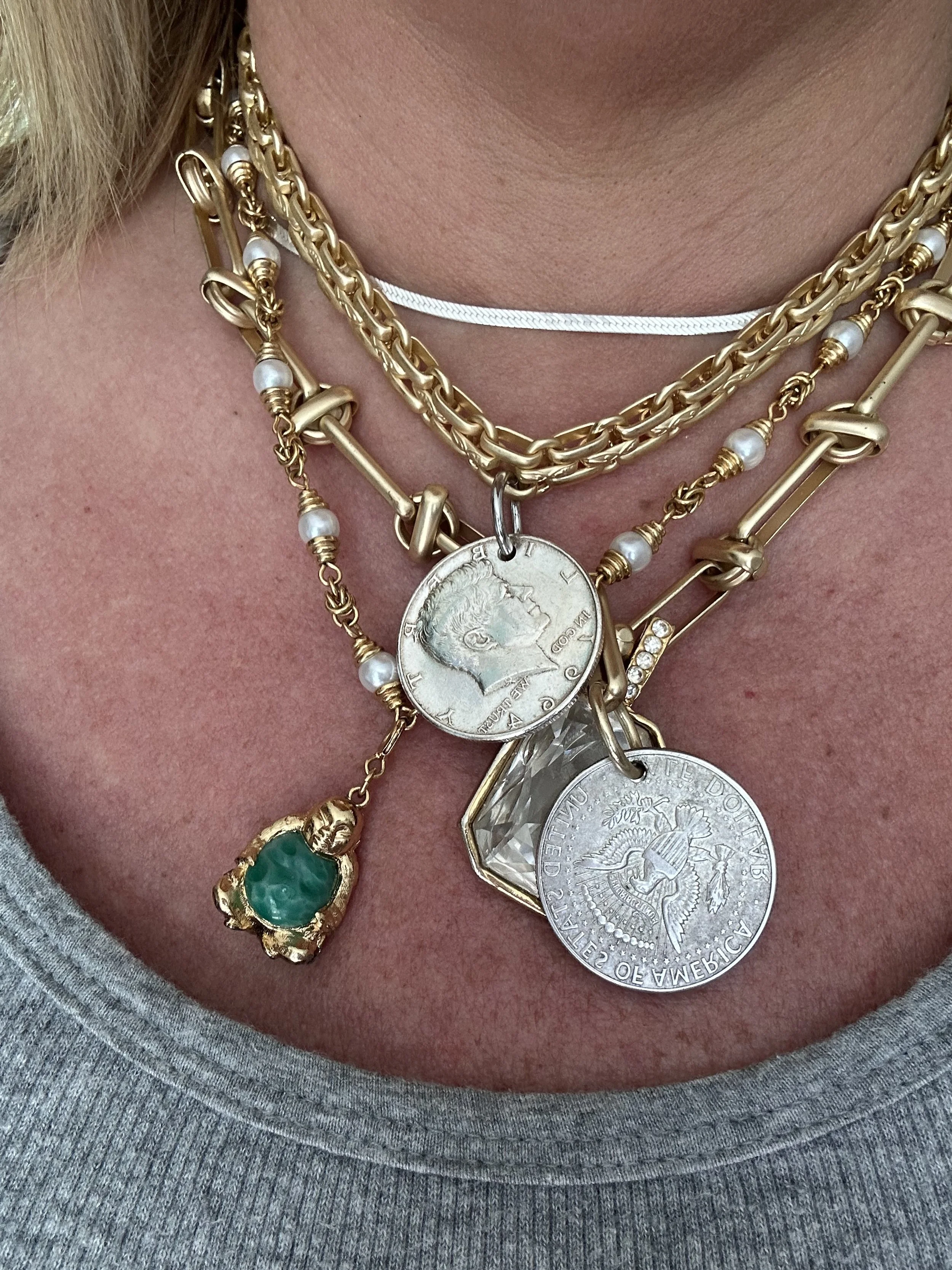 Your sexiest investment necklace. Matte gold tone thick chain with mixed metal hardware. 1964 Genuine Kennedy coin. 90% FINE SILVER.