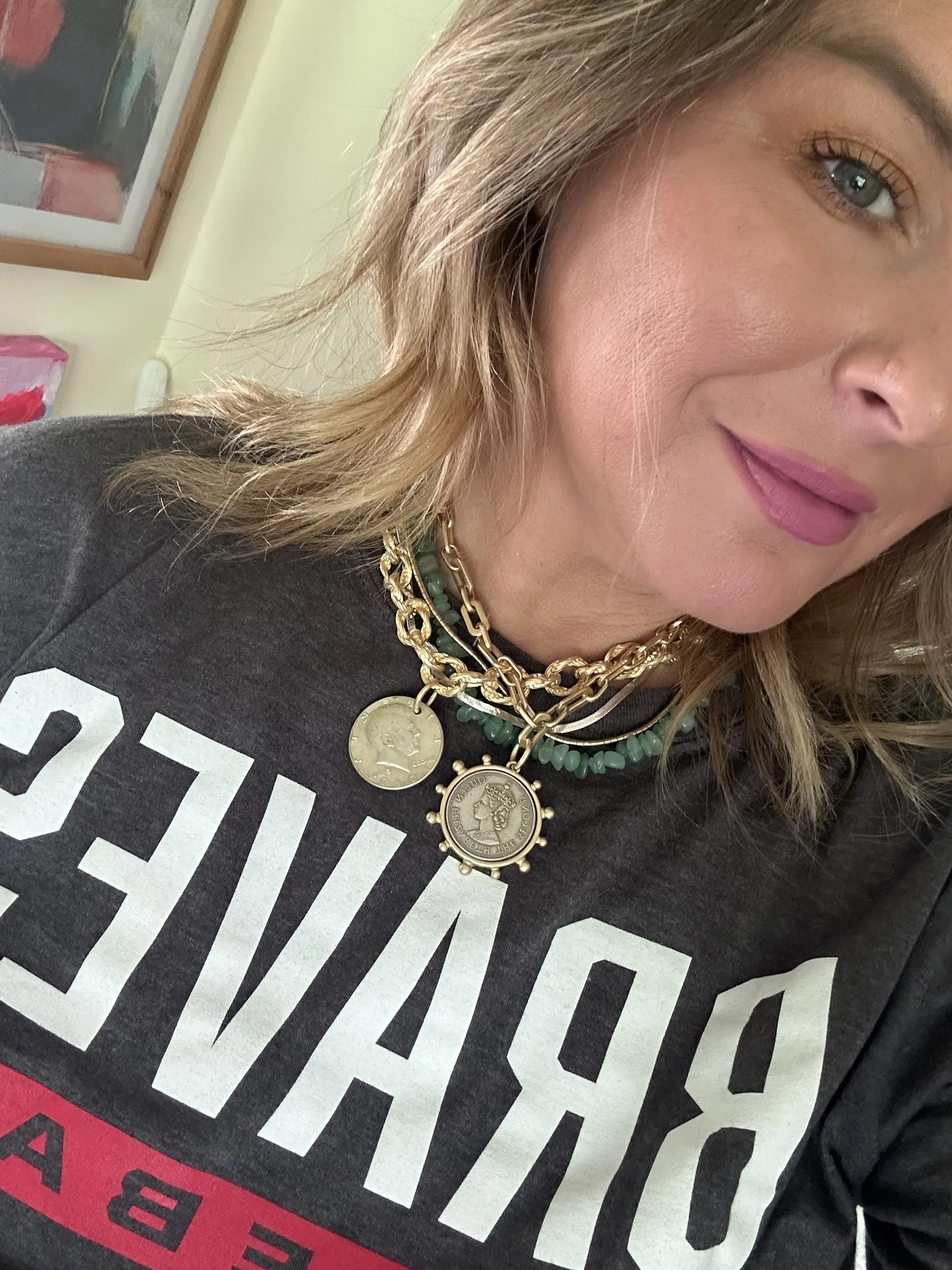 Queen Elizabeth the Second coin in matte gold studded bezel. Paperclip matte gold chain. Oversized lobster clasp.