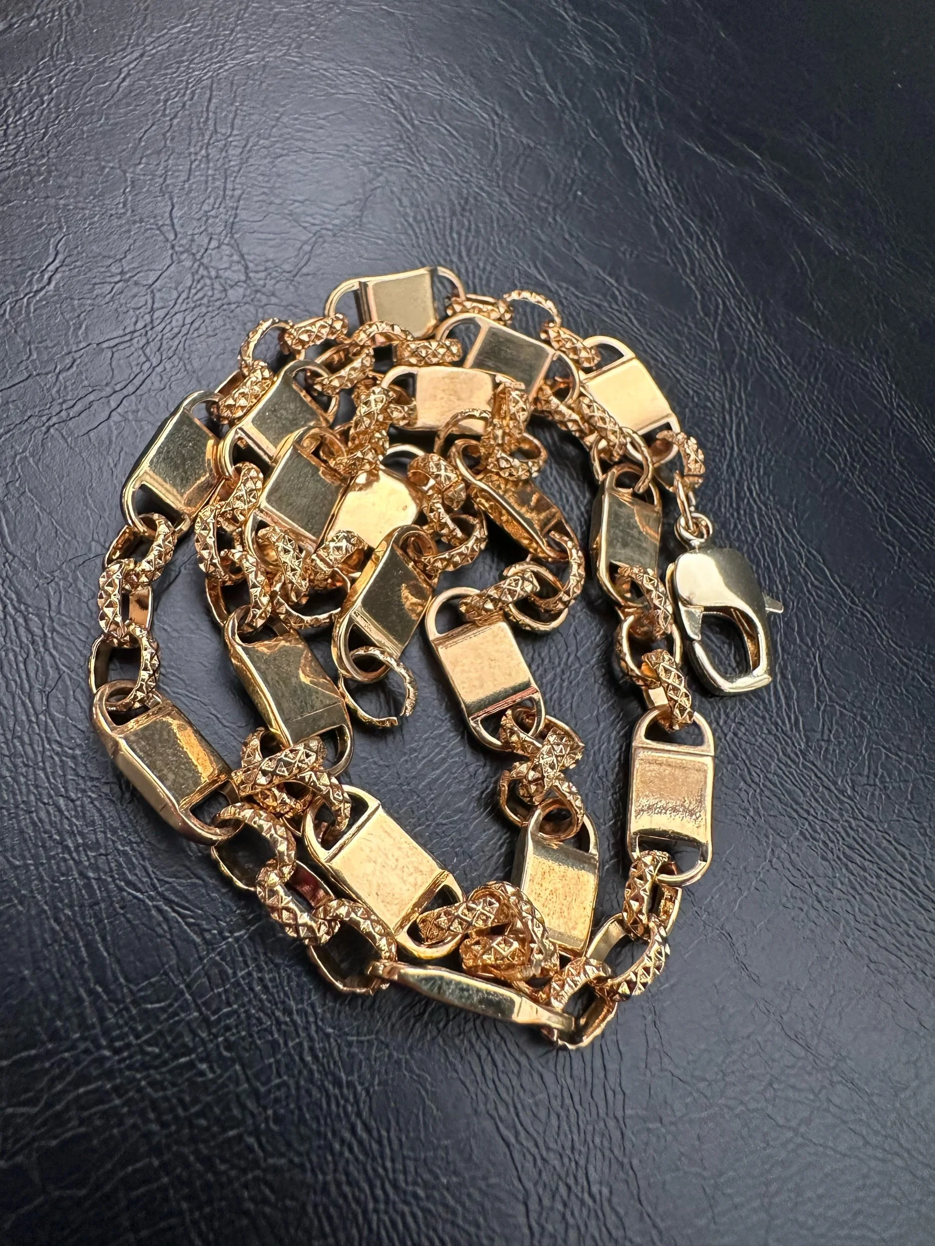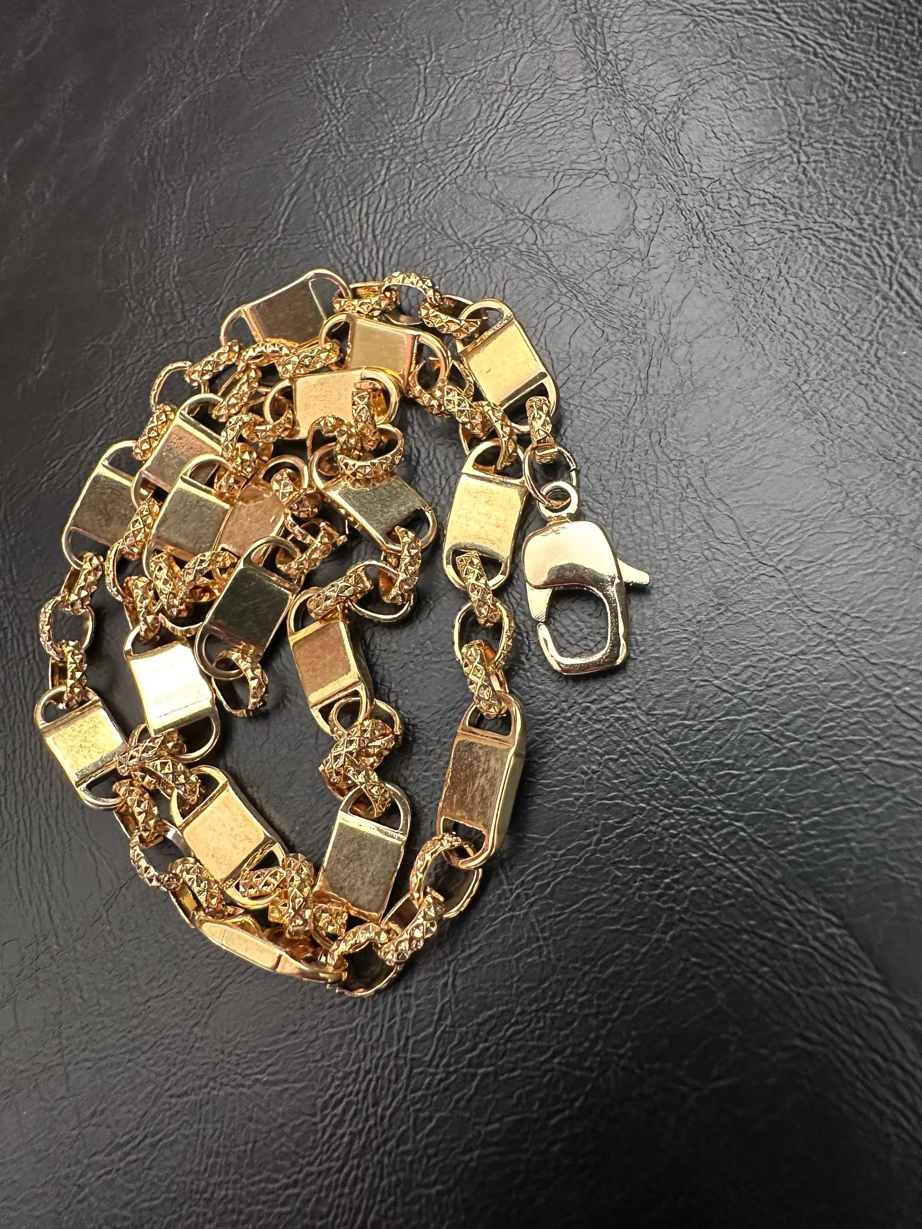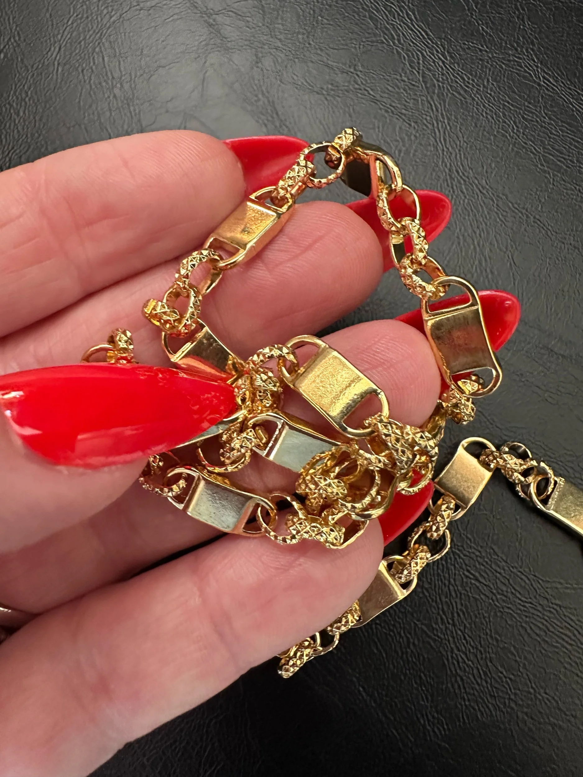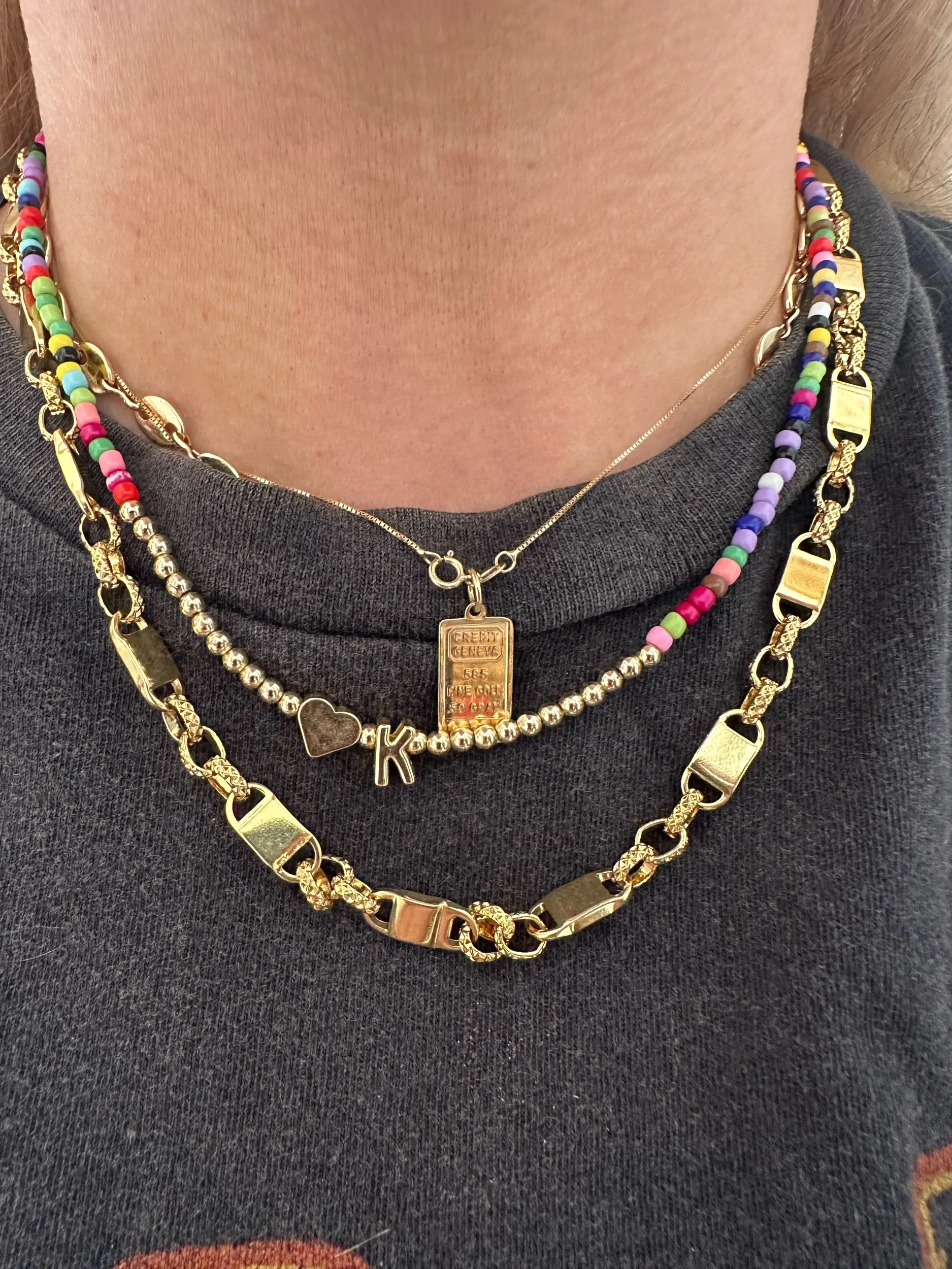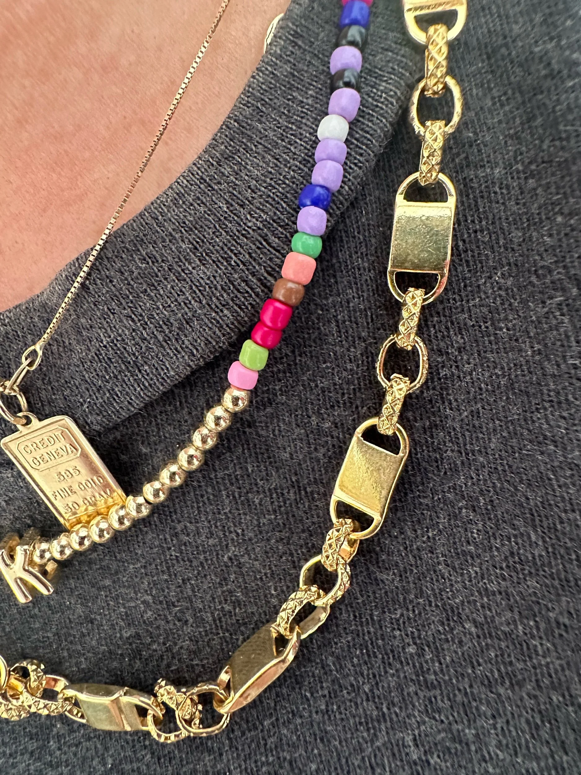 Sexy double plated gold necklace. Golden station bar + textured golden rings give your stack added shine. Great by itself or even better in a stack. Square lobster clasp closure.