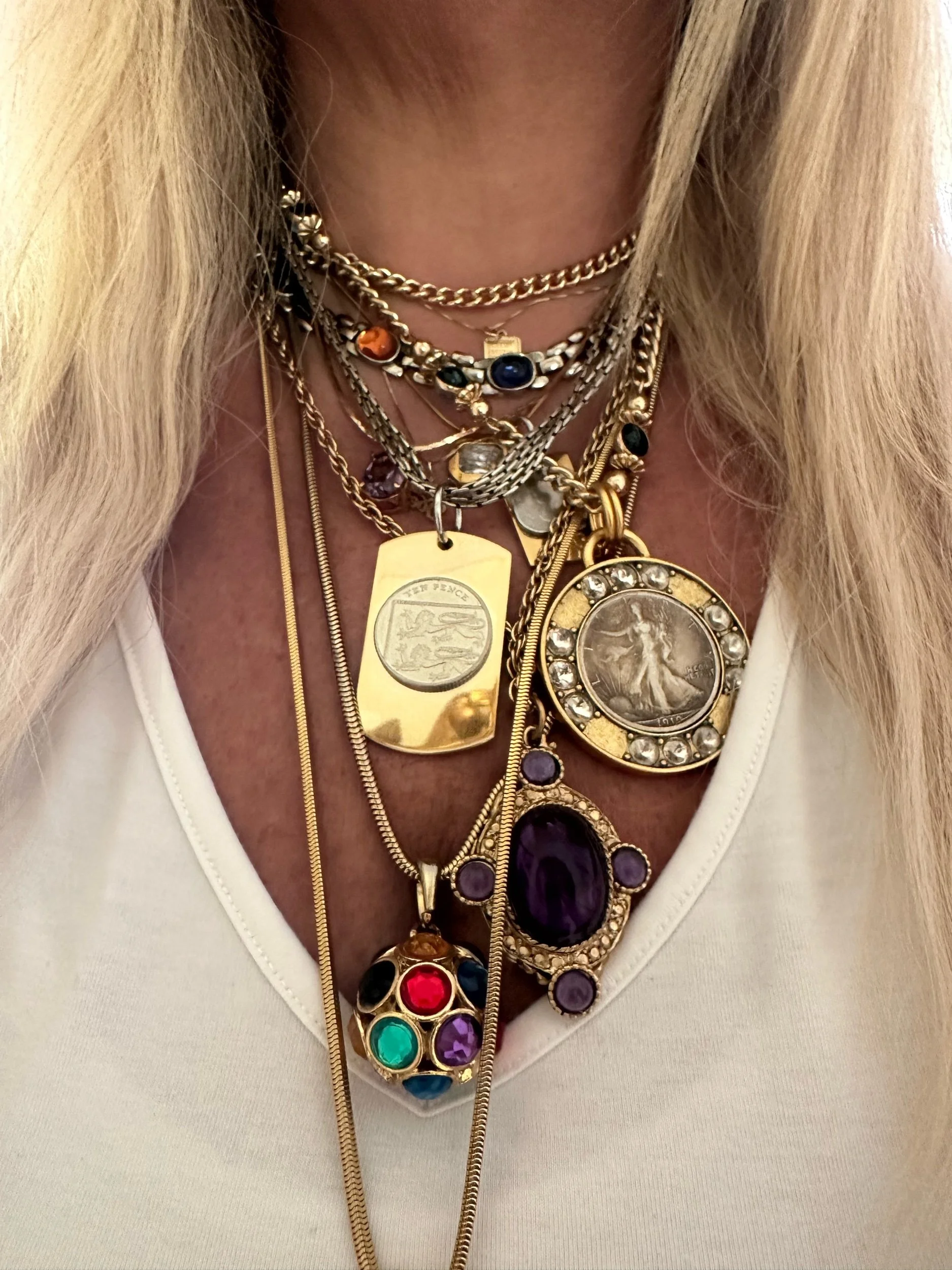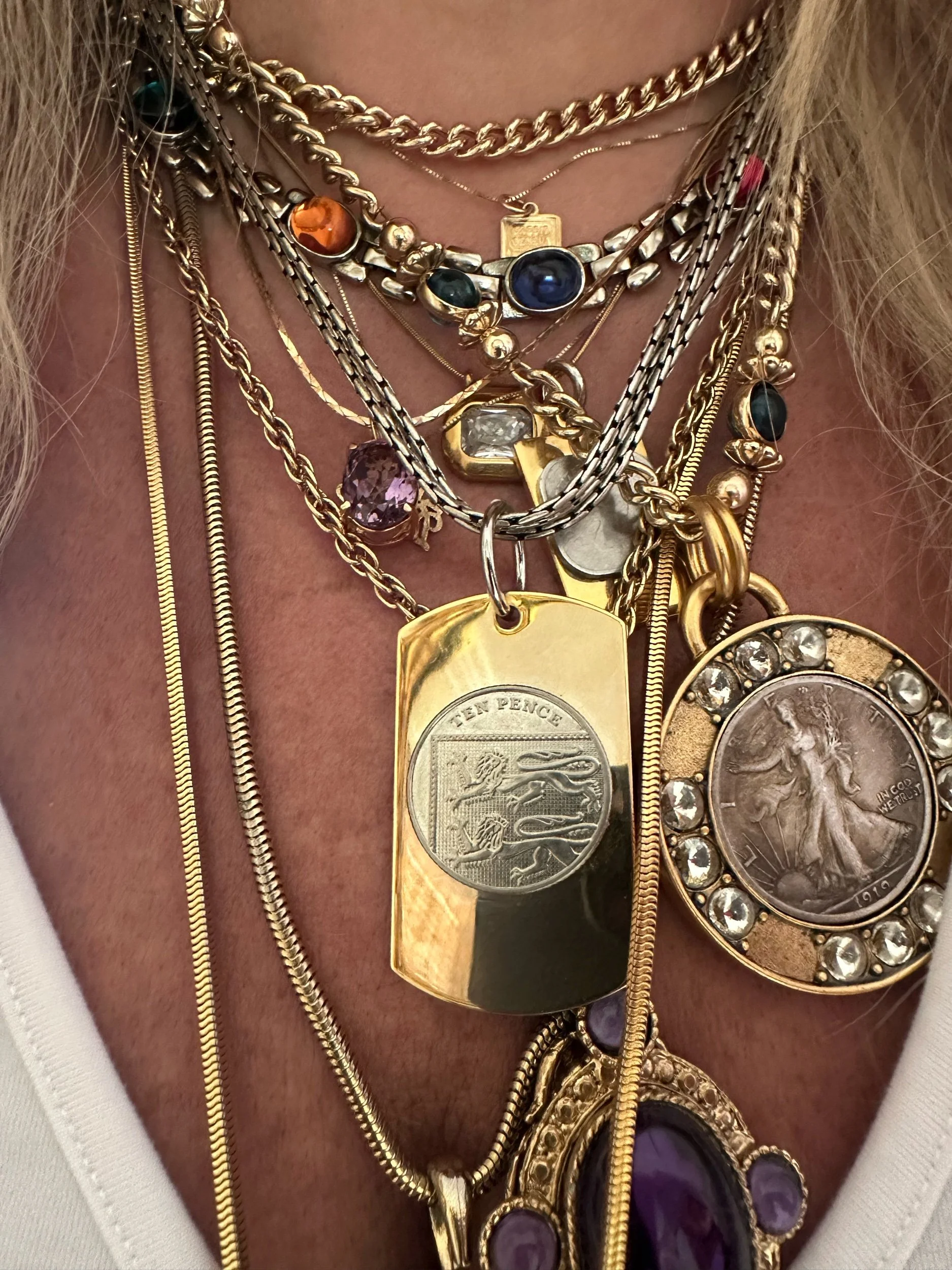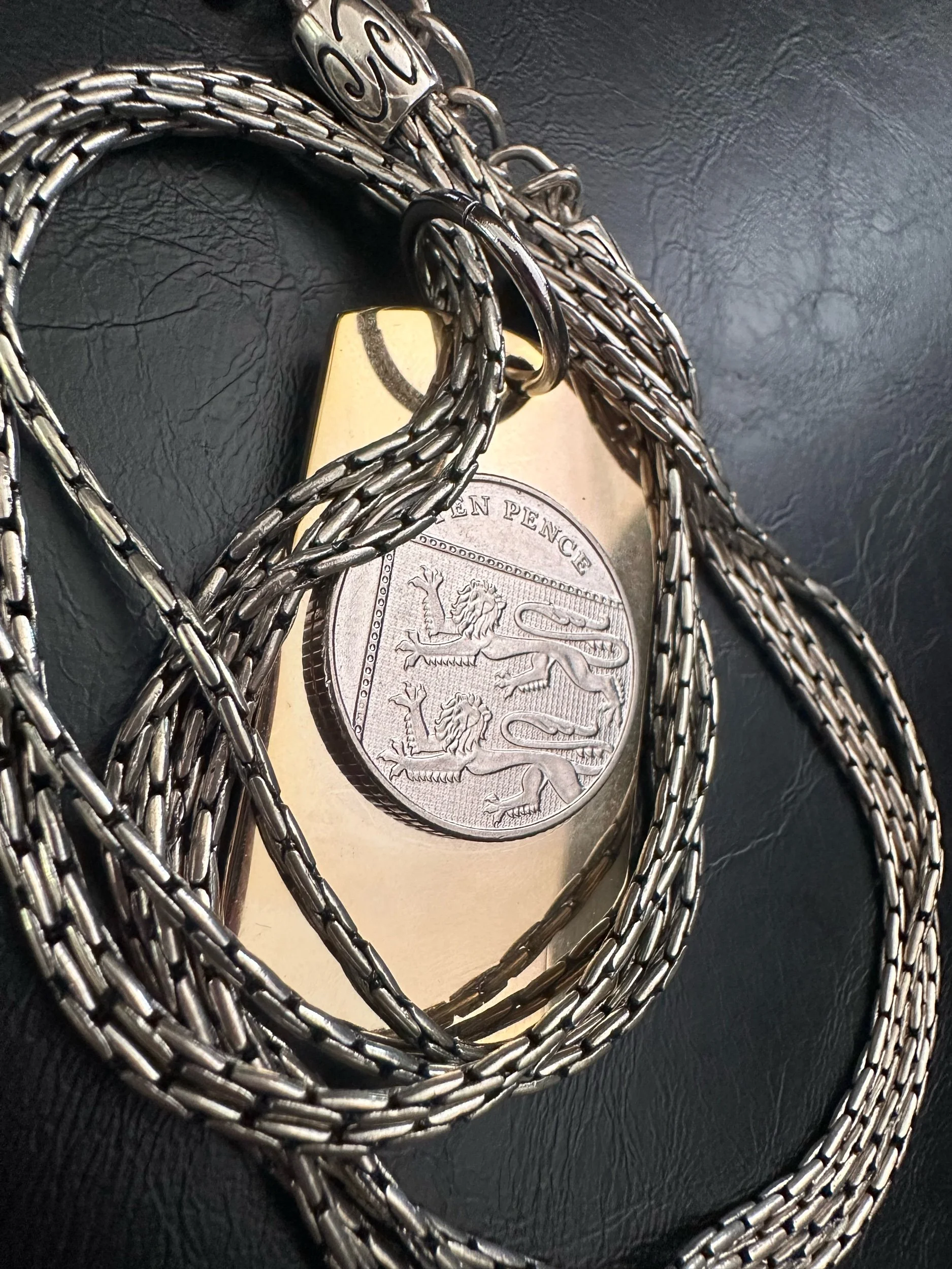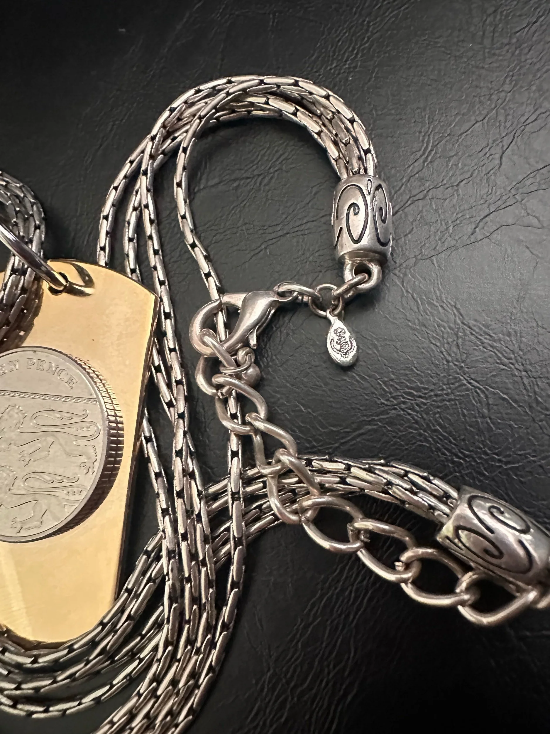 Highly coveted original by Kessley. Good plated Stainless Steel dog tag with ten pence coin. Coin is real. Paired with a vintage multistrand premier design silver tone necklace.