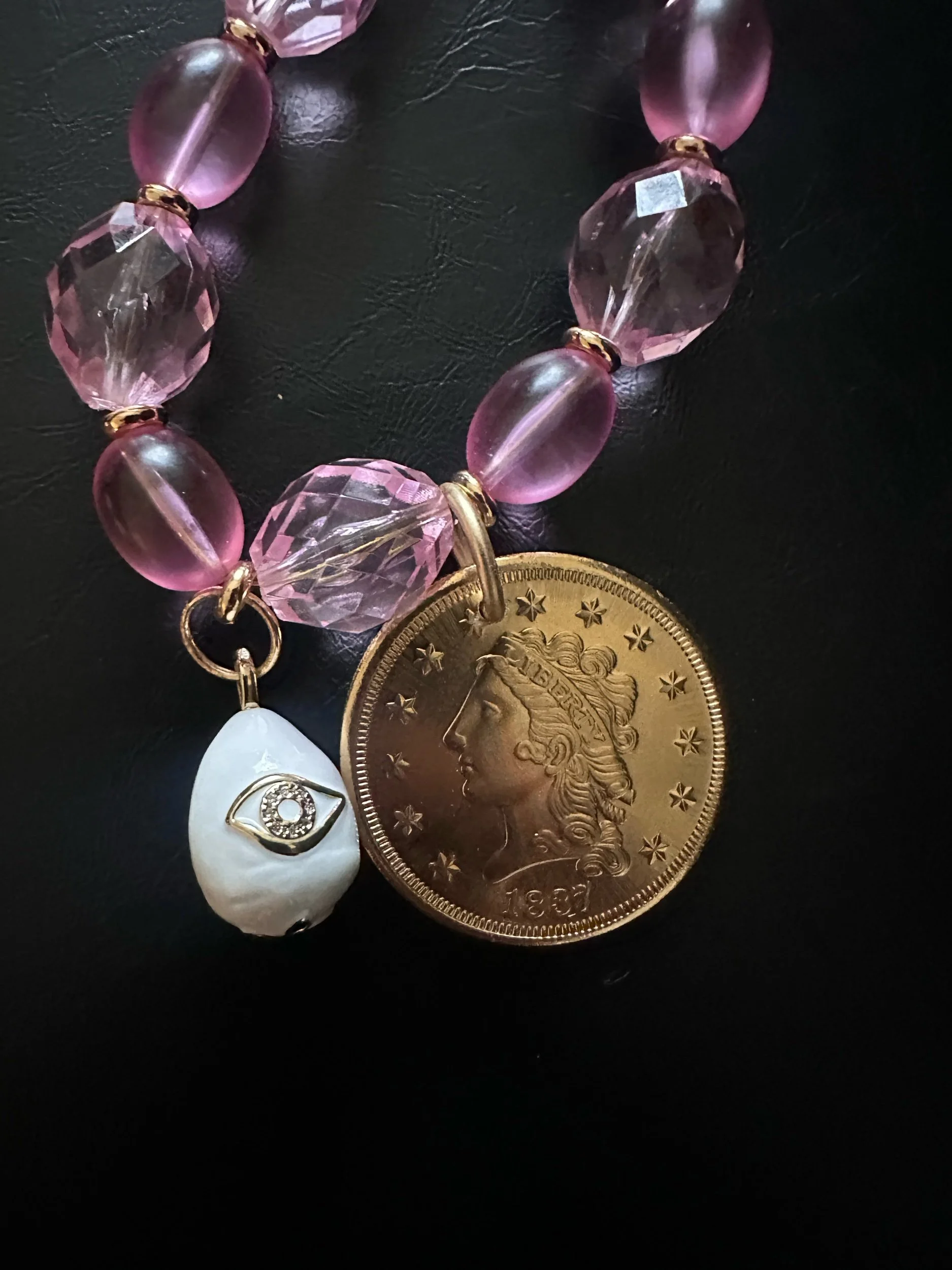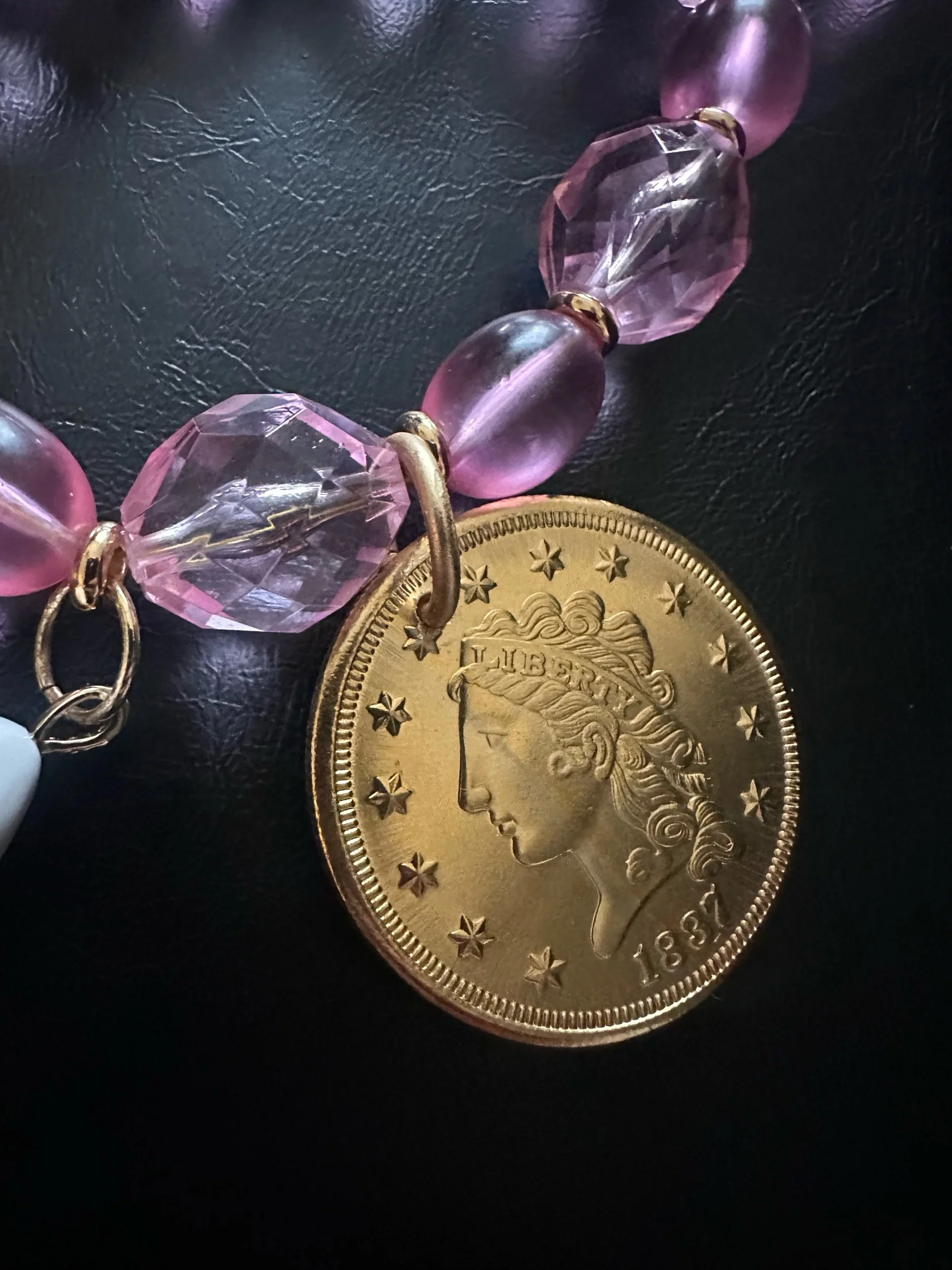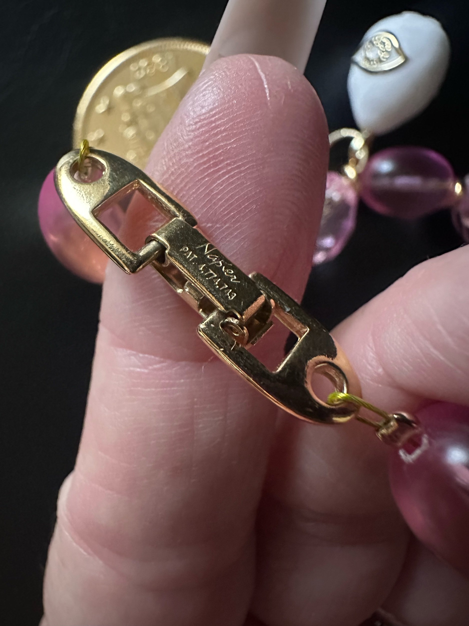 Vintage designer pink necklace. Napier signed on fold over clasp. Baby pink acrylic beads with golden links in between. White egg charm with protective eye. American Tribute coin, brass with 24kg plating/ heavy.