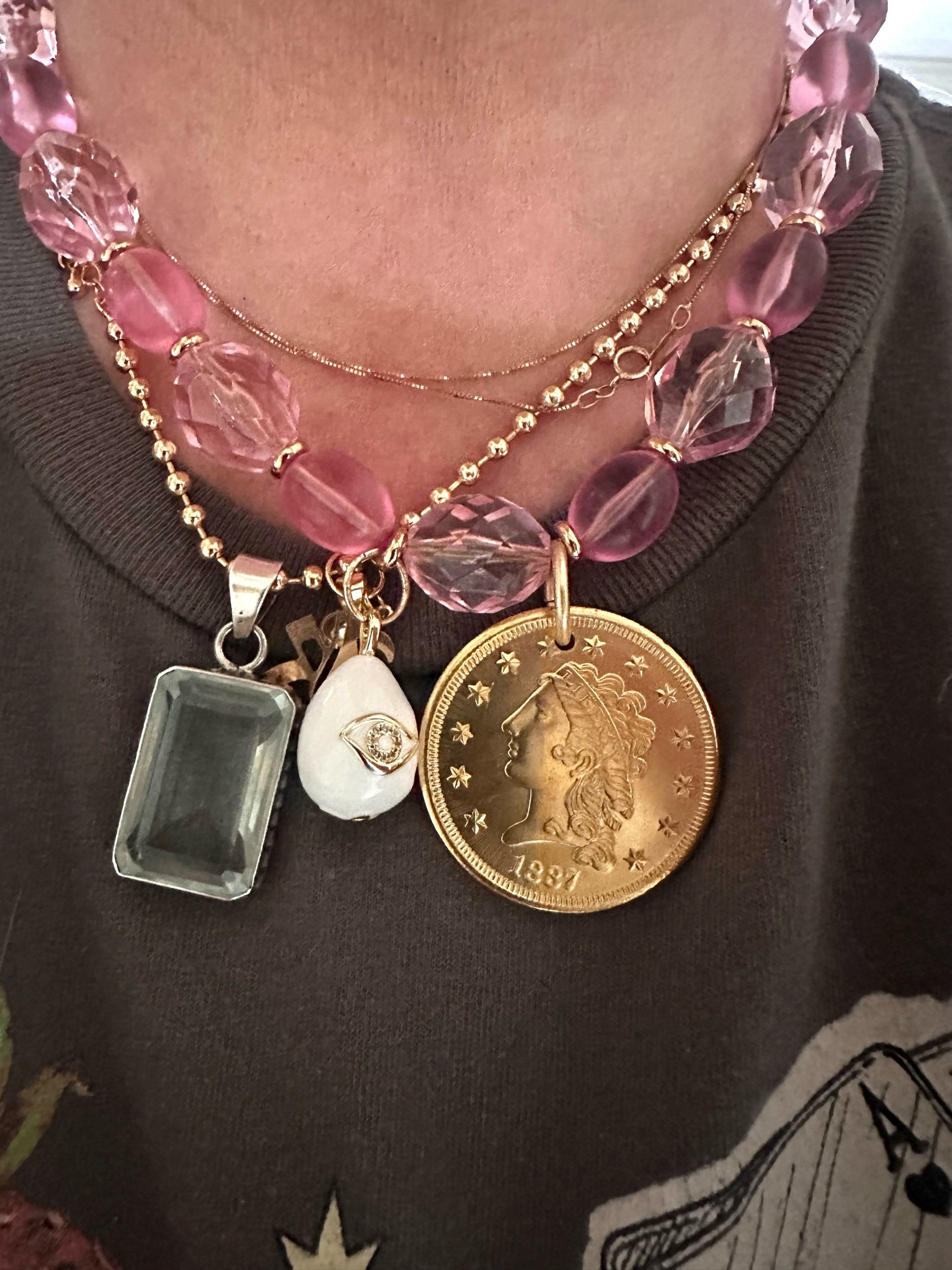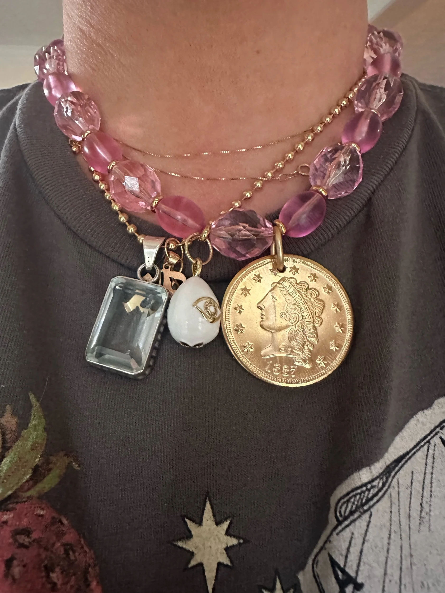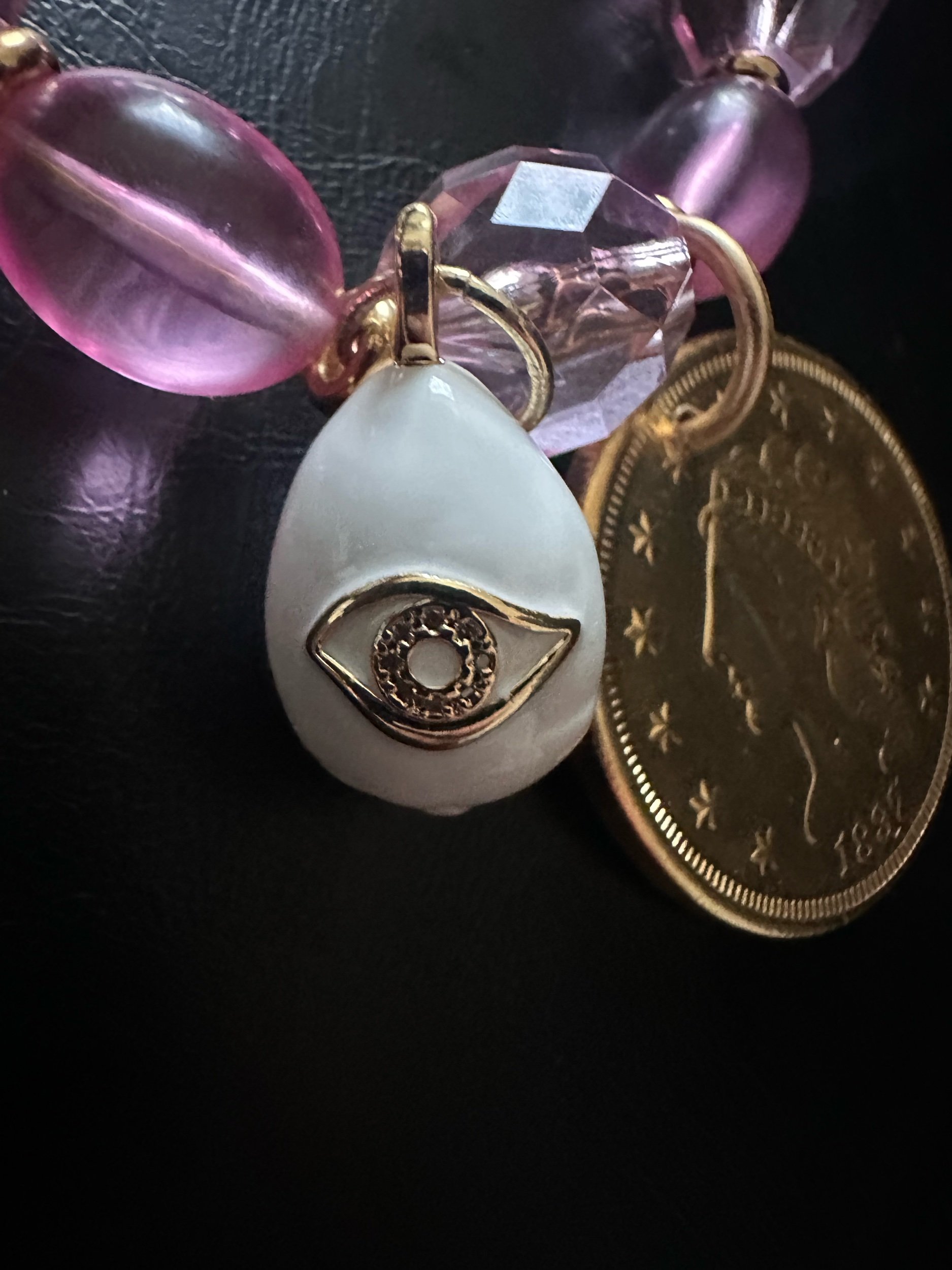 Vintage designer pink necklace. Napier signed on fold over clasp. Baby pink acrylic beads with golden links in between. White egg charm with protective eye. American Tribute coin, brass with 24kg plating/ heavy.