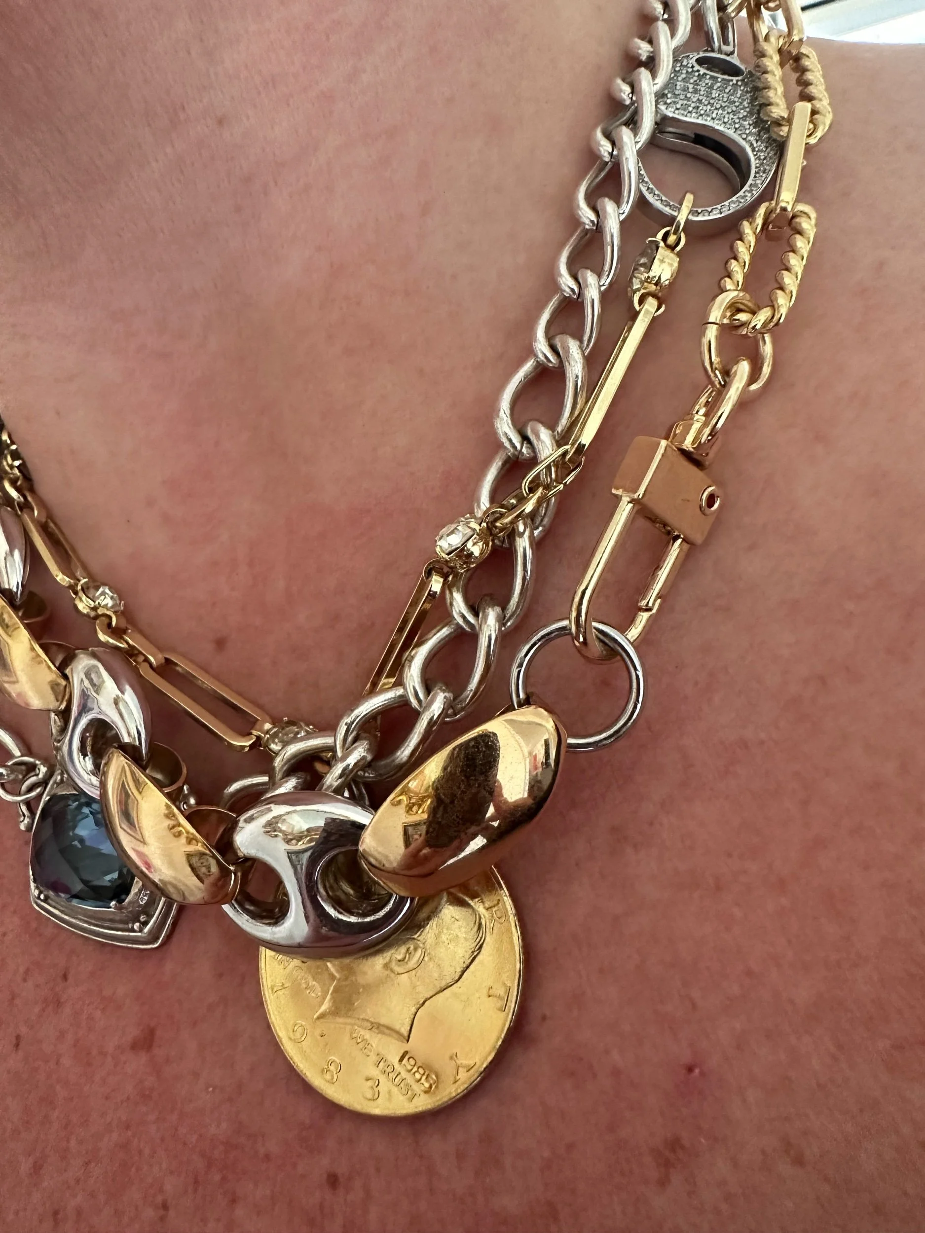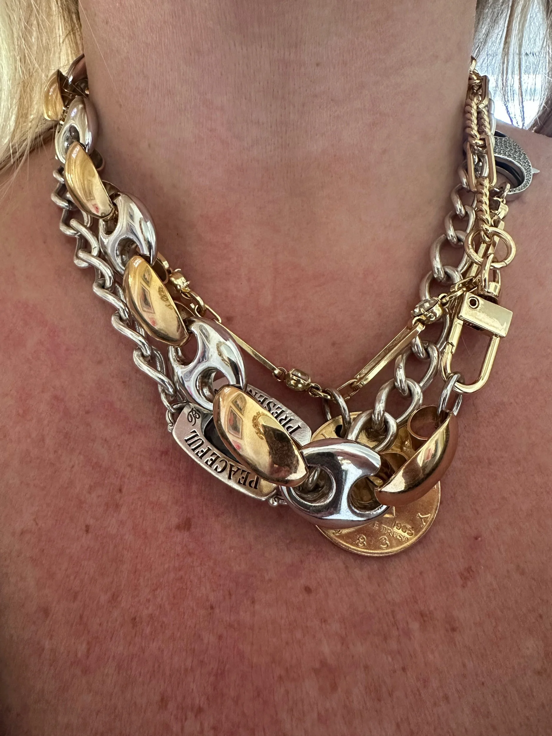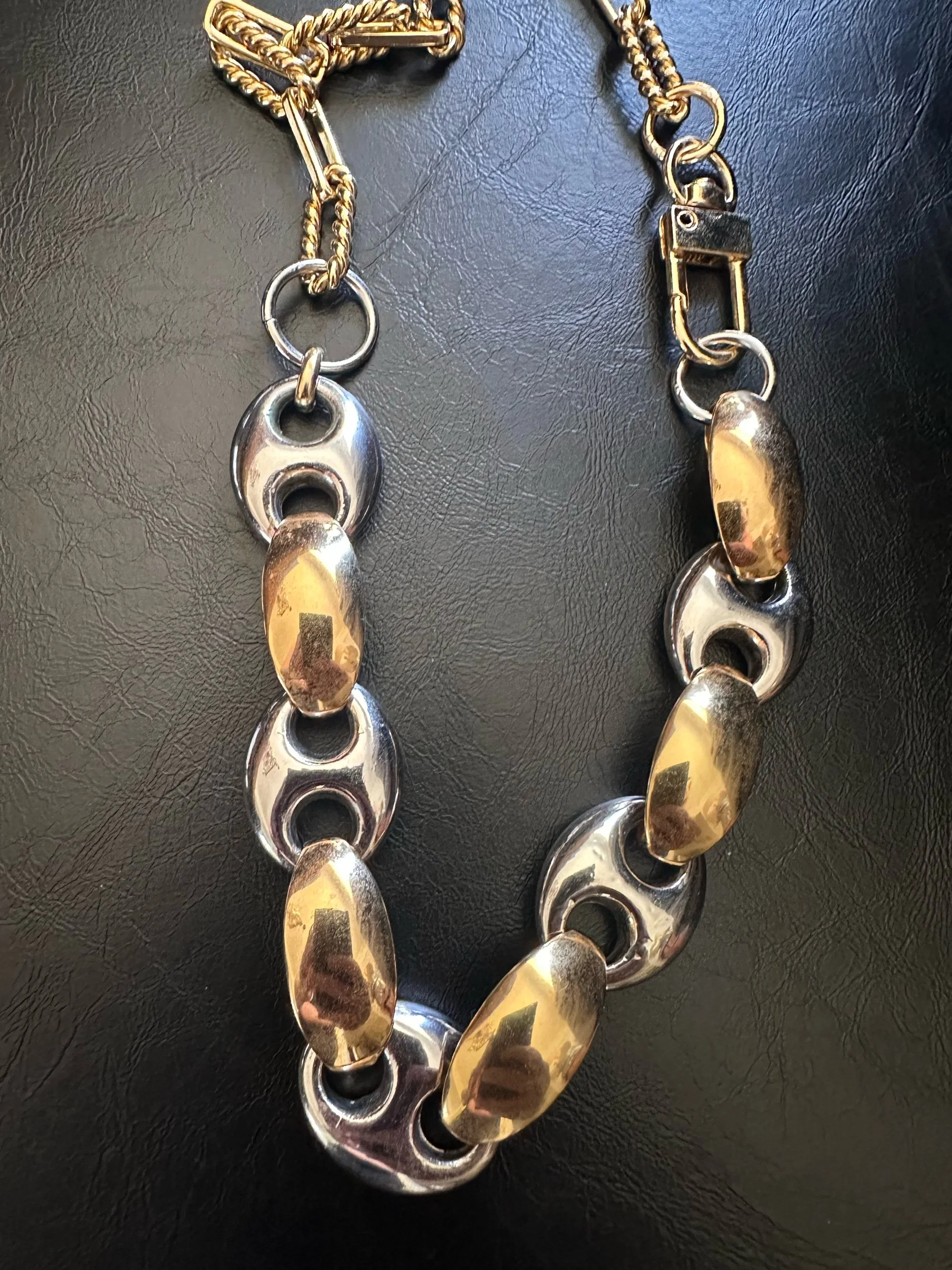 Beautiful puffy, Mariners silver and gold tone link mixed with modern chain from Kessley Lauren Jewels. Industrial clasp closure. Chic/ Edgy + so many ways to wear.