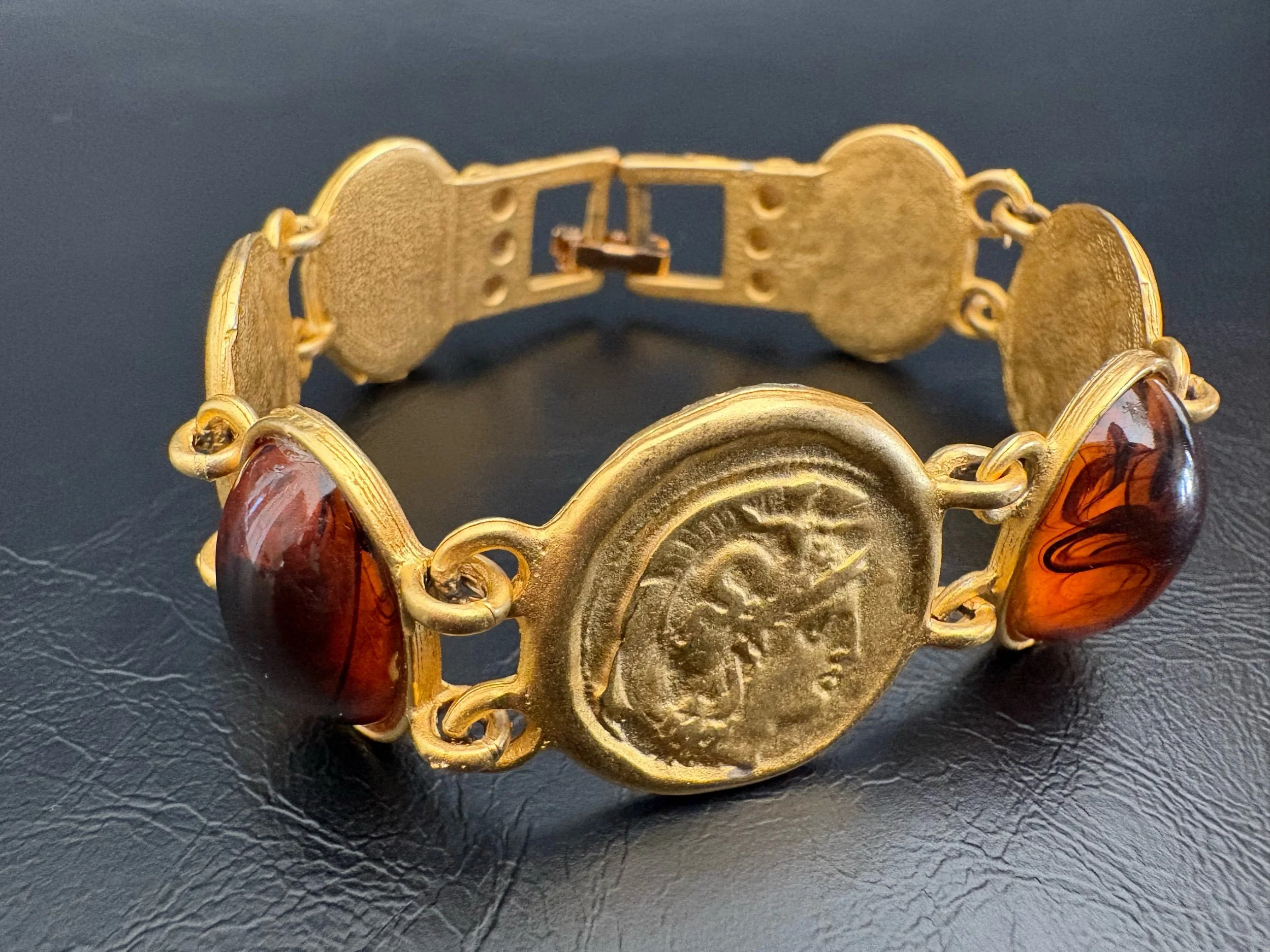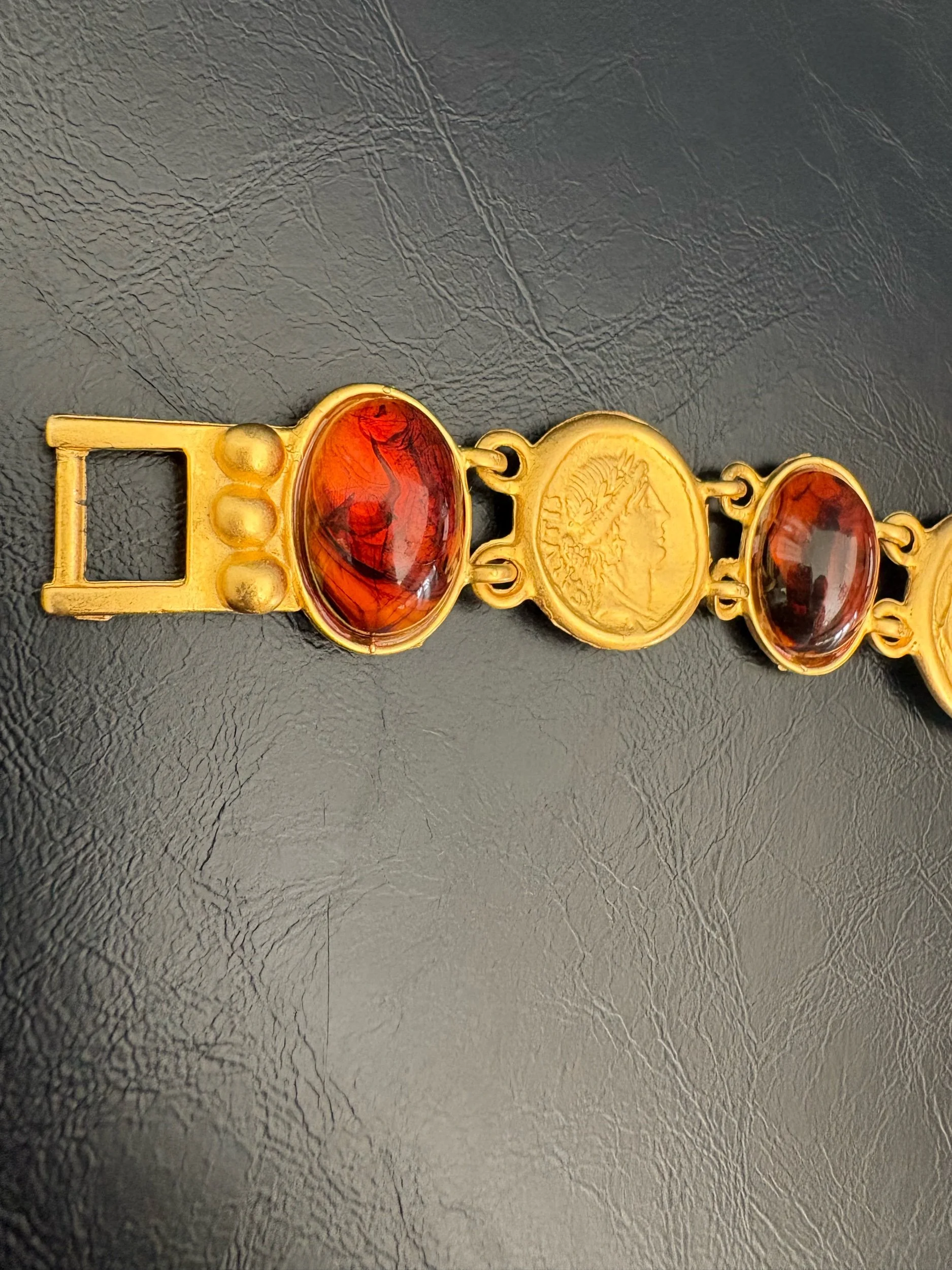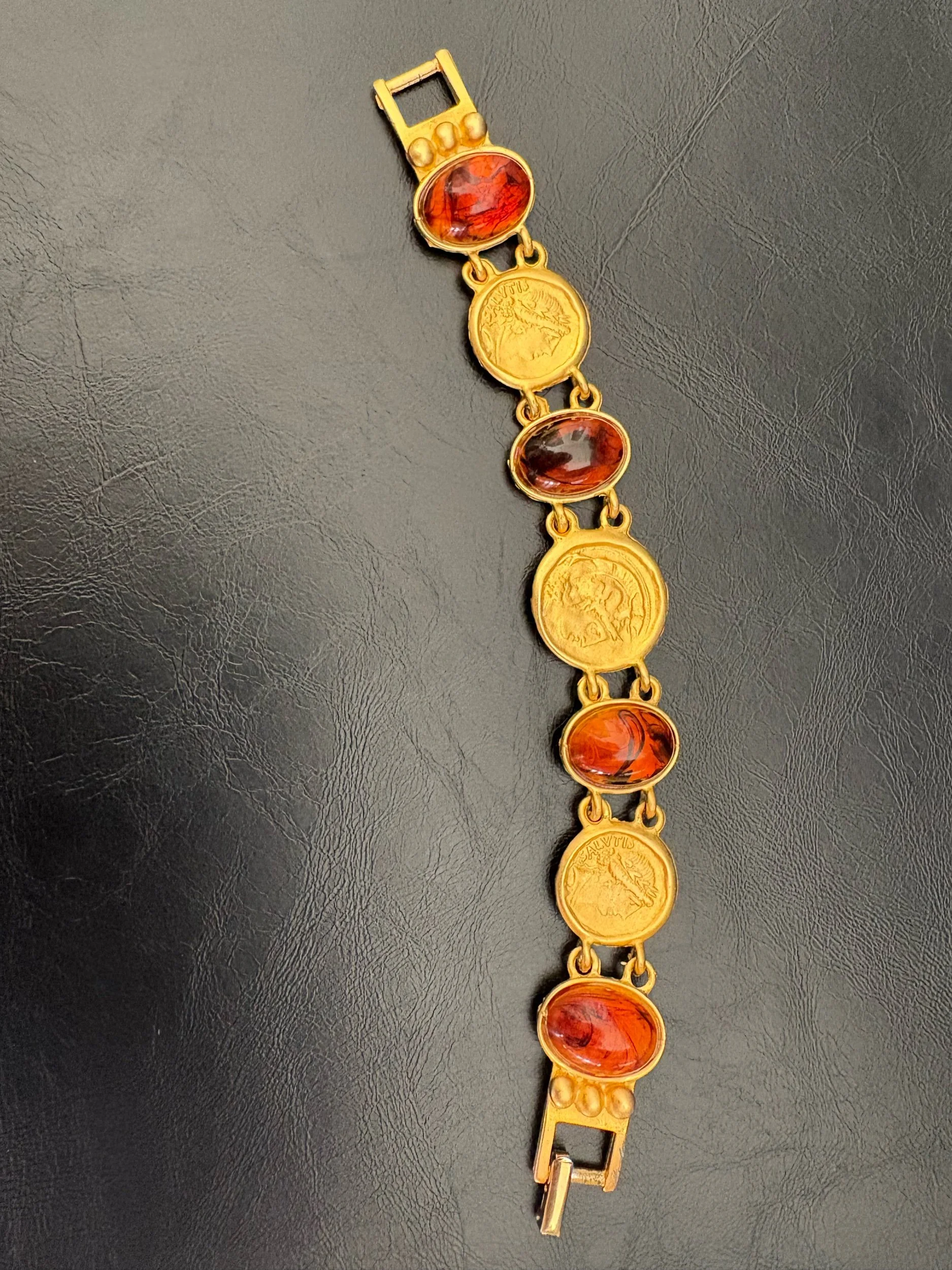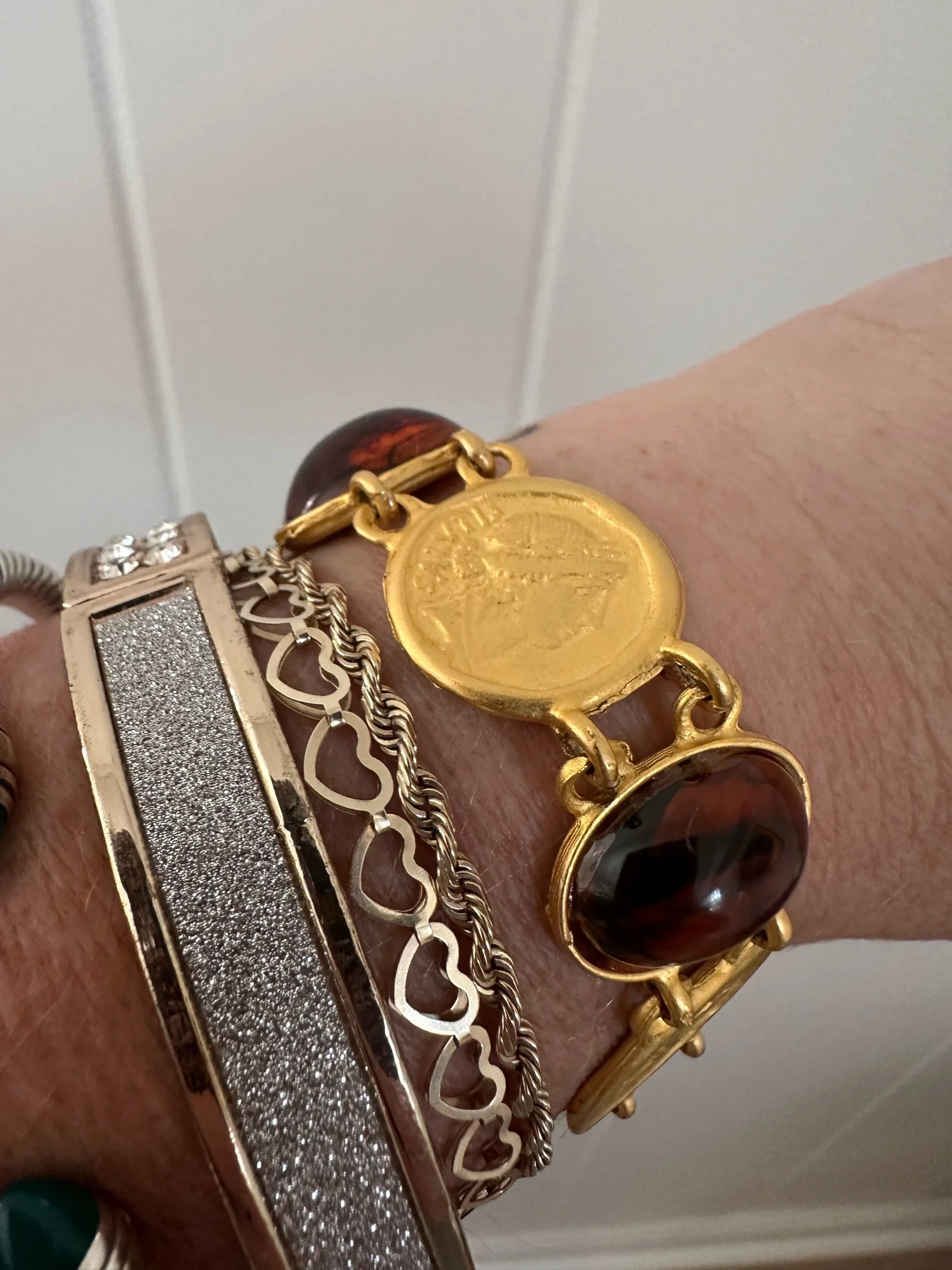 Beautiful matte gold multi coin bracelet. Large smoky amber stones. Fold over clasp. Unsigned.