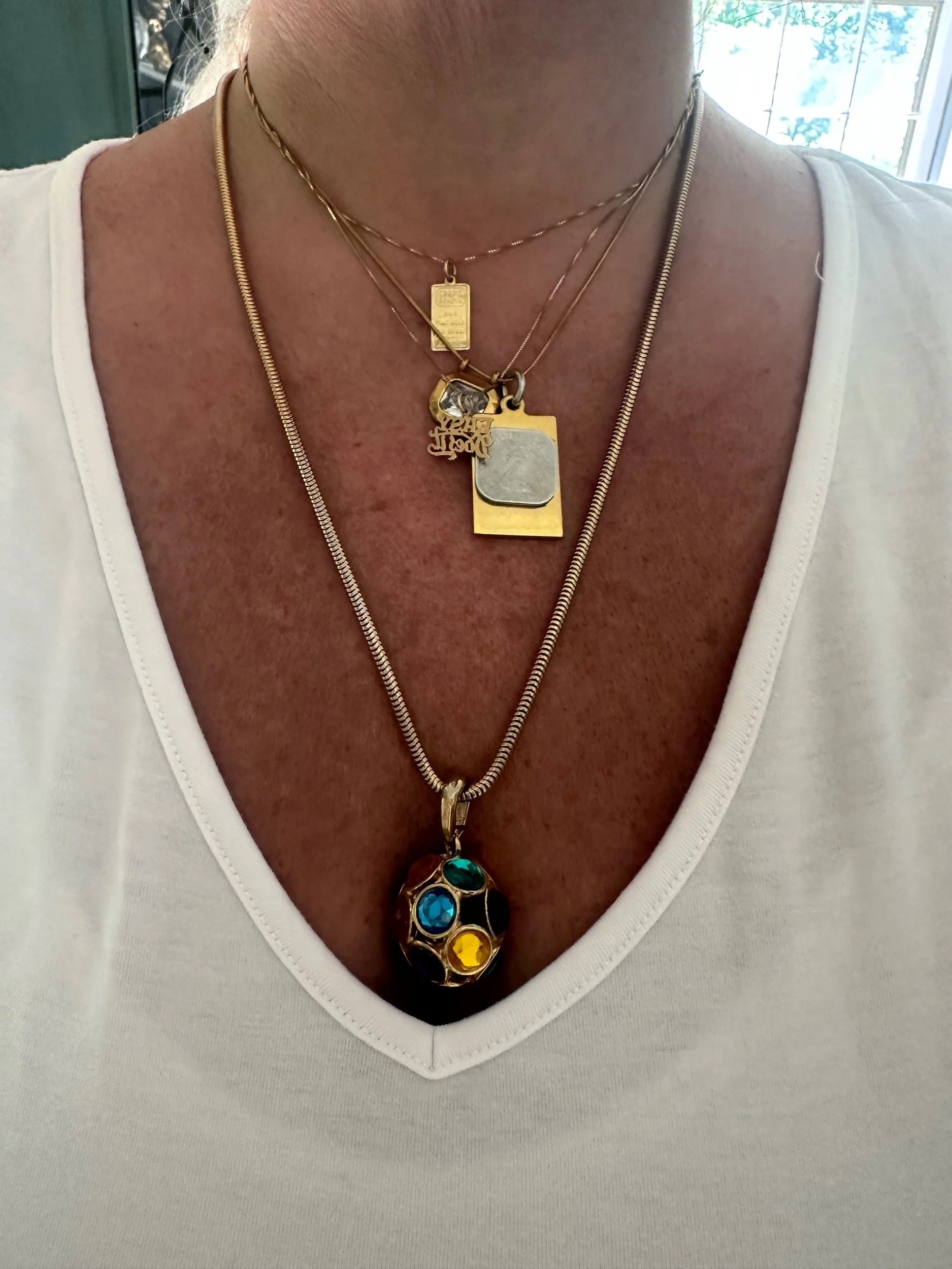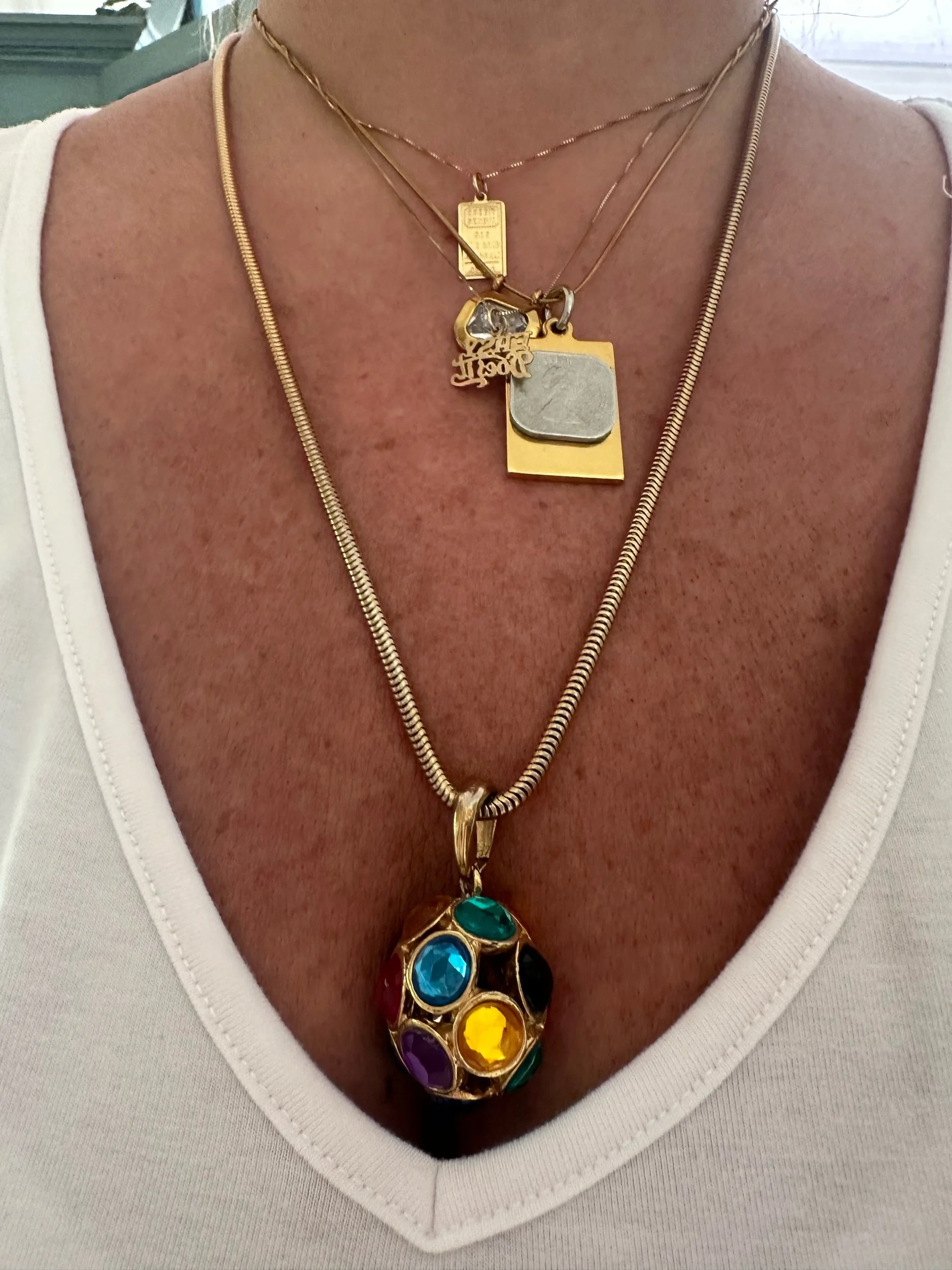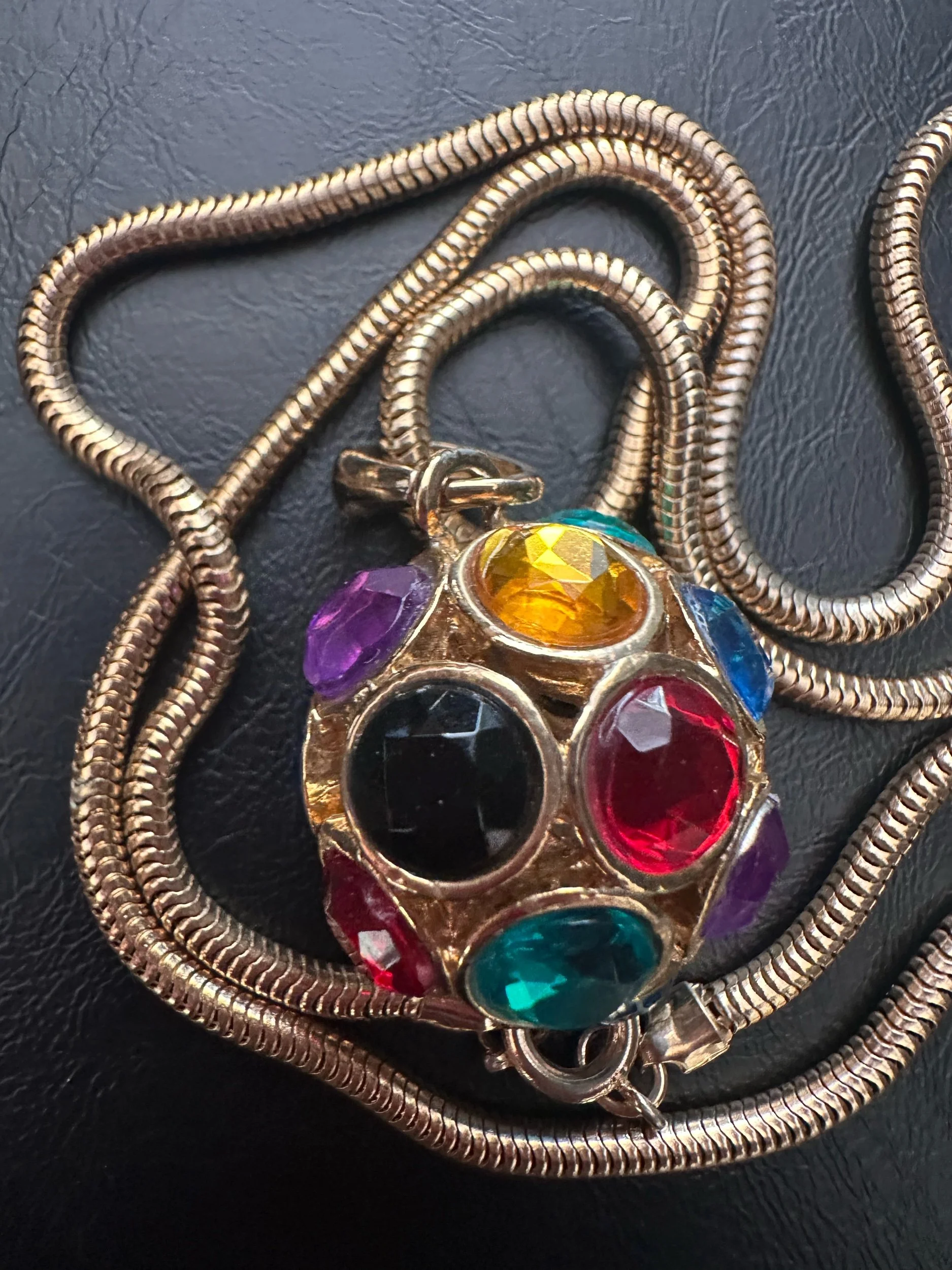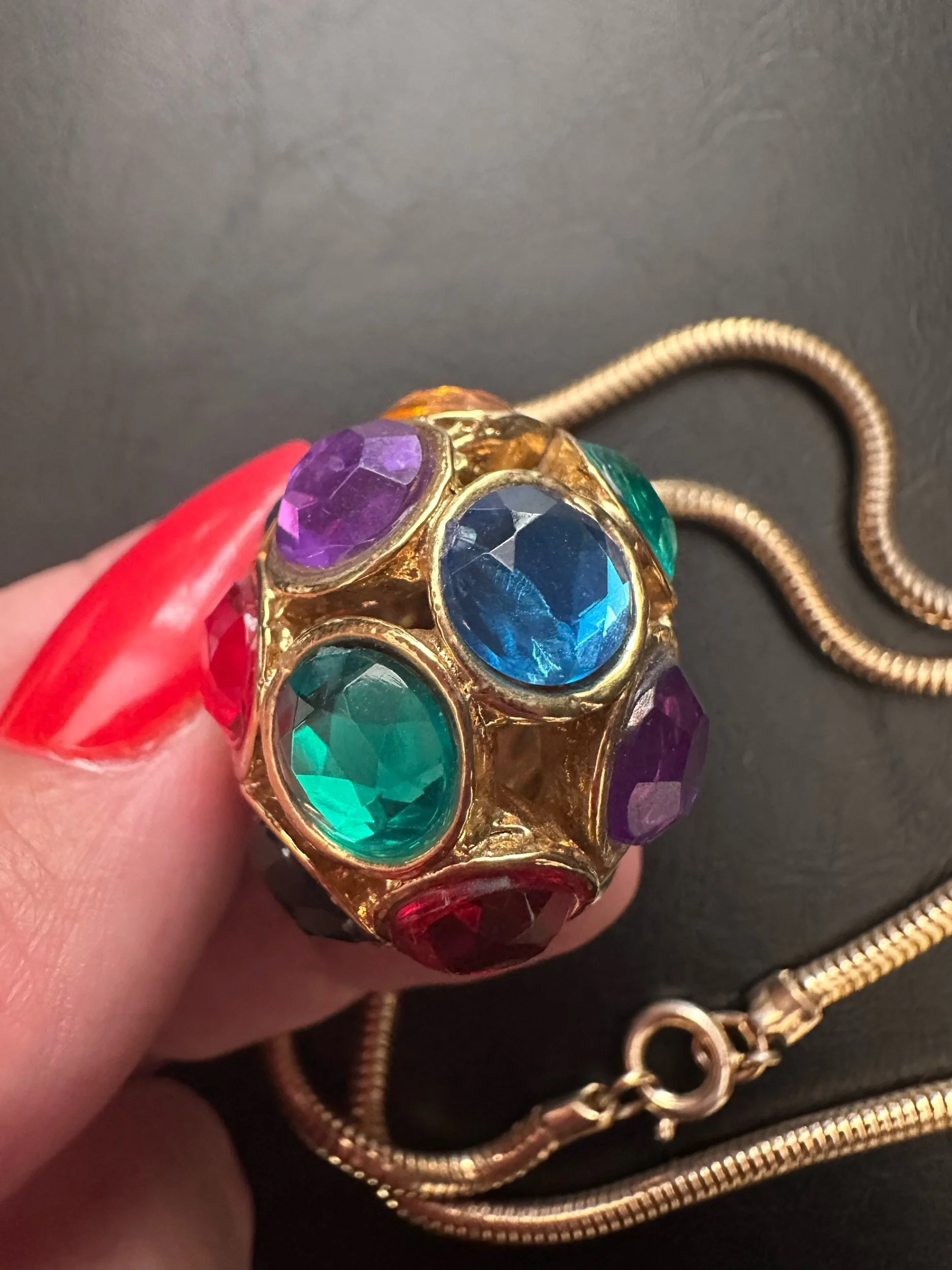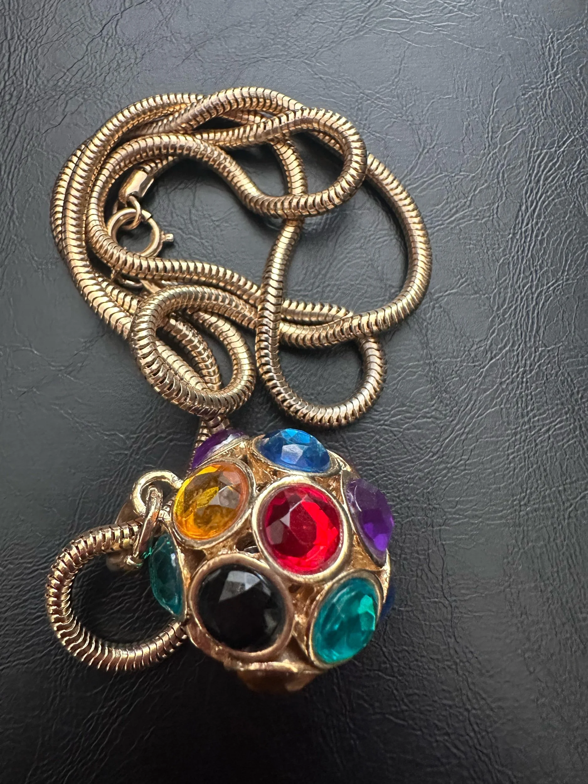 Colorful disco ball with a rainbow of gemstones. On long python chain with clasp. Wonderful condition. Large bail on disco pendant and can be put on other chains.