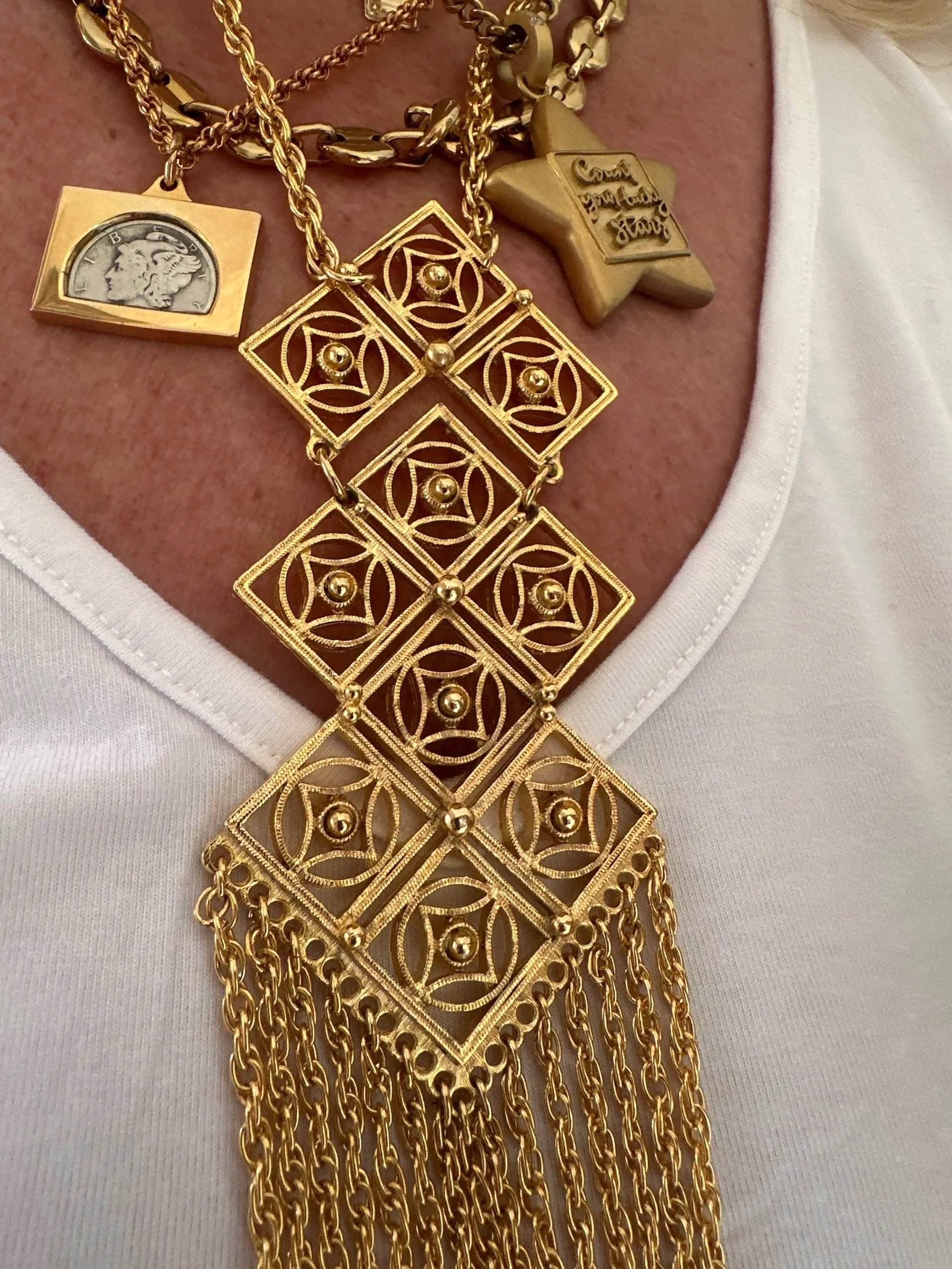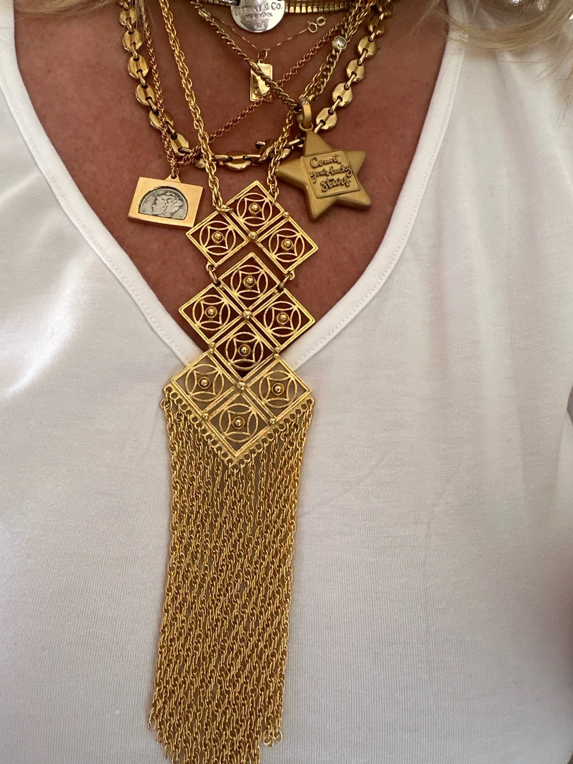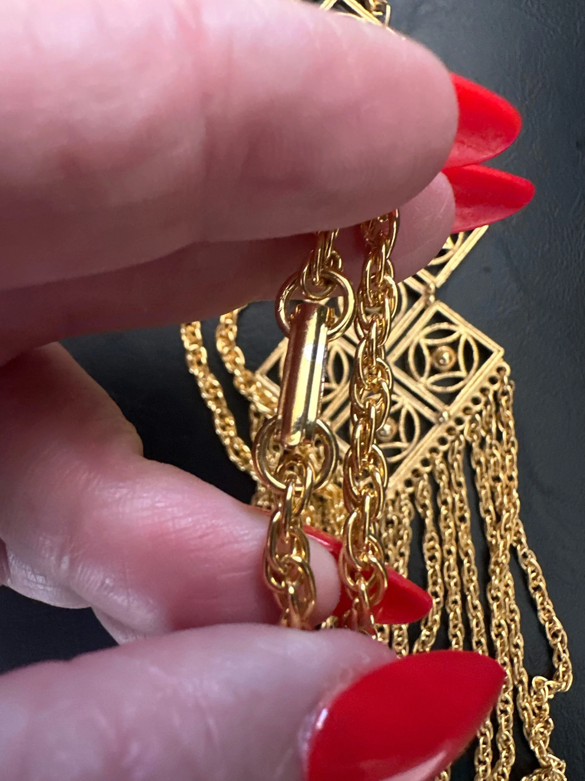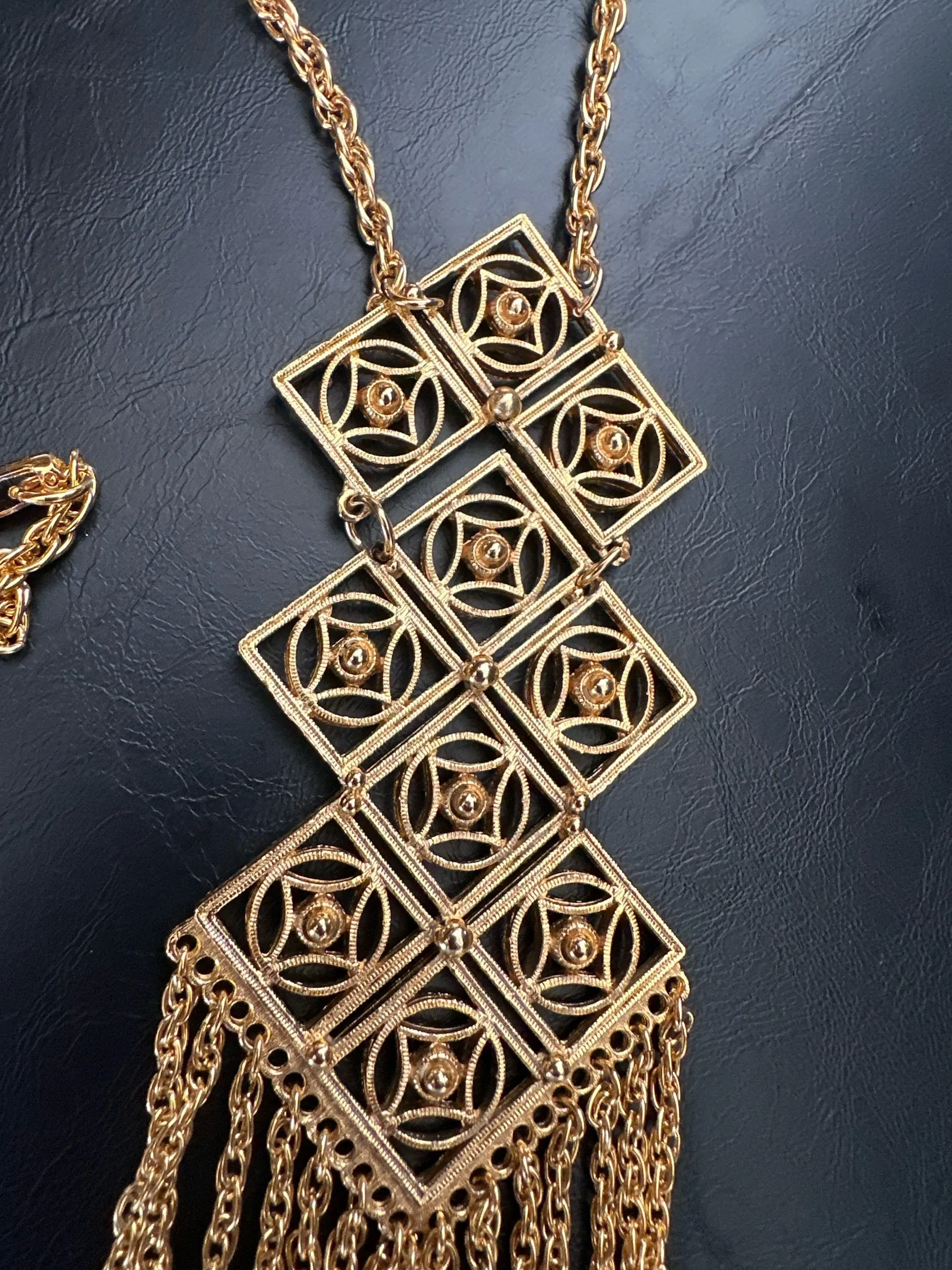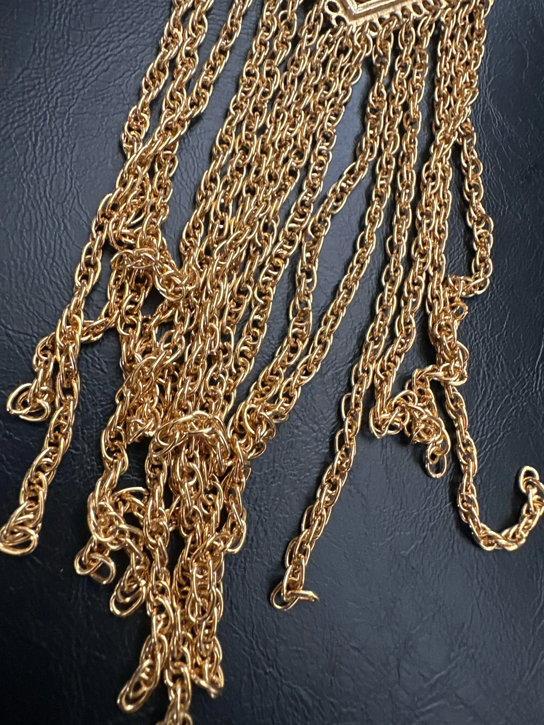 Beautiful geometric vintage necklace. Multiple strands of roped fringe. Looks like a tie on. In Mint condition. Fold over clasp.